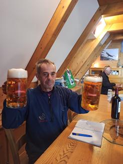 Humprey und Olaf gönnen sich ein Bier, die Bestellungen werden auf Bernd notiert. Während Lebhafter Unterhaltung gilt die Konzentration dem Bericht. Um 18.45 Uhr, geht die Sonne hinter dem Berg unter. Verharre bis Stuif mich zum Essen auffordert. Zuvor wird die Baustelle besichtigt. Teils mit schwerem Gerät wird ein Fels abgetragen, reichlich aufwendig bis das Fundament für den Sanitär Bereich steht. Nächste Woche wird Betoniert. Der Tisch 5 im Nebenzimmer ist für Urs und dessen Frau sowie für Bernd Reserviert. Im Eck findet sich eine Steckdose, zum Laden für das Handy. Als Vorspeise wird eine Linsen Erbsen Suppe in einem Topf serviert. Der Salat wird auf den _Tisch gestellt, warte geduldig bis die Älbler Maccarone (Kartoffeln Nudeln Speck und Creme fraiche) auf den Tisch gestellt werden. Die Portion und Geschmack gut, dennoch erhalten Humprey und ich noch einen Nachschlag.