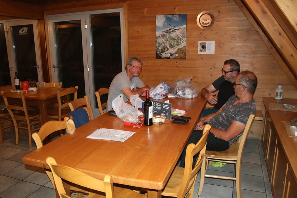Ein Raunen geht durch den Raum, etliche Gämsen tummeln sich am Grad des Fels, steigen Grazil auf. Ein Gang vor die Hütte für ein Foto unerlässlich. Es beginnt zu regnen, Fluchtartig rein in die gute Stube. Der Wind klatscht das Wasser gegen die Scheibe. Das Zeitfenster für den heutigen Wetterverlauf war für die Tourengeher maßgeschneidert. Als der Schauer durchgezogen ist, werden wir hinter von der Sonne verwöhnt WPO wechselt sogar die Seite am Tisch er wird derart geblendet. Gespenstisch wie die Wolken aus dem Tal aufziehen. Schaue mir den Winterraum im UG wo auch die Toiletten sind an. !2 Schlafplätze ein Tisch zwei Bänke sowie eine Spüle mit Wasserhahn. Morgen sollten sich die Launen des Wetters ändern. WPO Telefoniert mit der Heimat, Olaf wühlt sich in den Mobilen Daten während Stuif kein Netz finden. WPO reinigt mit einem Wattestäbchen die Kontakte von Kamera und Objektiv. Die Bedienung stellt dazu Spiritus zur Verfügung. Ein Erfolg stellt sich nicht bei jedem Knipsen ein, aber schon einmal ein Erfolg. Der Nachtisch ein Glas Apfelmus mit Sahne. Dezent die Gespräche 3 Bier und zwei 1dl Rot Wein. Für Humprey und Olaf. WPO das Kartenspiel ablehnt und ich schreibe, spielen die 3 Fick die Nut. Hole die Salzstängel von oben, das passt zum Getränk. Frage wegen der Hüttenruhe, wenn ihr euch ruhig verhaltet, könnt ihr selbstständig das Licht Löschen. Das Frühstück ist von 7-8 Uhr. Ein Hauch von Abstieg Morgen geht schon wieder die Profitour zur Ende ☹Ein letztes Bier für Stuif und mich Olaf noch nen Roten. Wir sollten doch bitte heute noch bezahlen. Olaf öffnet das Fenster, die kühle frische Luft belebt. Die Manner Waffeln und schwarze Schokolade wird nebenbei verspeist. Die letzte Karten Runde. Das Geschirr für das Frühstück wird an den Tischen verteilt. Bezahlen um 23.10 Uhr, 3 Bier und die HP 106 Sfr. 35 Sfr. Übernachtung 49 Sfr. Versorgung. Der ältere 100 Sfr. Schein von Humprey wird nicht akzeptiert.