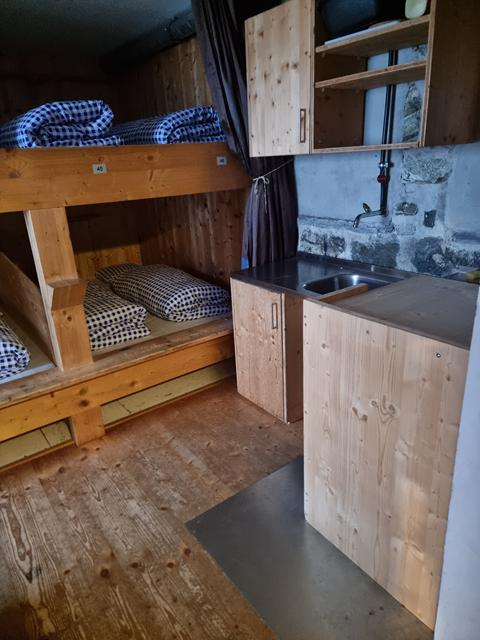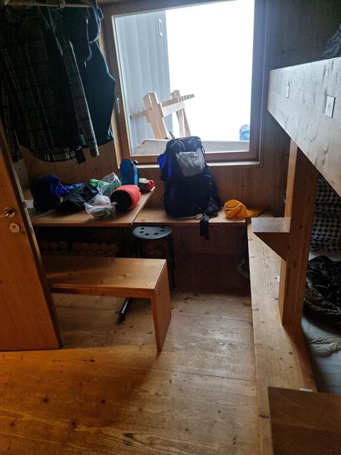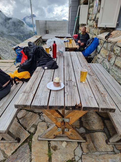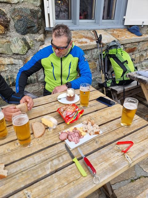 Wobei die Hütte relativ klein ist 39 Schlafplätze, jetzt wird klar warum die Pächter auf die Terri gewechselt sind, pro Jahr übernachten 2500 Gäste. es ist die höchste Hütte der Tour und liegt in der Fuorcla da Lavaz, auf 2524 m über Meer. 3 Große Tische auf der Südseite umgeben von einer Natursteinmauer. Ablegen des Gepäcks, im Trockenraum findet sich Elektrizität. Eine 4-Köpfige Familie ist mit Seil und Steigeisen und wohl Gurt und Seil on Tour. Es gibt wie auf den drei anderen Hüttenschuhe mit dem Unterschied das SAC Logo ist aufgedruckt. Woher kommt das Trinkwasser, wohl aus dem PE Schlauch der tiefer in einen Schacht führt. Olaf und Stuif erscheinen auf der anderen Seite des Grates, die Temperatur liegt um die 10 °C. Schnell sind die beiden eingewiesen. Stuif fackelt nicht, lange Organisiert eine Runde Bier, über eine Türe die der noch Junge Chef ihm öffnet, tritt er mit einem Bier auf die Terrasse das für Humprey angedacht ist. In kürze sstehe 5 Appenzeller Biere verteilt auf zwei Tische. Schneide Käse Wurst und Brot in Mundgerechte Stücke. Als Snack Salzbrezeln. Stuif gönnt sich einen Schokokuchen in einem Glas. Mit den kühlen Händen lässt es sich nur schwer schreiben. Verlockend der Geruch der wohl aus einem Backofen über die Lüftung austritt. Noch vor einer größeren Gruppe älterer Damen erreicht Humprey und WPO tief atmend ihr Ziel. Schnell legt sich ein Lächeln in ihr Gesicht. Viel zu schnell kühlt der Körper aus, in der Scharte zieht der Wind ungebremst durch. Humprey sitzt schon am Reservierten Tisch, daneben ein Dunkler Speckofen. Ein großes Panorama Fenster auf der West (Wetterseite). Stuif klärt das mit dem Lager. Piz Ault 1.Stock Nord, im Anbau ein Raum mit je 5 Betten übereinander, Stuif und ich wählen das obere Bett. Kleiderhacken an der Wand zum Zimmer daneben ideal zu Trocknen des Textil. Ein Blick in die anderen Zimmer begeistert, das ist alles vom Feinsten. Sehr schmal das Treppenhaus. Stuif bestellt ohne Absprache die zweite Runde. Die Hände sind angenehm warm Zeit zum Schreiben. Eine Familie und eine Familiäre Gruppe. Die Ladies in der Hellen Gaststube. Auch hier ist die Architektur gelungen. Unter dem Panoramafenster auf einer Platform eine PV Anlage, daneben eine Kläranlage. 18.30 Uhr. Die Teller stehen als erstes auf dem Tisch. Kurz danach Serviert das Personal eine Schüssel mit Brühe mit etwas gehackten Gemüse. Kein Nachschlag ist erforderlich. Blattsalat danach die Pizzocheri (Buchweizen Nudeln mit Wirsing und Kartoffeln), sehr Gewohnheits bedürftig. Nachschlag für Humprey Olaf und WPO. Kurz öffnet sich ein Großes Loch Richtung der Untergehenden Sonne.