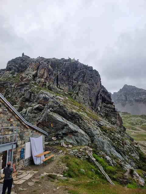 Das Hüttendach wird nun Sichtbar. Doch es Bedarf noch einer Passage wo Trittsicherheit gefragt ist, das passt WPO nicht ganz so. Große Tropfen fallen vom Himmel, jetzt ist es an der Zeit. Das Objektiv lösst nicht mehr aus, alle Tricks beheben nicht das Problem. (Zuhause habe ich nach Recherche ein Gebrauchtes gekauft, das Problem ist gelöst) Ein Hauch von Alpin Böcke und Steine erfordern die Aufmerksamkeit. An einer Metallbrücke endet die Anforderung. Etwas Südlich steigen Wanderer zur Scaletta ab. Der Weg mündet in den Hauptweg. Die Scaletta Hütte mit ihrem Auffällig steilen Dach wurde mit einem etwas tiefer stehenden Anbau, in Form eines Block wie die Motterascio erweitern. Zwei kleiner See hinter der Hütte, die Wolken hängen tief, verlieren Wasser in Form von Regen. Die Ansicht und näher kommen erfreut. Erstmal die Lage um die durch ihre Bauweise wohl einzigartige Hütte, auf 2205 m zu inspizieren. Auf der Südseite fällt des Gelände nicht zu steil ab, eine Schotter Straße endet am Materiallift des langgezogenen Val Camadra. Sichtbar Regnet es dort. Eine PV ist auf dem Dach Installiert. Hühner Gaggern in einem Umzäunten Areal. 4 Personen erreichen die Hütte. Wir reinigen die Schuhe an einer Installierten Bürsten Anlage. Der Vorraum führt zu Privaten Räumen, eine Treppe auch nach Oben. Wundern uns wo ist der Schuhraum WPO ergreift die Initiative frägt in der Gaststube nach dem Schuhraum, dieser ist über das WC erreichbar. Die Temperatur eher Frisch. Leider stehen keine Körbe zur Verfügung. Stellen das Gepäck vor den Eingang, Hell aber verwaist die Gaststube. Unüberhörbar beginnt es heftig zu regnen, spätestens jetzt war die Entscheidung gerechtfertigt Piz Greina ja oder Nein die richtige. Rechts im Anbau ist die Theke anschließend die Küche. Eine stabile Frau arbeitet in der Küche, warte geduldig bis sich eine jüngere Mitte 20 iger sich meiner annimmt. Wir sind 5 Personen der Gruppe Bernd Joos. SAC Mitglied? Nein DAV! Bitte das Hüttenbuch ausfüllen! Sie übergibt mir das Buch, übergebe es im Vorraum Olaf, der sich um unsere Anwesenheit annimmt. Nach dem das erledigt ist, führt Sie uns ein Stock höher. Das Lager unter dem Dach hat eine Kapazität von 10 Betten 5 Doppelstock. Die ersten auf der linken Seite sind uns zugeordnet. Sehr eng die Räumlichkeit. Olaf spekuliert mit einem Platz unter dem Dachspitz (5 Betten). Der Traum platzt, als Personen aus der großen Gruppe die auf der Terri Hütte eine Pause einlegte. Sie übergaben auf der Terri 6 Sellerie und 20 Kg Kartoffeln. Klatsch nass ihre Kleidung. Zeit nach unten zugehen. Humprey sitzt schon an einem Tisch mit 10 Stühlen, gelungen die Raumaufteilung in der Hellen Gaststube daneben die Große Balkontüre. Humprey lässt Wissen das 1 Liter Bier 10 Sfr. kostet, das glaube ich erst wenn ich das sehe, ein Blick in die Karte lässt das Herz höher schlagen. Selten so schnell an den Tresen, Frage die Bedienung ob es 1 Liter Bier gibt. Sie holt zwei Maß Krüge hält sie unter den Zapfhahn der die Form eines Geweih hat. Wollt ihr Nüssli? Ja sehr gerne! Ein staunen als die drei an den Tisch treten. Der Nachbar knipst und als ein jeder sein Maß erhalten hat. Top Arbeit, ein Steinbock wurde in die Große Tischplatte eingearbeitet, und mit einem Glasscheibe versehen. Ein Wlan Verbindung ohne Internet ist möglich. Windböen werfen den Regen gegen die Scheiben die Gebetsfahnen flattern bis Waagrecht im Wind. Auch dieser Tag verdient für den Bericht an Bedeutung. Wohl dem der bei solchen Bedingungen das Ziel erreicht, dementsprechend locker und gut die Stimmung unter den Gästen, bis zur Essensausgabe ist die Gaststube gut belegt. Trotz aller Widrigkeiten öffnet sich immer wieder mal ein Blick in das Tal. Stuif übermittelt die Daten zum Tag. Die Garmin Watch, mehr als nur Navigation, ein wichtiger Begleiter. Eine Bunte Salatschüssel wird um 19.10 Uhr, an den Tischen von 2 Bedienungen gestellt. Geben noch Gurke und Tomate dazu. Stuif bevorzugt nicht unbedingt Blattsalat.
