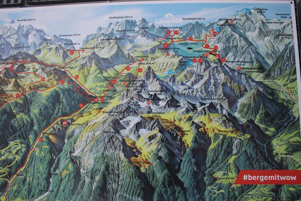 Fahrt nach Brand Vorarlberg bis zum Parkplatz der Lünersee Bahn 1568 m. 220 Km 3 Std..