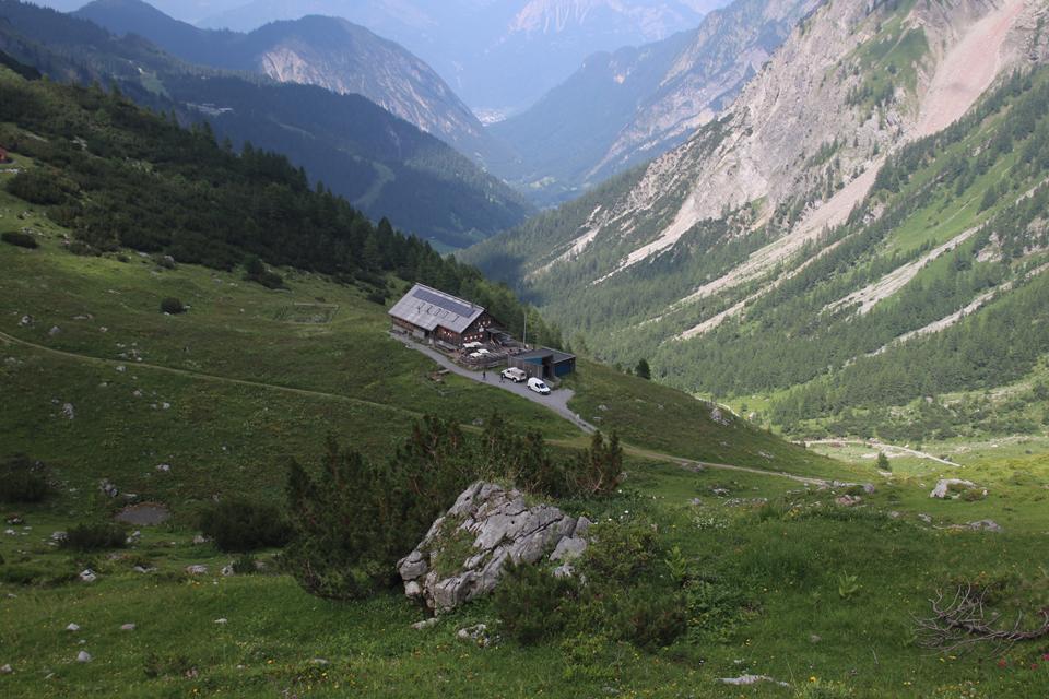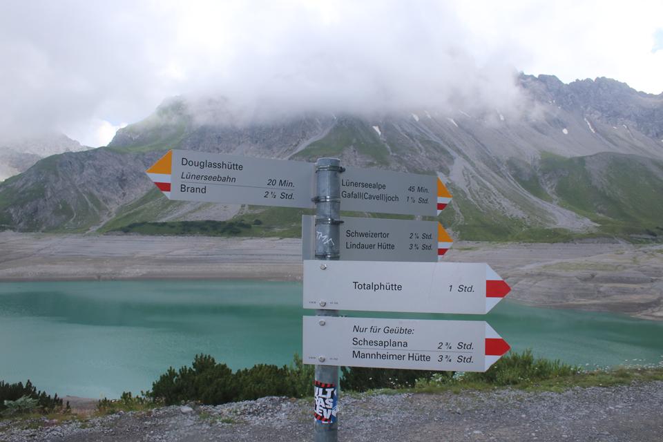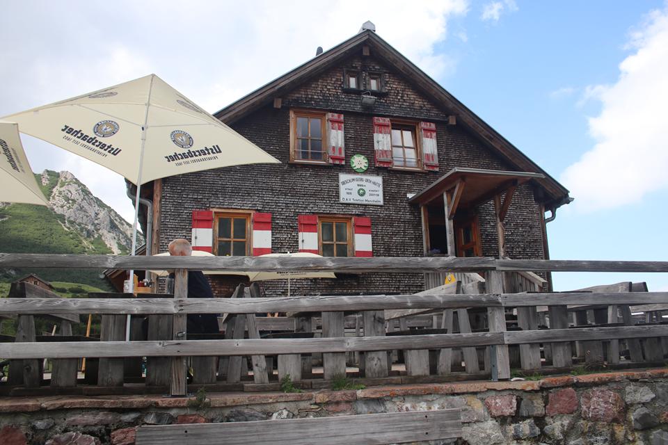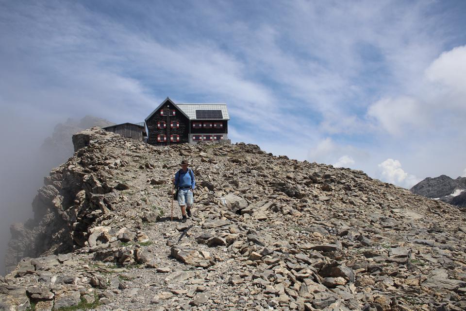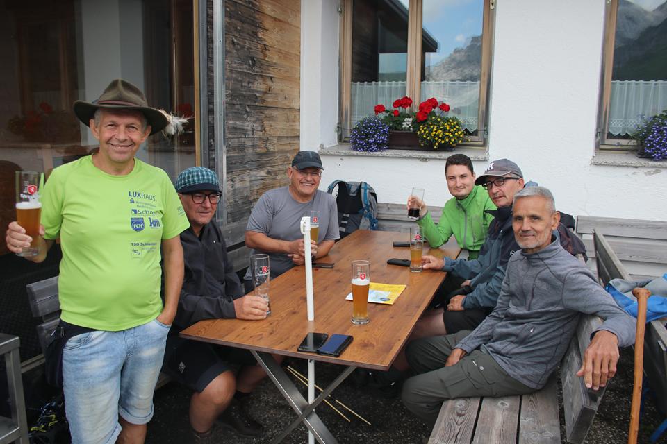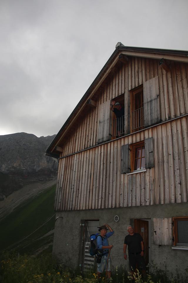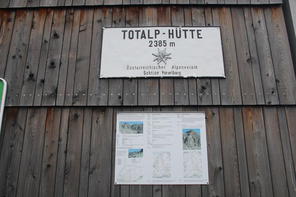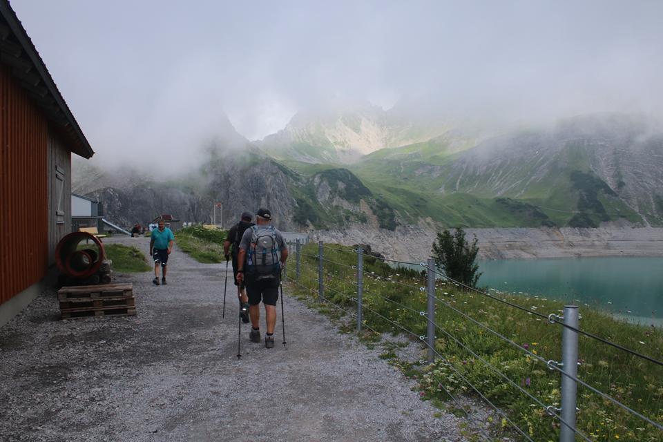 Mane und ich folgen gleich danach, 16.05 Uhr, stehen auch wir auf. Die Hütte liegt verdeckt im Westen. Die Gipfel allesamt von Wolken eingehüllt. Ein Guter wohl viel begangener Weg führt am Nördlicher See Ufer entlang das Gelände doch relativ steil. Angenehm die Temperatur zum Laufen, der Rucksack Spürbar. Auch auf der Gegenüberliegenden Seite verläuft eine Straße. Das Seil der Materialseilbahn lässt sich erkennen. Flott der Schritt ja Mane ist viel mit dem Rad Unterwegs, meine Vorbereitung mit dem Rennrad wird sich in der Berg Saison beweisen. Die Vorrausgehenden werden in einem steiler Gelände nach und nach erreicht, etwas später Bodo und Ali. Mauri und Ali sind mit Teleskopstöcken Unterwegs während Mane einen Wanderstock einsetzt. Wolken von Westen ziehen über die Köpfe. Für Bodo ist es nach bald 2 Jahren die Premiere, wie verhält sich der Körper bei diesem Auftakt? Mauri, bindet sich ein kleines blaues Handtuch an der Brust des Rucksack Riemen. Nach dem vor kurzem der Schnee gewichen ist, überrascht das saftig grüne Gras, Bunte Pflanzen sorgen für angenehme Farb Tupfer. Gute Wegabscheider verkürzen die Strecke. Wanderer sind im Abstieg. Das Helle Verschindelte Gebäude wird auf einem Plateau Sichtbar, die Hütte liegt unter dem Zirmenkopf 2760 m. Rechts unterhalb liegt in einer Senke der Totalpsee. In einem Bogen unter dem Materiallift vorbei, wird das Gebäude um 17.10 Uhr erreicht. Verteilt auf einer Ebene warten Bier Garnituren auf die Wanderer, nur wenige Gäste halten sich im Freien auf 2385 m auf. Nachvollziehbar es ist etwas Frisch. Laut Mane benötigten wir für weitere 400 Höhenmeter 1.Std. 2 Minuten. Verschwitzt ist es angebracht in das Innere zu wechseln, ein Großer Eingangsbereich mit Sitzbank und Schuhregal. Sofort wird klar es ist ein Moderner Holzbau der Sektion Vorarlberg. Die Kameraden treffen ein. Einweisung in der Hellen Gaststuben, an der offenen Theke zur Küche, die Chefin Persönlich zeigt dabei Humor, der erste Eindruck absolut positiv.
