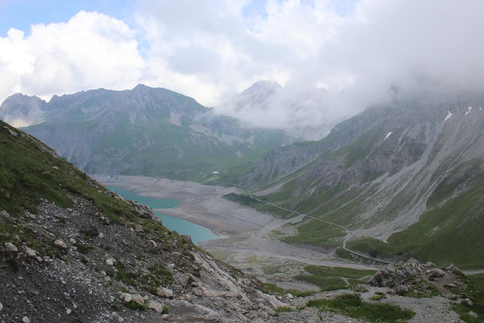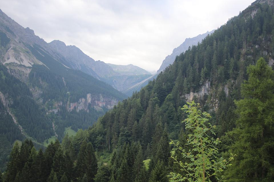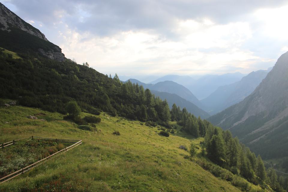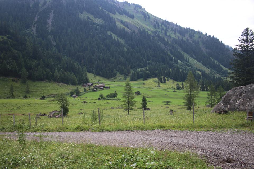 Es ist bewölkt ohne Nebel die Sicht in Ordnung bei ca.10°C. Folgen dem empfohlenen Weg der am Hinterausgang startet folgen nicht der Straße, auf diese Treffen wir später. Langezogen das Zalimtal das von hier einsehbar ist. Frisch und Munter, dementsprechend unser Schritt. Abstieg in einer Kehre über die Alm Wiese, Unterhalten uns sehr flüssig. Langatmiger Abstieg über die Schotterstraße. Das erste Mal auf dieser Tour haben wir es mit Kühe und Milchvieh zu tun. Wir unterhalten uns so Intensiv das wir die Umwelt nur wenig wahrnehmen. Eine sehr große Alm links, Weidezäune Grenzen den Bereich ab. Landschaftlich ein schönes Tal. Es wird steiler zunehmend mehr Baumbestand. Ein Rettungsfahrzeug der Bergwache parkt an einem Bach, stauen darüber das eine Kiste Bier im Wasser steht, Rätseln warum. Ein Pavillon rechts des Weges, fragen uns, was hier wohl geschieht. Es ist ein Bunter Versorgungsstand sicherlich nicht für Wanderer, wohl für einen Lauf, allerlei Getränke Nüsse und Nahrhaftes. Etwas weiter ein zweiter Stand, hier erfahren wir mehr über den Alpin8 Everesting Event. 17 Mal gilt es die Strecke von der Talstation zur Bergstation der Palüdbahn das sind je 530 Hm. zu bewältigen Start war Gestern um 5 Uhr, 220 Teilnehmer versuchen die Höhe des Everest im Aufstieg unter 34 Stunden zu schaffen, Bergab geht es mit der Bahn die Rund um die Uhr fährt.