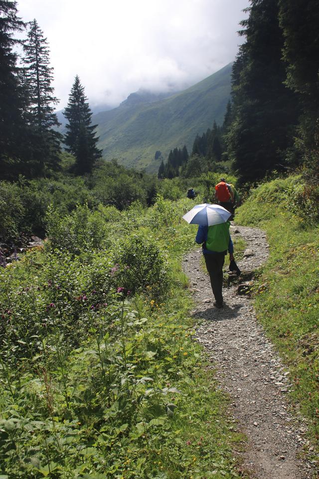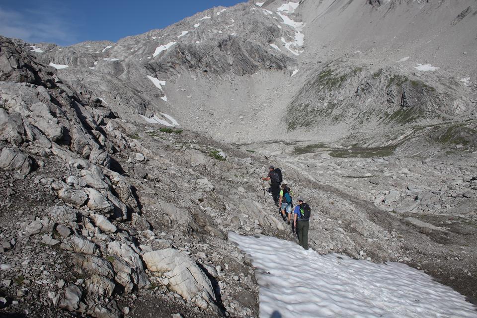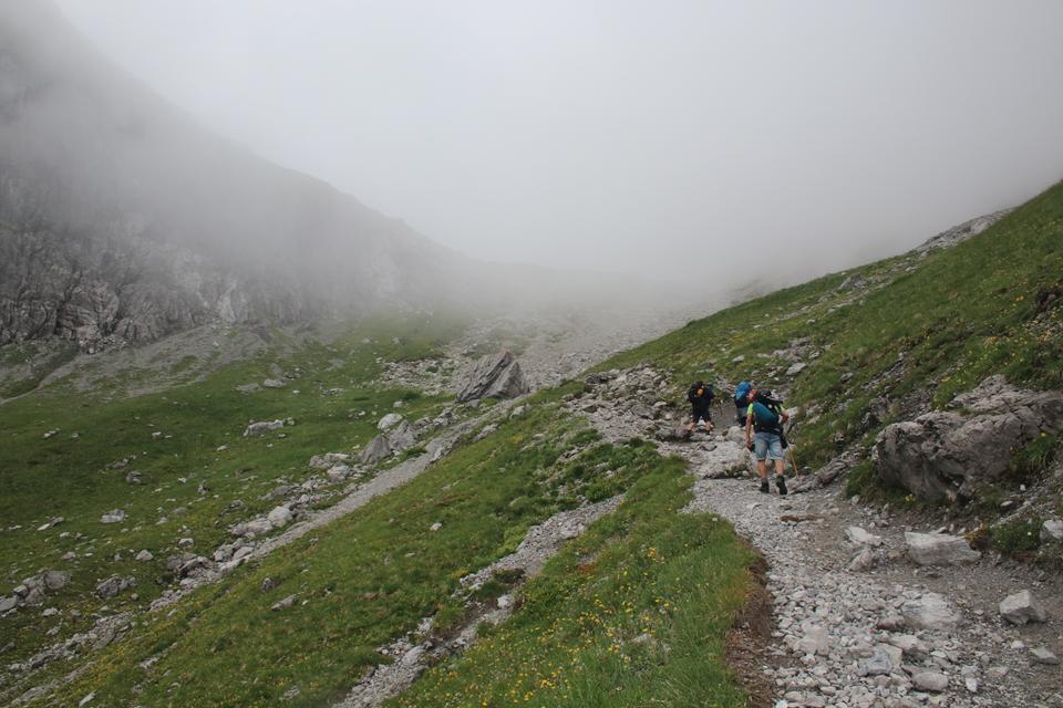 Ankunft am Großen Parkplatz der Lünerseebahn, es ist 13 Uhr, da passt ganz gut, Ziel sollte es sein um 17 Uhr, die Totalp Hütte zu erreichen. Relativ viele Fahrzeuge Parken nahe dem Zustieg, die Bahn Fährt, die Seile verschwinden weit vor der Bergstation in Wolken. Durch das Diffuse Licht ist es ganz angenehm. Rund um das Auto wird gepackt. Ali unser Chauffeur hatte seine Aufgabe mit Bravour bewerkstelligt. Ein Linienbus Fährt vor. Nach wenigen Minuten steht Mane bereit, er kennt wohl noch nicht die Gepflogenheit, vor dem Start und während des Packens ist ein Bierchen Obligatorisch. Gut gekühlt das zuvor gekaufte Fahrenberg Bier. Kleines Vesper. Mauri Humprey und Mane stoßen mit einem Bier auf die nächsten 4 Tage an. Wiegen des Gepäcks, Ali bürdet sich 14 Kg auf, sicherlich 4 Kg zu viel, allein der Wassersack wohl 2 Kg. Verteile das Halbsteigeisen und das Grödel, Ali möchte die Halbsteigeisen, Mane bleiben die Grödel. Ali Bodo und Flori starten, während Mane und Humprey das mit dem nahen Parkautomat abklären. 4 € für 24 Std. Etwas Kleingeld hat ein jeder im Portemonnaie. Mit dem ausschalten des Kühlschrank, starten wir um 14 Uhr. Ein Blick auf den Busfahrplan, Sonntag werden wir nach dem Abstieg in Brand die Straße erreichen, damit nicht alle den Bus nehmen, werde ich das Auto holen. Gute Wegführung anfangs durch Latschen Bewuchs das Gelände steigt relativ gleichmäßig Anfangs Nördlich an. Viel begangen Mauri und Humprey sind Flott Unterwegs. Absteigende begegnen, In Serpentinen Westlich unter dem Seekopf. Die Richtung wechselt in die Spannend aussehende Flanke., diese entpuppt sich als doch wenig spannend, das liegt nicht an den Seilversicherten Stellen.