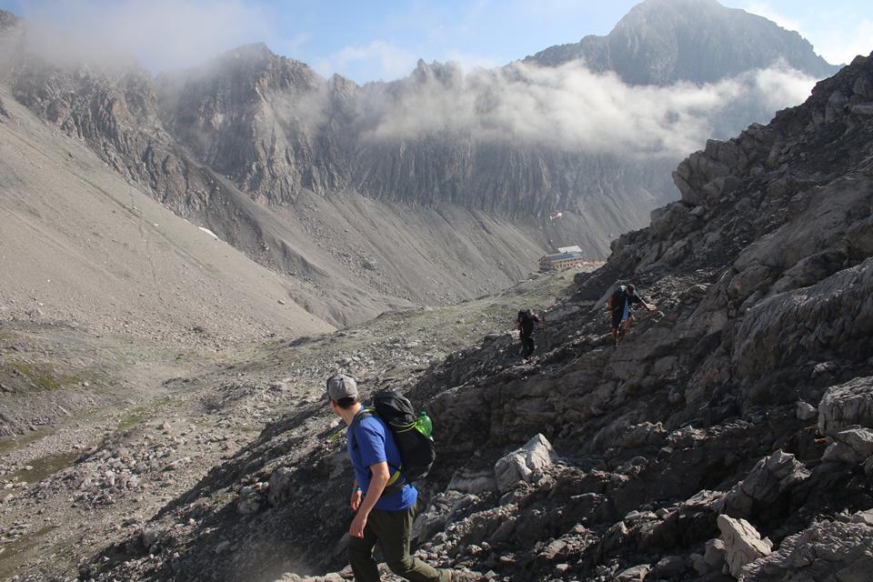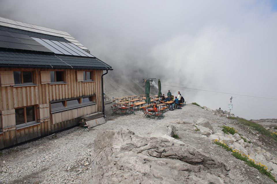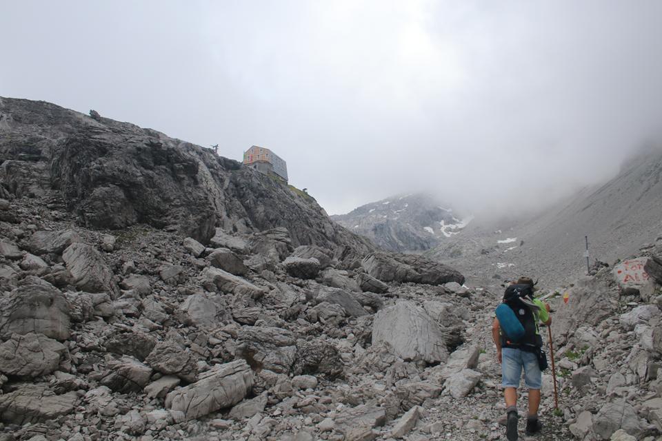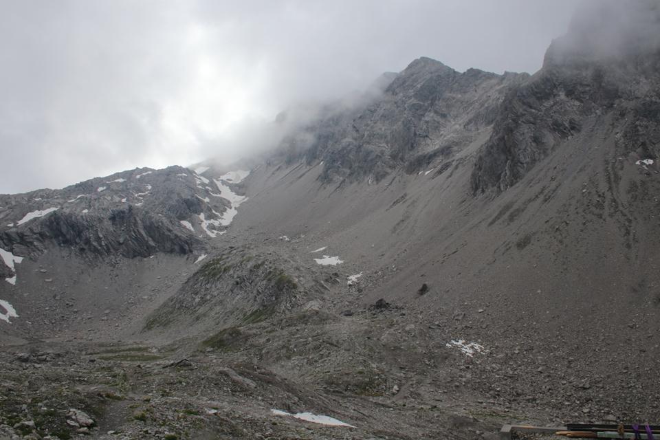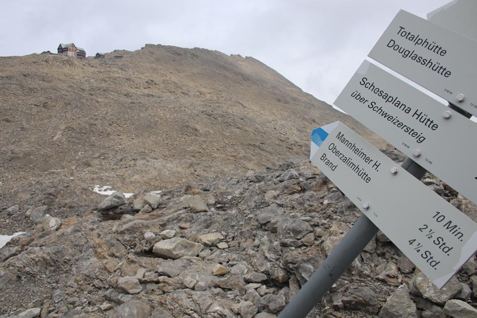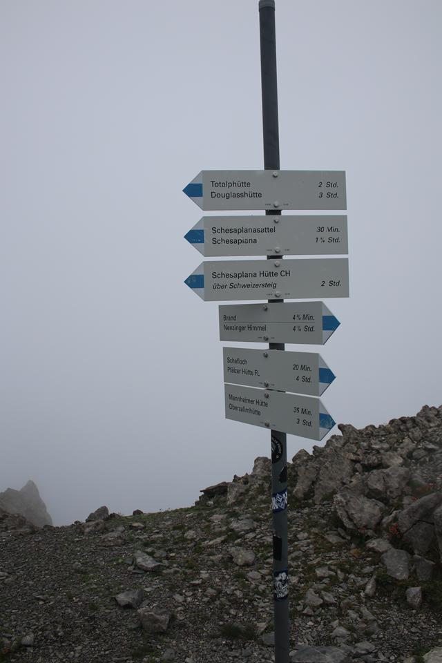 Wir versammeln uns vor der Hütte an den Garnituren. Bodo und Ali sind um 8.25 Uhr Startklar. Die Sonne setzt sich sehr zur Freude durch. Um die Hütte ist Allgemeine Aufbruchstimmung. Ein Heli fliegt ein, setzt Nahe der Hütte zur Landung an, ganz schön Wind was er da erzeugt. Personen entsteigen dem Flug Gerät. Ein Seil wird montiert, etwas später hängt ein Materialsack am Hacken. 8.35 Uhr, beginnt auch für uns die Tagesetappe durch die Stein Wüste. Wenig Markiert, etwas Orientierung ist von Nöten. Nebelschwaden ziehen durch, gleich ist es Feucht und kühler. Die Route lässt sich ganz und gar nicht erahnen. Leicht Ansteigend das Gelände, Mane ist der Pacemaker. 2 Std. bis zum Gipfel der Schesaplana bei knapp 600 Meter Aufstieg, bis zur Mannheimer sind es 3 Stunden.