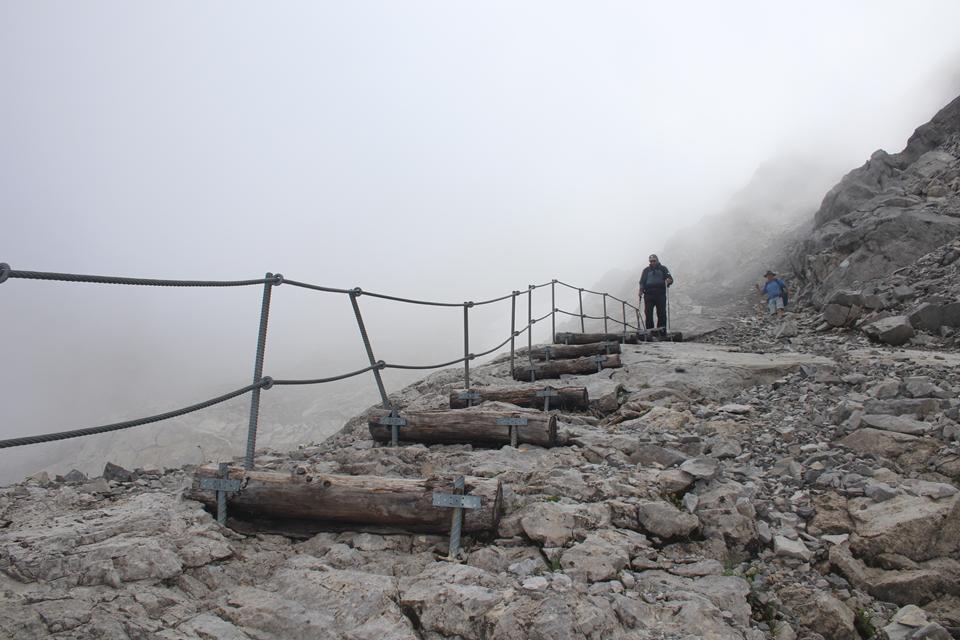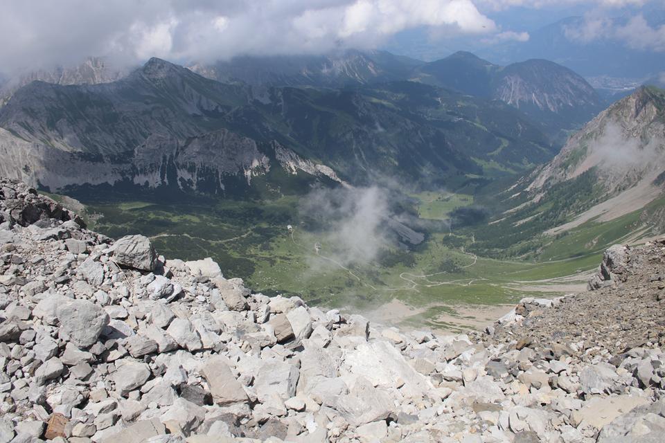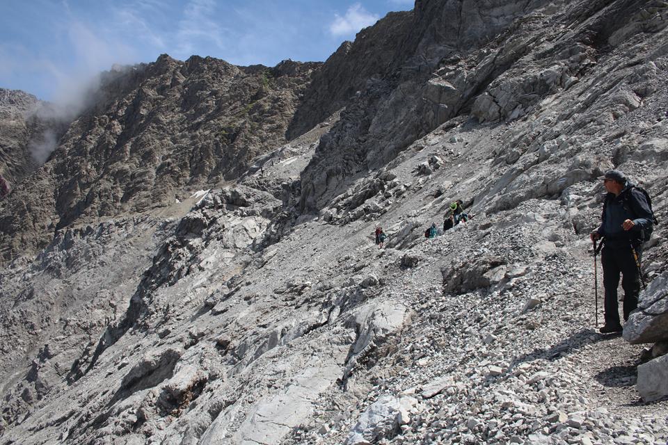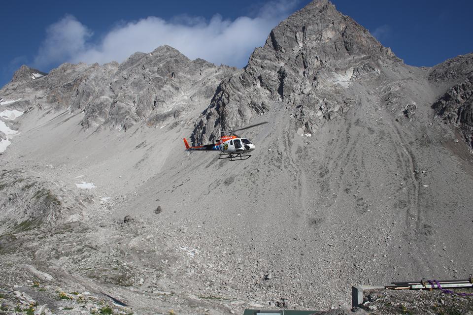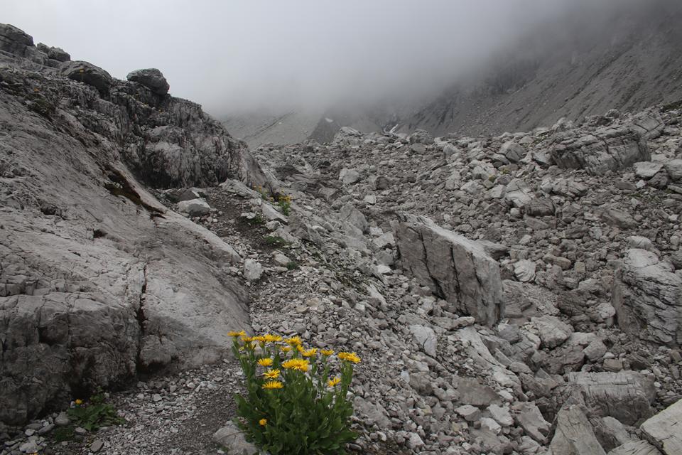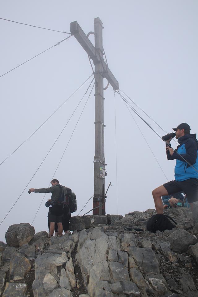 Wir versammeln uns vor der Hütte an den Garnituren. Bodo und Ali sind um 8.25 Uhr Startklar. Die Sonne setzt sich sehr zur Freude durch. Um die Hütte ist Allgemeine Aufbruchstimmung. Ein Heli fliegt ein, setzt Nahe der Hütte zur Landung an, ganz schön Wind was er da erzeugt. Personen entsteigen dem Flug Gerät. Ein Seil wird montiert, etwas später hängt ein Materialsack am Hacken. 8.35 Uhr, beginnt auch für uns die Tagesetappe durch die Stein Wüste. Wenig Markiert, etwas Orientierung ist von Nöten. Nebelschwaden ziehen durch, gleich ist es Feucht und kühler. Die Route lässt sich ganz und gar nicht erahnen. Leicht Ansteigend das Gelände, Mane ist der Pacemaker. 2 Std. bis zum Gipfel der Schesaplana bei knapp 600 Meter Aufstieg, bis zur Mannheimer sind es 3 Stunden.