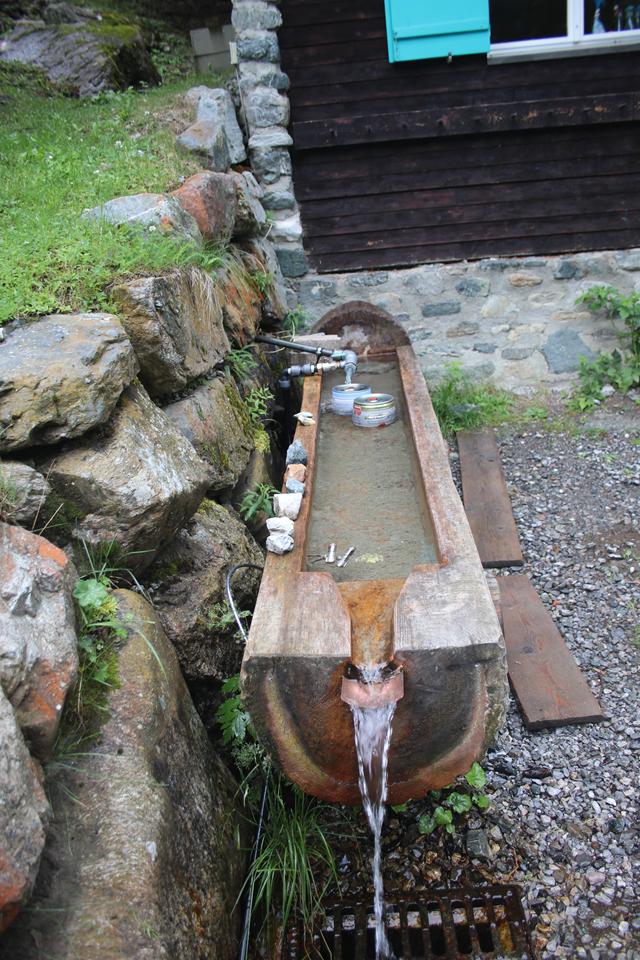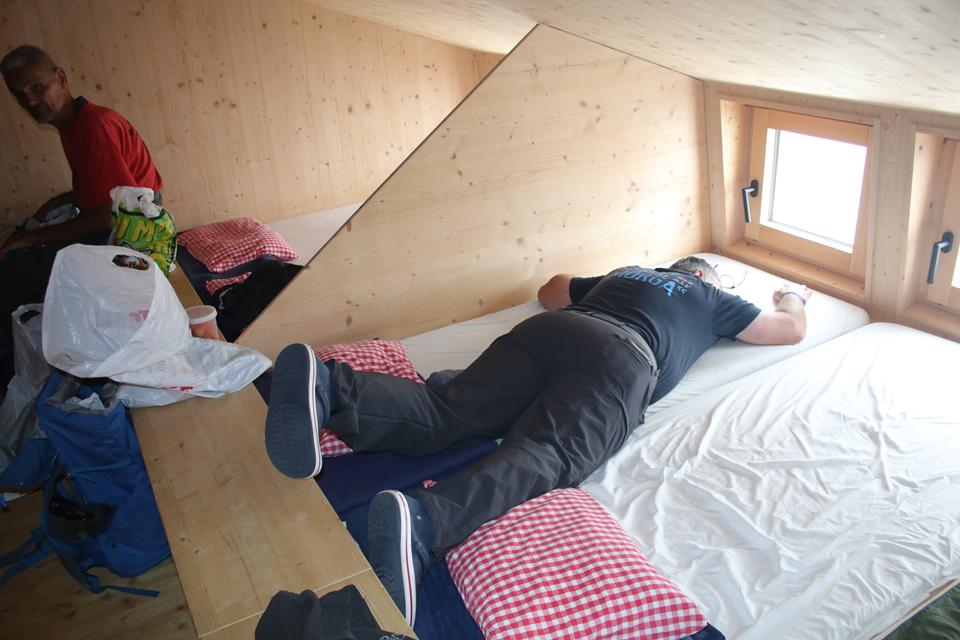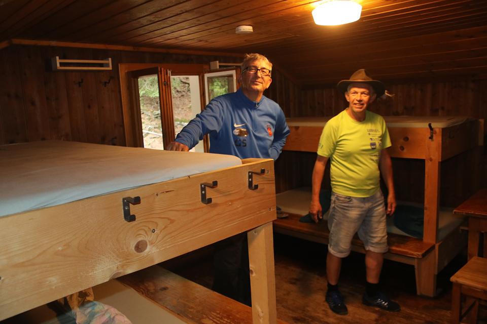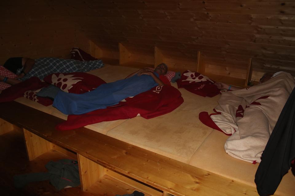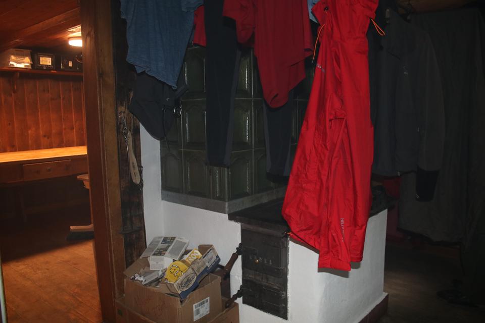 Links Vorne ist der Waschraum mit Spüle. Im nächsten Raum befindet sich ein zweiter Waschraum, auch hier ist ein kleiner Separater Raum mit Toilette, dick Isoliert die Wasserleitung die Aufputz verläuft. Eine Holz Treppe führt nach oben. Bodo und Humprey schauen sich auch die 4 Zimmer unter dem Dach an, unterschiedlich die Raum Größe und Aufteilung der 10 Doppelstock Betten. Wählen die zwei kleinen Räume Westlich mit je 4 Betten. Rechts der Gastraum mit dem Kacheloffen, verbunden mit der Küche, auch dort steht ein sehr Großer Massiver Holztisch. Die Gruppe Hetzler hat über dem Ofen Wäsche aufgehängt. Der Große Tisch im Gastraum biete sich für eine große Gruppe an, in diesem Fall haben wir das Privileg. Die Regenjacken hängen wir in das Freie unter dem Vordach. Erstmal den Inhalt des Rucksack aufteilen, die Getränke gleich in den Brunnen, 2 Fässer stehen schon im kalten Wasser. Schnell sind wir Heimisch.Vergeben die Betten. Decken und Kissen liegen im