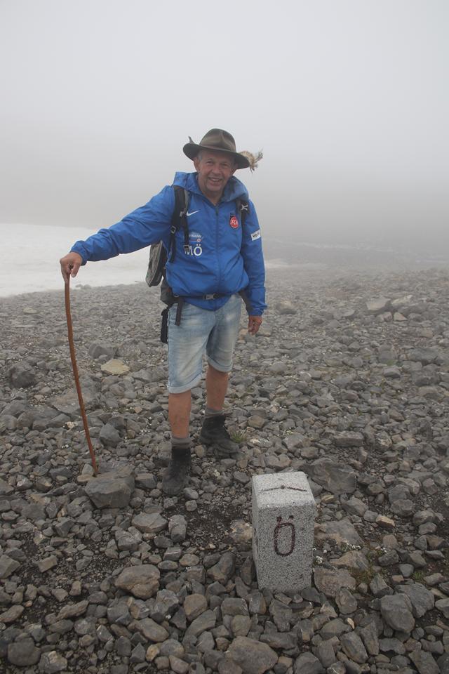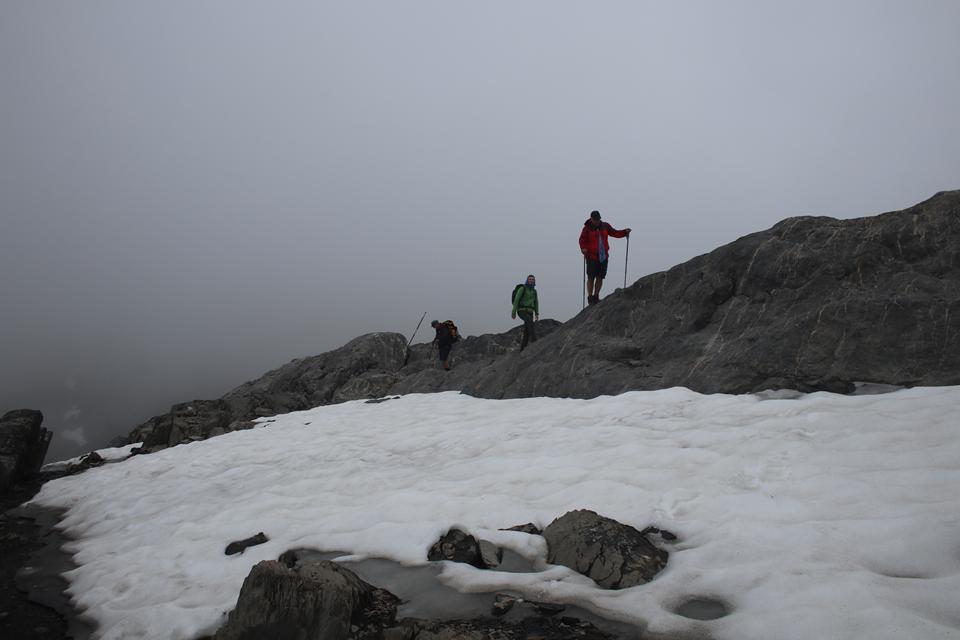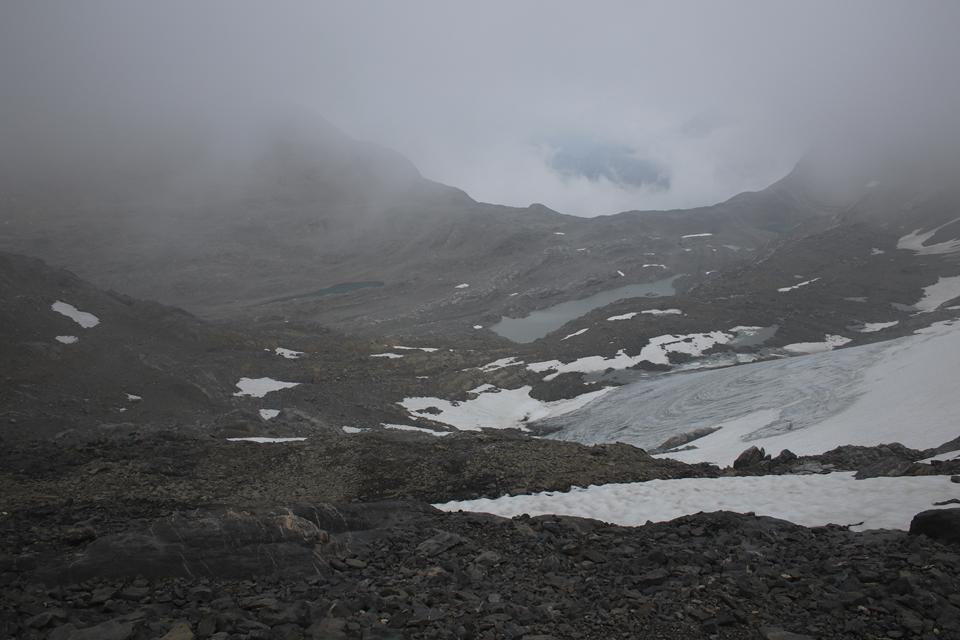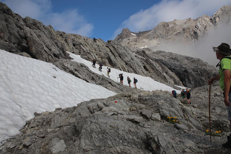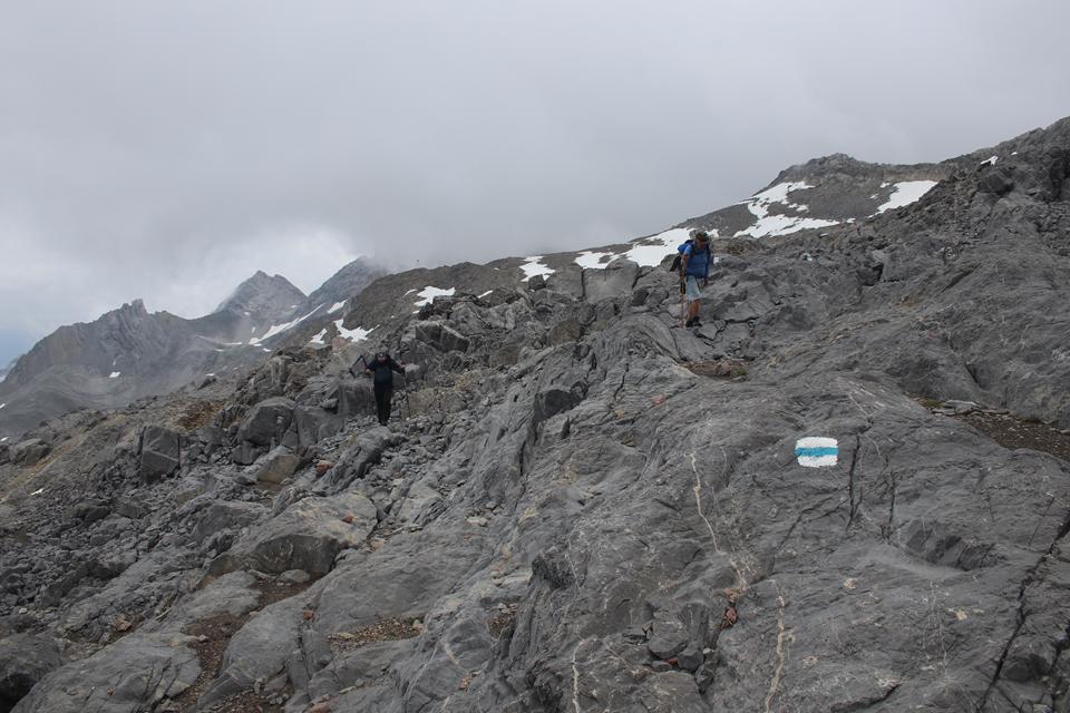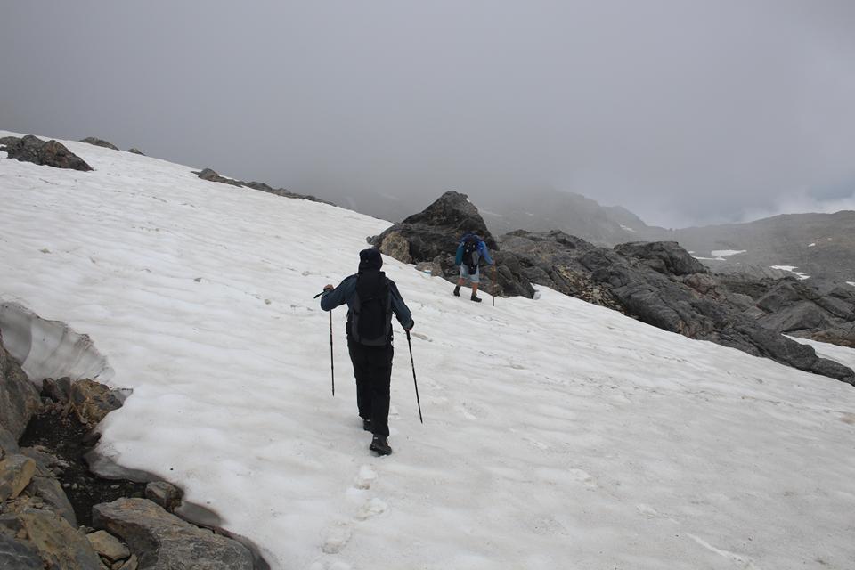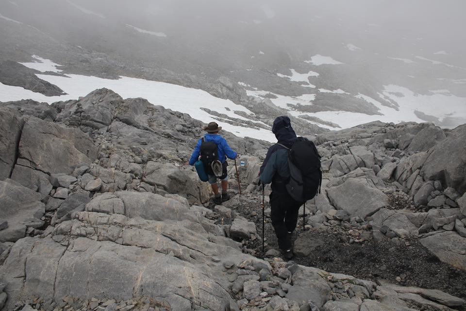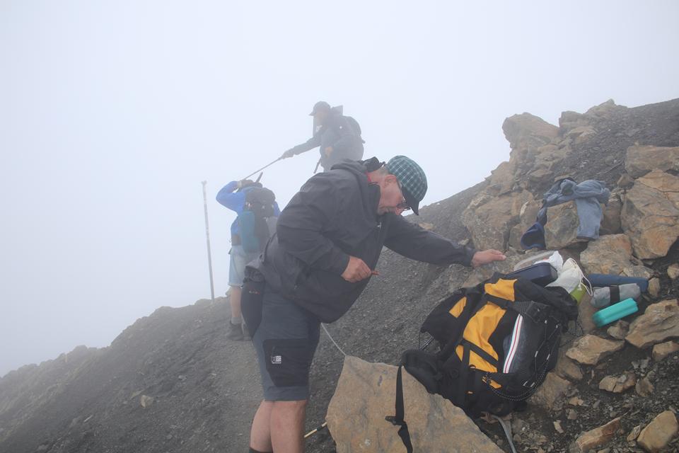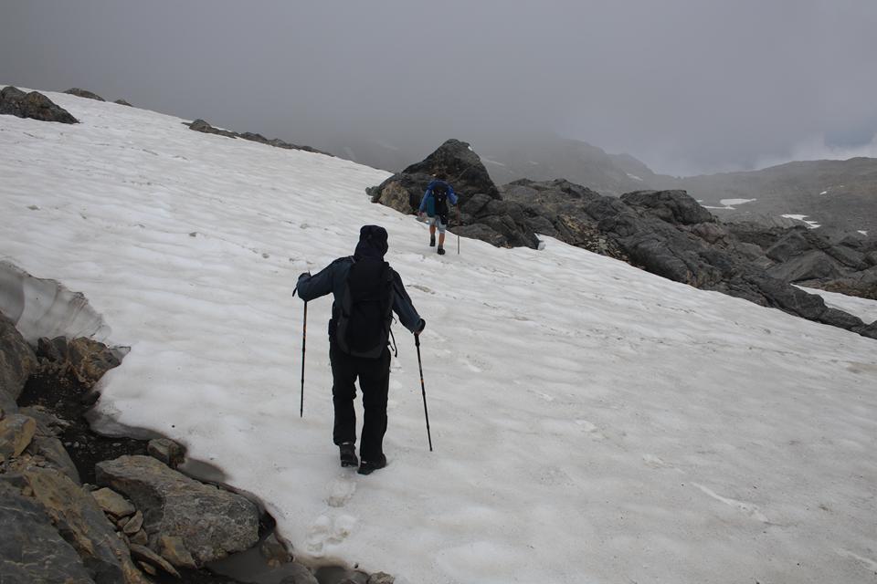 Schnell steigt der Puls an der Körper findet seinen Rhythmus. Altschnee begräbt ab und an den Wanderweg. In einer leichten rechts Kurve steigt es in Richtung des Sattel an. Es wird steiler. Ali führt eine Gruppe an, die ich wenigen Minuten im steileren Gelände überhole. Viel Begangen dieser sehr beliebte Aussichts Berg. Mauri Humprey und Flori schließen sich Ali und Bodo an. Mane und ich gehen unser Tempo. Die Sicht und auch Temperatur nehmen ab, es ist nie schwierig oder Gefährlich, das liegt an der Neigung des Geländes.. Die ersten sind schon im Abstieg wohl die Frühaufsteher. Ein Älterer Herr klebt sich an unsere Verse. Der Puls ganz schön in Fahrt, gutes Training für die Profitour. Toller Blick zurück auf die beiden See und die Hütte. Grau das Gelände, nur wenig Pflanzen gedeiht in dieser Stein Wüste. Unser „Verfolger“ wird um ein Foto gebeten, diesem Wunsch kommt er nach.