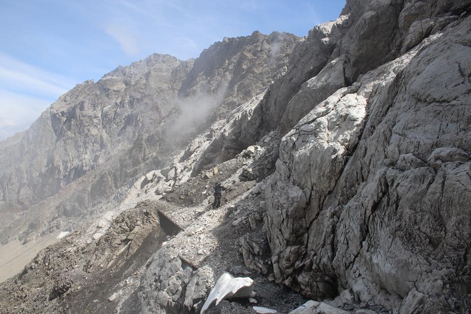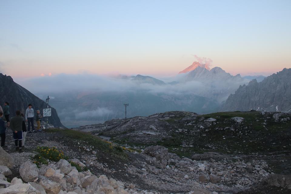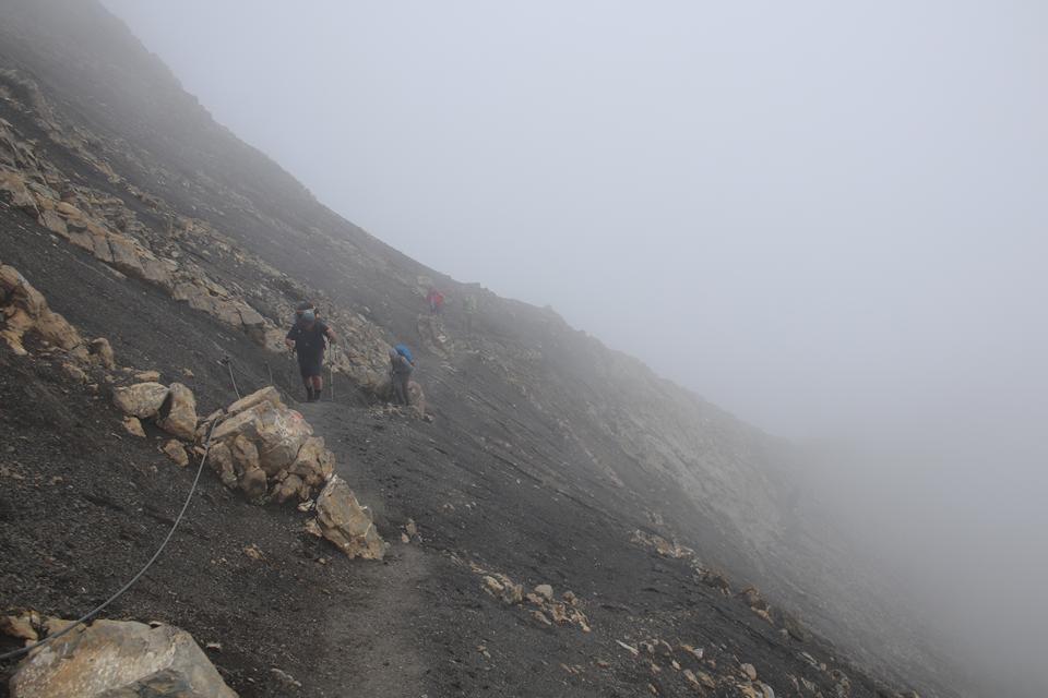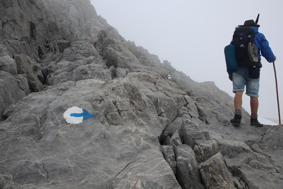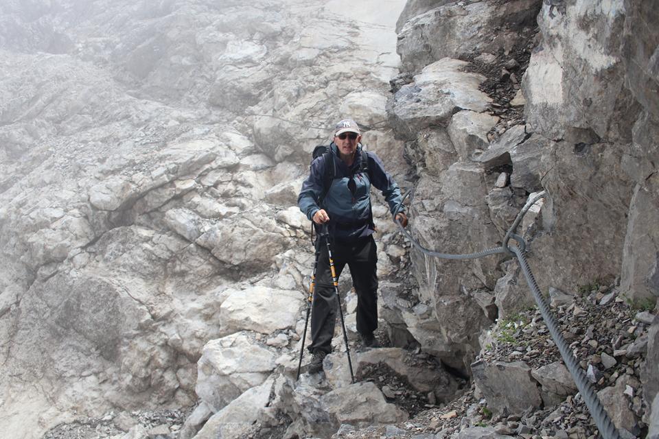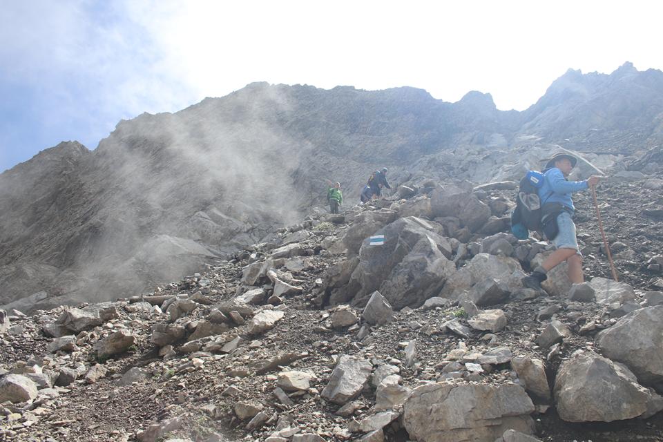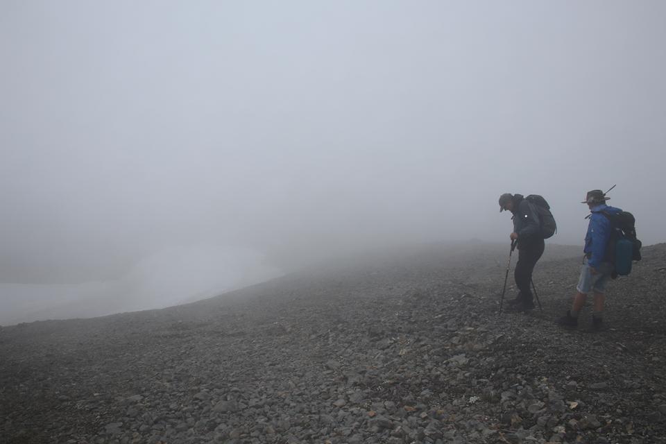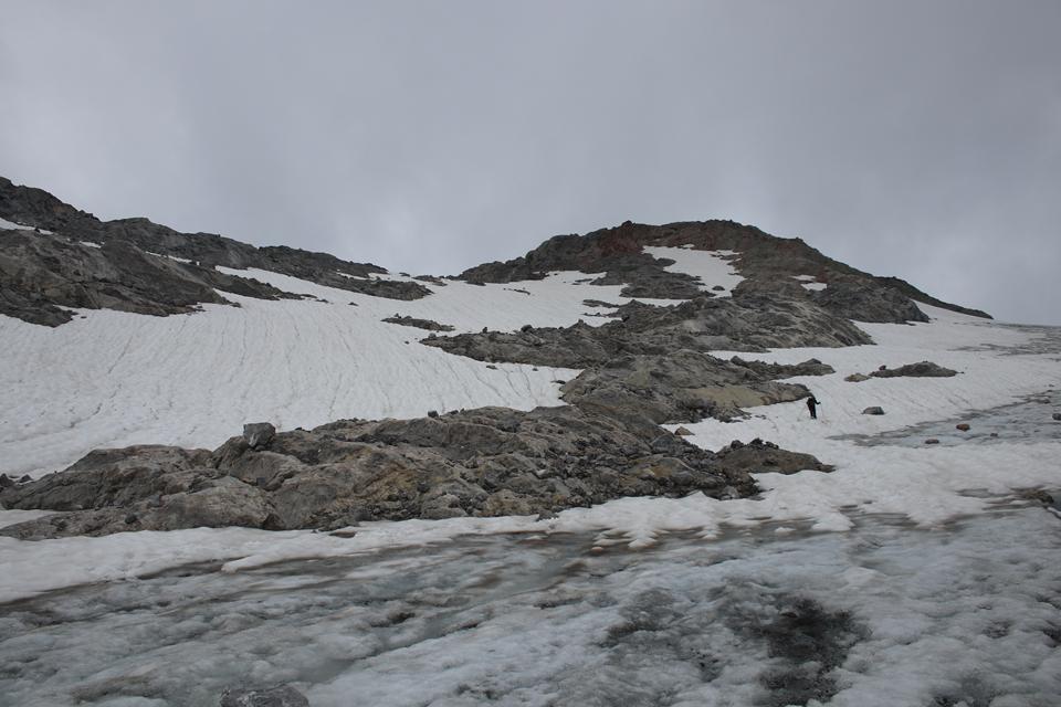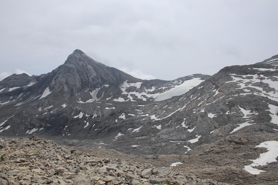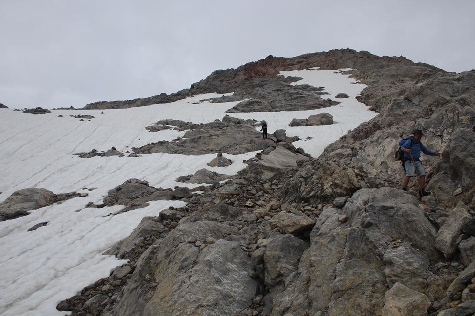 Schnell steigt der Puls an der Körper findet seinen Rhythmus. Altschnee begräbt ab und an den Wanderweg. In einer leichten rechts Kurve steigt es in Richtung des Sattel an. Es wird steiler. Ali führt eine Gruppe an, die ich wenigen Minuten im steileren Gelände überhole. Viel Begangen dieser sehr beliebte Aussichts Berg. Mauri Humprey und Flori schließen sich Ali und Bodo an. Mane und ich gehen unser Tempo. Die Sicht und auch Temperatur nehmen ab, es ist nie schwierig oder Gefährlich, das liegt an der Neigung des Geländes.. Die ersten sind schon im Abstieg wohl die Frühaufsteher. Ein Älterer Herr klebt sich an unsere Verse. Der Puls ganz schön in Fahrt, gutes Training für die Profitour. Toller Blick zurück auf die beiden See und die Hütte. Grau das Gelände, nur wenig Pflanzen gedeiht in dieser Stein Wüste. Unser „Verfolger“ wird um ein Foto gebeten, diesem Wunsch kommt er nach.