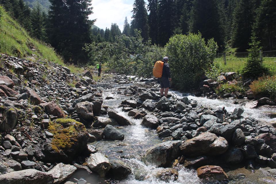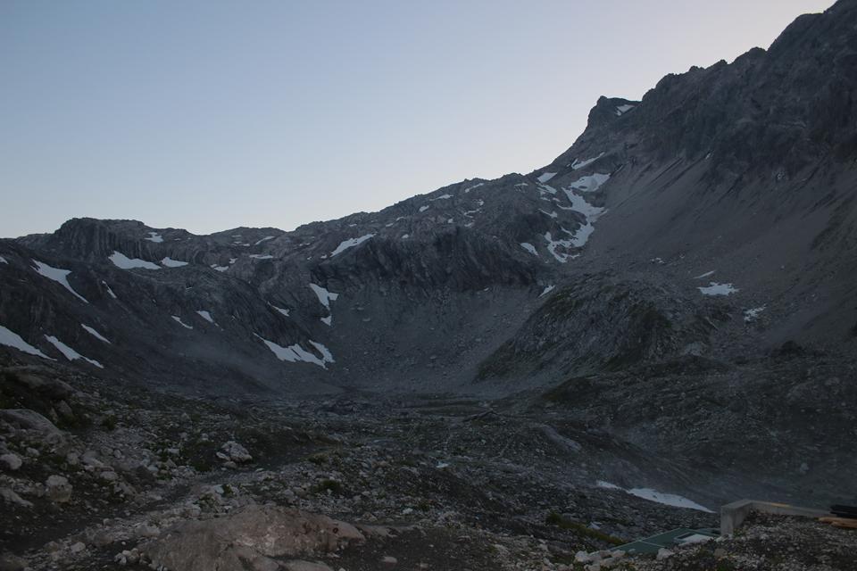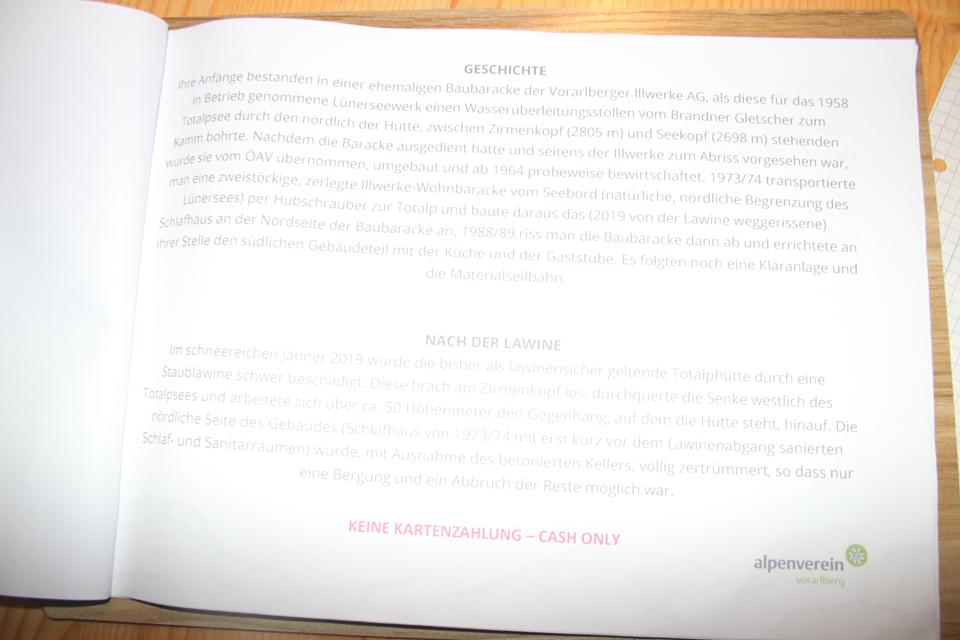 Während ich mit dem Schreiben beschäftigt bin, wird am Tisch Karten gespielt (Schwimmen). Himbeer oder Holunderwasser als AV Getränk für 3.90 €. Es hellt am Abend auf, für ein Foto geht es vor die Hütte, es ist Kühl. Etwas Unterhalb der Hütte tritt Wasser aus dem Berg, dieses kommt vom Brandner Gletscher, stürzt unüberhörbar in die Tiefe, 1957 wurde der 1,35 km lange Totalpstollen gebaut. Er durchquert dabei den Zirmenkopf und entwässert in den Totalpsee am Fuße der Totalphütte, der wiederum in den Lünersee fließt. Ali zieht sich schon sehr früh zurück. Gediegen die Unterhaltungen. Bodo gewinnt zwei Runden, der Einsatz kärglich der ein oder andere spielt mit 1 oder 2 Cent Münzen. Zeitig begleicht der ein oder andere Gast seine Rechnung. 21.30 Uhr, die letzte Runde kann bestellt werden. Um 22 Uhr, ist die Nacht noch nicht eingebrochen, da werden Erwachsene ins Beet geschickt. 22.10 Uhr, bezahlen als letztes. Humprey 49 € Mane 45 € Ich 42 €. Der Alte Trick für einen Moment werden die Lichter ausgeschaltet. Zum Abschluss noch die Zähne putzen. Mauri hat an seinem Netzteil noch ein USB Anschluss frei. Der Wasserfall ist in der Nachtruhe gut Wahrnehmbar. Toilettengang in der Nacht, das Ladekabel wird vom Netz genommene, es ist recht warm Grund genug um ein Fenster zu kippen.
