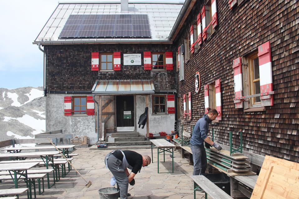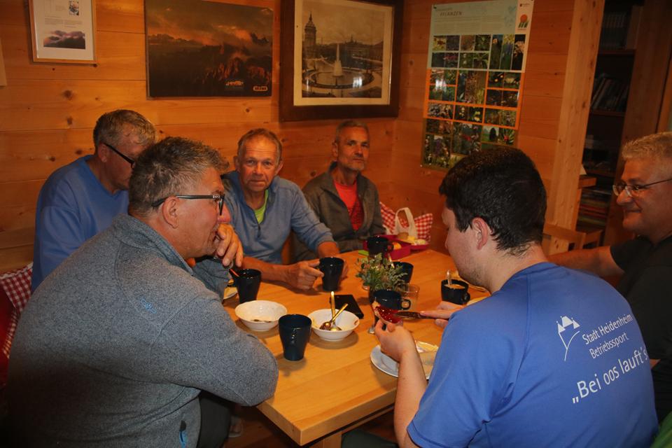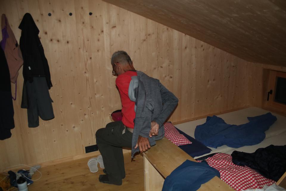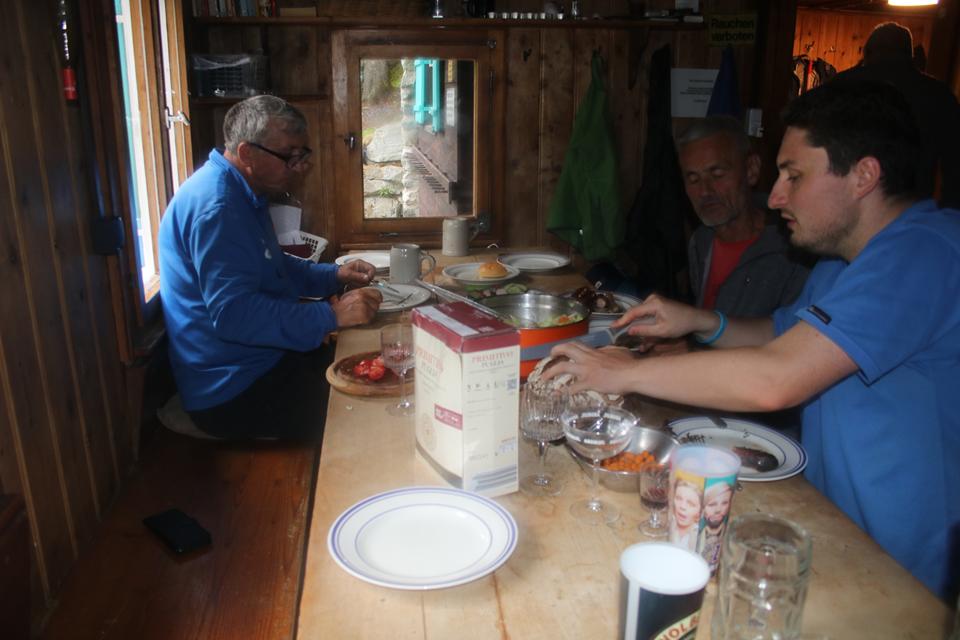 Unvergesslich die Aussage, wir haben keine Wanzen und möchten auch keine! Der Rucksack kommt in den Eingangsbereich oder Trockenraum, klare Ansage. Das Frühstück ist von 7 bis 8 Uhr. Um 8 Uhr bitte das Zimmer Räumen. Das Zimmer (Lager) Schesaplana im 2 Stock wird zugewiesen. 11 Schlafplätze 2 Mädels und eine Ältere Frau liegen in den Doppelstockbetten. Ali ist vom Aufstieg etwas ausgelaugt, Mauri benötigt eine Dusche, 1 Münze kostet 1 € Warmwasser läuft 1 ½ Min. mal sehen wie lange er unter dem Wasser steht. Mane sitzt schon am Reservierten Tisch auf der Südseite in einer Ecke, an den Wänden sitzt man auf der Eckbank, das ist schon einmal sehr gut. 5 Kollektoren Sorgen für das Warmwasser dazu eine große Photovoltaik Anlage. So etwas entgeht mir beim Eintreffen nicht. Die Gaststube ist unterteilt, hier stehen 3 Tische. Pünktlich wird das AV Essen Serviert, schnell Chili und Knobi in kleine Stücke schneiden. Gehe nach Oben um Bodo und Humprey wegen des Essen zu Informieren. An einem Buffet stehen die Gäste wegen der Suppe an. Cremesuppe mit Backerbsen, auch Nachfassen ist möglich. Ali ist nur die Hälfte seiner HP es fehlt ihm der Appetit, teilen die Suppe reihum auf. Gute Kritiken für das Essen.