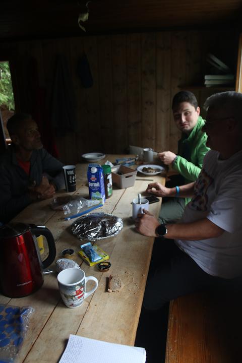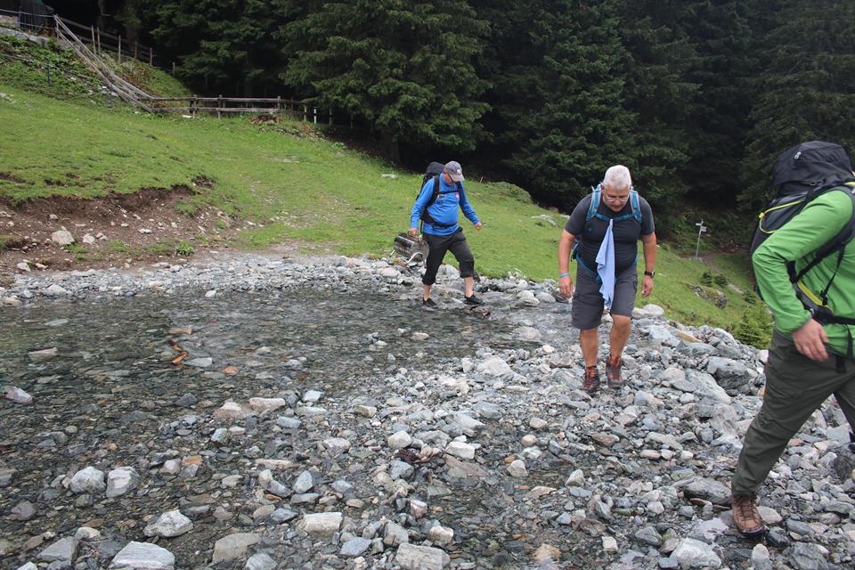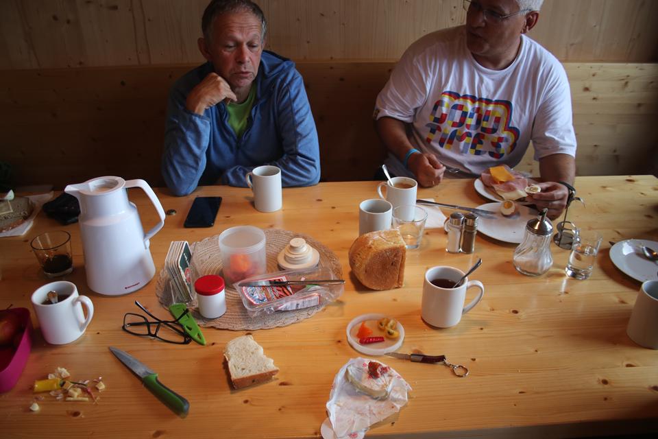 Montag 7.Juli: Beim gang auf die Toilette knarrt und Quietscht es unter jedem Schritt. Die Notbeleuchtung sorgt für Ausreichend Licht. Die Haustüre ist verschlossen der Schlüssel steckt, der Regen legt wohl leine Pause ein, in der Dunkelheit ist Vorsicht geboten. Unüberhörbar plätschert das Wasser im Bachbett über die Steine. Flott zurück unter die Decke. Früh ist schon Musik wahrzunehmen, Mane`s Wecker meldet sich mehrmals, dennoch reagiert noch keiner. Um 8.45 Uhr, ist es dann soweit. Die Decken zusammenlegen und auf den Vorgesehen Platz legen, etwas schwerfällig die Bewegungen, das Bier hat seine Wirkung hinterlassen. Beide Gruppen sind schon aktiv. Ali hatte den kompletten Abwasch erledigt das verdient aller Respekt! Einer der Schweizer Trocknet mit einem T-Shirt alles ab. der Raum ist noch immer gut Temperiert. Die Temperatur liegt bei 12 °C. es ist Trocken mit einer hohen Luftfeuchtigkeit, bei starker Bewölkung. Vormittags ändert sich da wenig. Stelle die Butter und Milch aus dem Brunnen auf den Tisch. Marmelade Honig Wurst und Käse aus der Küche. Warmwasser in einer Thermoskanne steht schon am Tisch, die Wecken sind noch relativ gut. Das Brot ist schwer zu schneiden Während die Schweizer sich verabschiedeten erscheinen die Members unser Gruppe. Flori schneidet später das Brot auf, Steaks und Würste werden für die Fahrt vorbereitet. Die Hetzlers verabschieden sich zu einer Halbtagestour, auf die Frage was gibt es am Abend zu Essen, Käsespätzle. Sie werden Morgen den Schlüssel übergeben den Müll abgeben. Für uns beginnt das Abräumen, wir werden die Gaststube den Waschraum und die zwei Zimmer reinigen und Kehren. Der Boden ist so Alt mehr als Besenrein geht nicht. Ein jeder bringt sich wie selbstverständlich ein. Es hatte an nichts gefehlt, Mauri erinnert an die Zeit als wir Privat einige Hütten Wochenende gebucht hatten, wie gerne hätten wir noch einen Tag drangehängt. Ali schenkt Humprey den Grill samt Holzkohlen. Nachdem wir unseren Teil zur Reinigung beigetragen hatten Startet Ali und Bodo. Vor dem gehe eine letzte Kontrolle. Weder die Fensterläden schließen, noch andere Dinge die gefordert sind können jetzt schon abgeschlossen werden. Puh die Schuhe sind noch Klatsch Nass. 10.50 Uhr, Zweimal den Schlüssel drehen und an den vereinbarten Platz legen. Das wars.