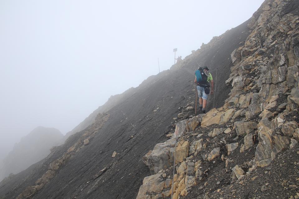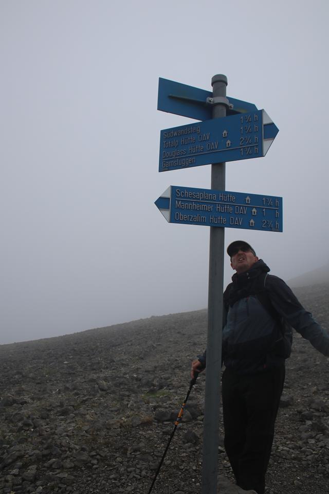 Bis in die Scharte sind es nur noch wenige Minuten. Interessant die Passage mit den Schiefer Platten. Hier hängen die Wolken, die Sicht schwindet. Kurz vor dem Erreichen des Schesaplanasattel, auf dem schwarzen Untergrund legen wir eine Pause ein, Kalt die Hände, so etwas bin ich überhaupt nicht gewöhnt. Der Wind pfeift aus West. Zwei Personen erreichen von Links (West) die Wegteilung, mehr als 10 Minuten halten wir dem nicht Stand, auf zum Gipfel. Ein Weg in einfachen Gelände der steiler wird. So gut wie keine Sicht. Fast geradlinig nach Oben, Stimmen werden lauter etliche Personen verweilen unter dem Mächtigen Holzkreuz das mit Stahlseilen gesichert sind. Schade dieser doch Isolierte Parade Aussichts Berg lässt überhaupt keine Sicht zu. 10.15 Uhr, reichen uns die Hand, Setze mich zu 5 Schweizer die im Windschatten verweilen. Die Fleece Weste kommt zum Einsatz. Eine kleine Schokolade die ich mit Mane teile als Belohnung. Mane lässt mich aus seiner Flasche einen Schluck Wasser trinken. Die Tour lässt sich mit der Koomot Aufzeichnung gut nachverfolgen. In etwa 1/3 der Strecke ist bewältigt. 1.45 Std. angegeben sind 2 Std. Kurzer Internet Aufenthalt (3 At). S könnte Trocken bleiben auch die Sonne wird sich zeigen. Wir Rätseln ob die Kameraden ob der Verhältnisse zum Gipfel aufsteigen. Damit wir sie nicht verpassen steigen wir ab. Humprey erreicht mit uns die Scharte, die anderen kommen gleich. Humprey steigt auf jeden Fall auf. Warten an der selben Stelle wie zuvor. 10.45 Uhr, sind wir komplett. Bis auf Ali wollen alle auf den Gipfel. Wir warten hier bis ihr wieder zurück seid. Relativ Flott sind die 4 wieder am Treffpunkt. Sie möchten gleich weiter, gesagt getan, ohne jeglichen Hinweis oder Markierung geht es abwärts. Ein Schild auf der einen Seite Austria auf der anderen Schweiz. Ein Pfad findet sich, es geht in den Milden Hang gefühlt leicht rechts, prinzipiell geradeaus, Abstieg in einem hin und her über reichlich Schotter. Wegteilung Schesaplana Hütte zweigt links ab Folgen Richtung Mannheimer Hütte . Übergang in einen Abwechslungsreichen Bereich Anfangs unter dem Grat. Längere Passagen durch den Altschnee etwas anstrengend auch die Wegfindung. Im Bereich der Blauen Markierungen auch Pfeile, läuft es sich gleich viel einfacher. Es hellt auf. die Temperatur steigt leicht an. Humprey folgt Mane während ich im Schnee mit der Weg Findung kämpfe. Die Wolken ziehen nach oben, Freie Sicht auf den Gletscher, Nördlich am Grat zum Wildberg 2788 m, steht die Hütte. Doch Erstmal wird ein Abstieg anstehen. Die Markierungen verlieren sich, Mane versucht es rechts, finde die Richtige Route, Informiere die beiden. Treffen überraschend an einer weiteren Wegteilung auf eine Gruppe Schweizer. Markierungen an den Felsen und Steinmänner weisen den Weg über die Schneefläche.