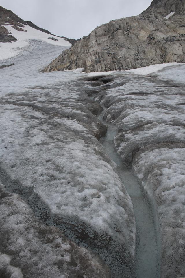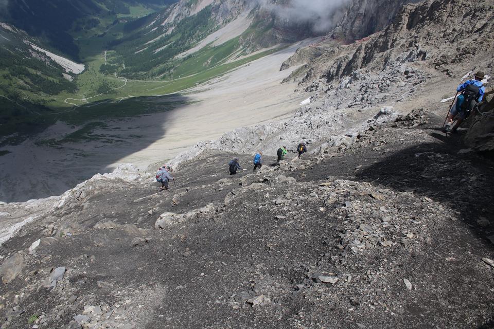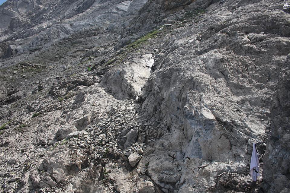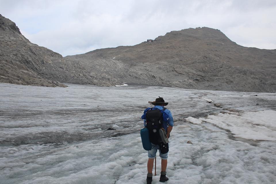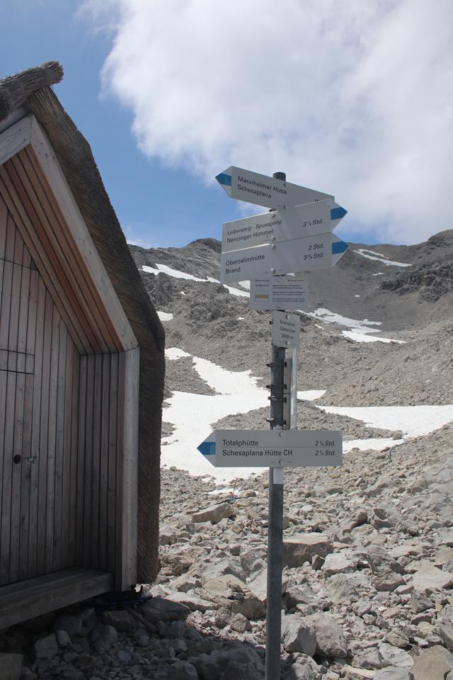 Es geht endlich Abwärts durch den Tiefen Schnee, ja kein Schnee in die Schuhe. Personen sind auf dem Gletscher Unterwegs. Wähle den Relativ Geradlinigen Weg teils auch über Felsplatten. Gut gewählt wird das Ewige Eis erreicht. Rau das Eis absolut Griffig. Der Gletscher fließt in Östlicher Richtung ab. Queren das Eis Richtung Hütte. Weitgehendst Schneefrei so gut wie keine Spalten. Kleinere Wasserläufe finden ihren Weg zum Bodensee. Wie war da die Aussage, als ich mit der Chefin der Totelalp Hütte wegen des Gletschers Telefonierte, wir haben den Brandner Gletscher Beerdigt. Auf dem Eis läuft es sich besser als wie zuvor im Schnee. Folgen unter den Felsen zu zwei Stangen die den Ausstieg Markieren. Es ist 13 Uhr. Ein Jogger passiert, eine Weg Tafel mit Zeitangabe noch 10 Minuten Aufstieg bis zur Hütte mit ihren Rot Weißen Fensterläden. Die Kameraden sind noch Oberhalb des Gletschers. Gut ausgetreten die Spur, die Markierungsstangen sind Stark verborgen. Es geht Kreuz und Quer über Stock und Stein, der Puls treibt den Schweiß. Personen arbeiten auf der Terrasse, der Alt und der Anbau unterscheiden sich an den Schindeln. Die Ehemalige Hütte der Sektion Strassburg liegt auf Stattlichen 2679 m. Die Gruppe die mit uns von der Totalp Hütte gestartet ist weilt unterhalb der Terrasse. Schnell wird klar warum, die Hütte eröffnet erst Morgen am Sonntag. Gerade werden die Fugen der Natursteine gefüllt. Die Schesaplana wirkt von hier sehr Markant, der Aufstieg vom Sattel scheint auf der Gratschneide zu verlaufen. Es ist Windig die Sonne setzt sich durch, Rucksack ablegen, schaue mich ein wenig um, kurze Unterhaltung mit dem Personal. Der Leibersteig ist ohne jeglichen Schnee. Auf die Frage wegen Trinkwasser, aktuell noch nicht das Wasser wird gerade aufbereitet. Hier wird mit Regenwasser gearbeitet. Die Hütte steht direkt am Grat, je fällt die Wand in die Tiefe, leider ist keine Sicht, die Wolken hängen noch fest. Die Seile des Materiallift führen direkt zur Oberzalim Hütte sind einige Meter Sichtbar. Die Scharte mit dem Beginn des Abstieg liegt etwas tiefer Westlich. Platziere mich zu Humprey und Mane. Vespern ein wenig. Mane öffnet eine Packung Nüsse, er bietet mir sein Wasser an. Die vier erreichen um 13.55 Uhr, die Hütte. Scheinbar sind sie einen anderen Weg mit einer kurzen Kletterstelle gegangen. Flori fühlt sich noch Fit, sie wünschen sich nur eine kurze Pause. Im Abstieg soll es eine Wasserstelle geben. 10 Minuten sind es bis zum Einstieg der am Wasserhäuschen beginnt. 20 cm ist das Häuschen mit Strohmatten Isoliert. Die Sicht ist nun Frei. Das Grün nach dem Tristen Tag eine Augenweide. Tief unten am Ende der Straße die vom Tal kommt, steht das Ziel noch 2 Std. Der Weg Führt nach rechts ist Blau Weiß Markiert es ist schon 14.30 Uhr. Dickes Stahlseil der Untergrund Erdig. Schaut wahrlich spannend aus. Mal sehen wie Mauri damit zurecht kommt. Der Wind ebbt nun ab. Anfangs wird die Höhe in Kehren abgeben. An den nötigen Stellen sind Sicherungseile montiert. Letzen Sonntag war die Bergwacht hier im Einsatz. Die Richtung wechselt Westlich, Interessant und Abwechslungsreich sowie spannend der Leibersteig, Vorsichtiges gehen ist angesagt. Wir dürfen überholen.