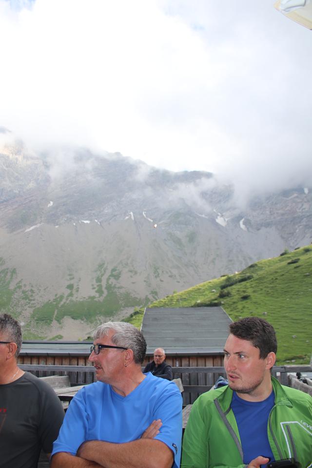 Ein Jüngeres Paar bietet uns ihre Tickets für die Talfahrt an. Mauri würde gern gegen eine Bergfahrt tauschen. Die Bergstation wird sichtbar, die Wolken steigen etwas. Mit dem erreichen der Ebene wird der Blaue Lünersee Sichtbar, die Bergkette im Süden spiegelt sich im Wasser. Gut 400 Hm im Aufstieg Gehzeit etwas über 1 Std. Der Wasserspiegel deutlich tiefer als üblich. Rechts zeigt die Weg Tafel zum Ziel 1 ¼ Std., aber erst nach einem Zwischenstopp auf der Douglass Hütte 1979 m, wo die Kameraden schon warten. Verteilt an vielen Tischen halten sich für einen Freitag etliche Gäste auf. Etwas geschützt sitzen die drei in einer Seligkeit. Kaum am Tisch frägt die Junge Bedienung nach unserem Wunsch. Als alle mit Getränken versorgt sind rufe ich wie vereinbart auf der Totalp Hütte, wegen des Abendessen an. Klar und Verständlich teilt die Chefin die Auswahl für das Abendessen mit. Das AV Essen Spagetti Bolognese, HP Geschnetzeltes mit Spätzle in Pilzrahmsoße. Ali Flori und Mauri die HP für 44 €. Um 18 Uhr, wird das Essen Serviert, es besteht daher keine Eile. Welche Nette Geste Mane bezahlt mein Weißbier 6 .40 €. Eine Gruppe ist Südlich im Abstieg vom Gafalljoch. 5 Bedienungen versorgen die Gäste. Jetzt erinnert sich Humprey, das wir anlässlich einer Herbsttour hier im Winterraum Übernachteten. Bodo und Ali gehen sofort nach dem bezahlen. Mauri bricht nach dem er von der Toilette zurück kommt auf.