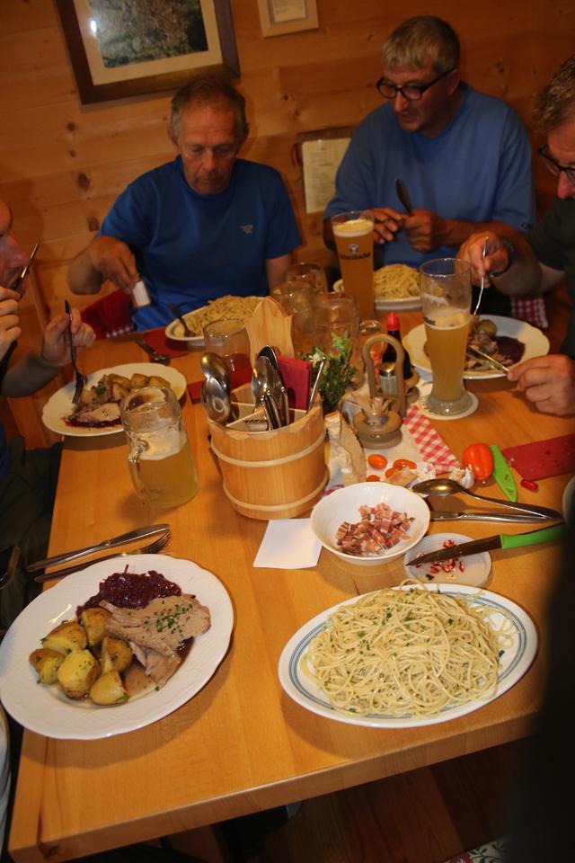 Nach einer Stunde Anwesenheit werden wir ungeduldig. Mane sendet eine Nachricht. Wir werden nach dem Abendessen das nach 19 Uhr Serviert wird gefragt, es gibt als AV Essen Spagetti Aglio&Olio. Als Hauptspeise Schweinebraten mit Blaukraut und Kartoffeln für 18 € oder die HP für 39 €. Mane und Humprey beziehen das Unterteilte Lager im OG. Es zieht sich wieder zu Schemenhaft die Sicht nach Oben. Über 1 Stunde ist Vergangen als die Jungs die Hütte erreichen. Flori freut sich das, er hatte einen Guten Tag beobachtete und Betreute die drei. Ali fühlte sich nicht sicher, seine Sorgen um das Knie, das unerwartet einknicken konnte, hemmte seine Bewegungen, dieses Gelände war für Mauri eine harte Nuss die er letztendlich mit Bravour bewältigte. Bodo passt sich zur Schonung den beiden an, wobei der Abstieg Schaden an den Füßen anrichtete. Flori legte viele Pausen ein, erfreute sich an dieser Tour. Ali sagt die anstehende Profitour ab, das ist absolut Nachvollziehbar. Bodo ist ganz angetan aus der Eigen Hergestellte Zitronen Limonade. Ein Rede Schwall an Erlebnissen von dieser viel gelobten Tour. Frage das Personal über die Seillänge der Materialbahn, ist mir nicht bekannt, die Höhendifferenz sei 1000 Meter, das stimmt so nicht es sind 890 Meter Höhendifferenz. Nachdem sich die Welle der Erlebnisse abebbt, beziehen sie das Lager. Wechseln in das Innere, nehmen Platz an einem kleinen Tisch mit Eckbank und 3 Stühlen, im Nebenzimmer. Schreibe emsig an den Notizen. Gutes Netz 3 AT. Flott der Service. Die Preise deutlich Moderater. 0,5 L Bier 5.10 €. Mehrheitlich wird Alkoholfrei Konsumiert.