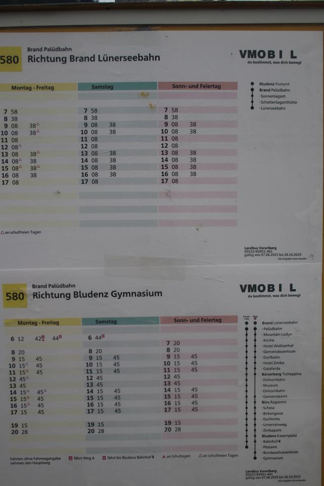 Unterhalten und feuern die Läufer/innen an, es besteht die Gelegenheit in der Nacht zu ruhen. Etliche sind im 17 und letzten Durchgang. Die Bergstation der Lünerseebahn ist am Ende des Tales gut zu sehen. Der Weg kreuzt unter der Bahn. Der Touristische Ort Brand 754 Einwohner ist zum Greifen Nah. Eine Hinweistafel am Weg „Bushaltestelle“ sind gut in der Zeit. Nicht allzu breit das Brandner Tal an dieser Stelle. Die Straße auf 1037 m, wird erreicht, rechts liegt der Ortskern. Wir haben wohl nur um wenige Minuten den Bus der 9.38 Uhr geht verpasst. Lebhaft das Frühmorgendliche treiben rund um die Bergbahn. Eine Bank an der Haltestelle lädt zum verweilen ein. Angenehm die Temperatur nach knapp 800 Hm. Abstieg. Gegenüber im Gebäude gehen Sportler aus ein, Neugierig Frage ich einen Sportler ob im diesen Gebäude die Sanitär Räume sind, Nein das ist ein Hotel. Ein Talabwärts fahrender Bus hält gegenüber, Mane spricht mit dem Fahrer, die Fahrt bis zur Bergbahn kostet 2.40 €. Nütze die Zeit zum Schreiben. Interessant das treiben um diese Veranstaltung. Pünktlich fährt der Gelbe Post Bus vor. Mane frägt wegen einer Rentner Ermäßigung, Cool die Antwort nehmt Platz. 12 weitere Gäste nützen das Transportmittel. Flott steuert der Fahrer durch die Kurvenreiche Strecke. Eng an einer Stelle, der Chauffeur steuert eine Ausweichstelle ein, um den Kollegen passieren zu lassen. Kostenlose Parkplätze zu hauf vor dem großen Parkplatz. Die Douglas Hütte und Bergstation ist heute gut zu sehen, bleibt das Wetter so? Bedanken uns beim Fahrer Wenig Betrieb. Zügig zum Fahrzeug, zur Überraschung öffnet Mane zwei kalte Bier. Bestens wegen der Lebensmittel, die wohl bestens gelagert sind. Mit dem Schreibzeug ist die Toilette der Station das Ziel. Mane berichtet das er mit Mauri Kontakt hatte. Ca 11.15 Uhr, erreichen sie Brand. Ein Lokaler Radio Sender findet sich. Reichlich Touris nützen die Bahn. Der Wetterbericht wenig Positiv für den weiteren Tagesverlauf. Wenig Fahrzeuge begegnen auf der Fahrt. Nicht ganz gewollt steuer ich das Auto. Ein Parkplatz an der Talstation der Palüdbahn findet sich. Noi ruft zurück, gestern und heute absolute Regentage. Mauri meldet sich, wir sind jetzt am Hotel Calanda. Ein Öffentlicher Parkplatz samt Sitzbank links nach 300 Meter Fahrt. Parke das Fahrzeug so das ein einladen easy ist. Das neue Ziel Einkauf von Backwaren in Bludenz, danach ist der Parkplatz der Madrisa Hütte das Ziel. Ali erklärt sich auch heute bereit die Verantwortung zu übernehmen. Beleuchtet der Spar in Brand, Mane versucht sich, schade genau seit 15 Minuten war Ladenschluss. Über Bludenz fällt Regen Mane ist der Meinung es sei Nebel, meine Erfahrung lehrt etwas besseren, genau dahin steuert Ali.Kurz vor erreichen fahren wir in das Wetter. Vorbei an der Vohrenberg Brauerei, ne ne heuer gibt es keine Brauerei Besichtigung. Das Ziel die Bäckerei Mangold, ist schon geschlossen, Ali probiere es am Bahnhof, da findet sich sicherlich eine Bäckerei. Direkt vor der Bäckerei findet sich ein Parkplatz, Mane ist auserwählt für den Einkauf. Ali kann den Backwaren die durch das Schaufenster in der Vitrine sichtbar sind nicht widerstehen. Ein kommen und gehen hier trifft sich der Ort. Ali programmiert mit dem Thunfisch Wecken in der Hand, das Navi nach Gargellen. Locker und lebendig die Stimmung. Mane hält 2 Papier Tüten mit Backwaren in Händen, 15 Wecken 1 Roggenbrot mit etwas über 2 Kg. 17 € legt er erstmal aus.