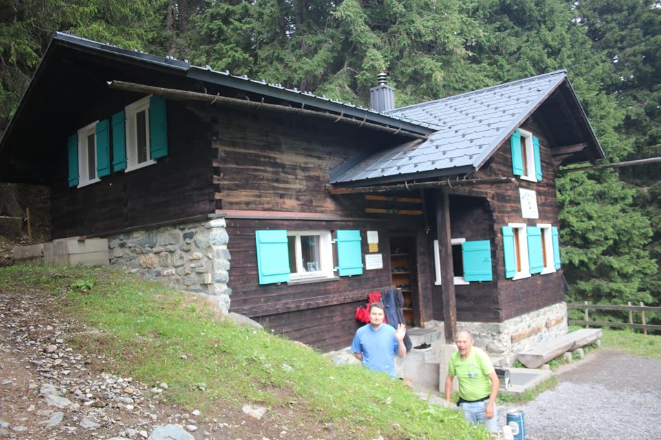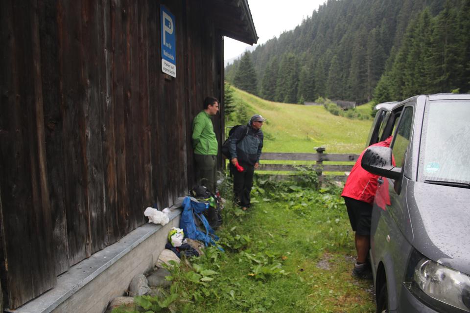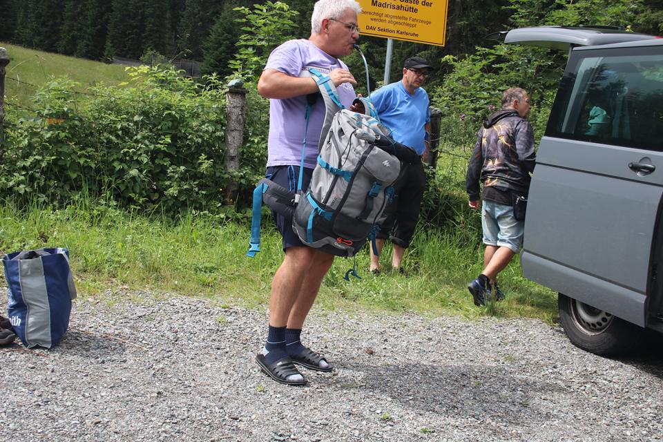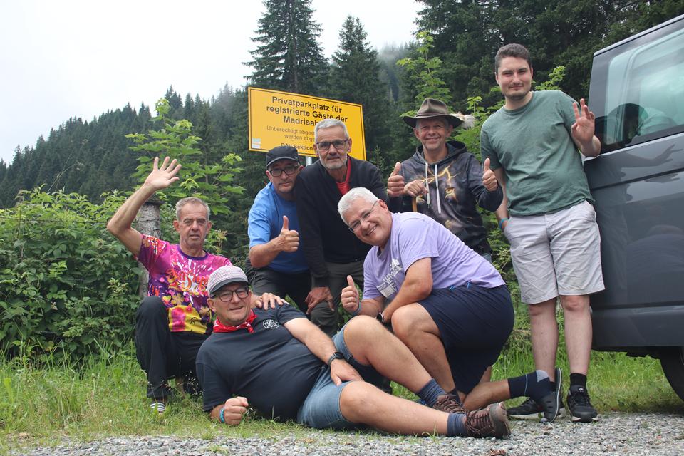 Grau der Himmel nach einer Besserung schaut es überhaupt nicht aus. Leichter Niederschlag bei der Anfahrt in das Montafon, schrecklich die Stationären Blitzer auf die das Navi reagiert. Ruhiger Verkehr dann bei der Auffahrt im Gargellental. Vorbei n der Bergstation der Schafbergbahn. In einer scharfen Rechtskurve Unterhalb Vergalda, ein großes Gelbes Schild „Privatparkplatz für Gäste“. Links zum Hang steht ein Schuppen. Direkt daneben parkt Ali. Es ist 13.30 Uhr, das sollte passen. Ein Fahrzeug mit Mergentheimer Nummer parkt etwas versetzt, das sollte Jochen sein, der bei der Übergabe Anwesend war. Schaue nochmals in die Kompass Wanderkarte. Unterhalb ist ein Bach deutlich hörbar, diesen sollten wir überschreiten. Ein Umtrieb beginnt, um für ein System zu Sorgen wird der Kühlschrank unter die Heckklappe gestellt. Bodo verteilt die Lebensmittel und Getränke. Etwas eng das Treiben um das Auto, quasi ein Organisiertes Chaos 😊Grill und Holzkohle und die beiden Bierfässer sind die sperrigsten Gegenstände. Flori nimmt ein ich das zweite Fass, Verflucht! stärkerer Regen setzt plötzlich ein. Wohl dem der einen Schirm dabei hat. Mane nimmt den großen Rucksack von mir. Stellen uns unter die Heckklappe oder an den Stadel, das Dach schützt etwas. Kühl ist es dazu die Feuchtigkeit, nach 20 Minuten lockern sich die Wolken von Westen zum Glück wieder auf. Mane nimmt die Holzkohle Mauri den Grill. Versetze das Auto damit ein Zugang zum Stadel möglich ist. Es ist 14.10 Uhr geworden, 45 Minuten Aufstieg das Ziel liegt auf 1660 m. Wir öffnen die Absperrung zu einer Wiese, queren diese, das hohe Gras ist klatsch Nass. Mauri navigiert mit Google, leider ist die Brücke der Ski Abfahrt verbarrikadiert. Auf der anderen Seite sind Personen auf einem Schotterweg Unterwegs. Habe ich das Auto verschlossen, kehrt, ja die Türen waren verriegelt. Steigen am Hang etwas auf bis sich eine Stelle findet wo sich der Zaun übersteigen lässt, Abwärts bis zum Bach, Ali und Humprey versuchen es den Bach zu queren. folge den beiden bis sich eine Stelle zum Überqueren findet, das ist mir zu blöd, Watte mit den einfachen Schuhen durch das Kühle Feucht. Warten an einer Brücke bis wir wieder vereint. Eine Frau mit Kind fährt von der Bergstation kommend mit einem Kettcar zur Talstation der Bahn. Mittels Google Maps wird klar der Weg verläuft direkt am Bach bis zur Hütte. Geschätzt ist es noch 1 Km. Der Untergrund ist gut zu gehen. Die Wolken hängen in den Berge deutlich über 2000 Meter. Gut Markiert der Weg, auch Bänke sind aufgestellt. Leicht Bergauf das Gepäck nicht allzu schwer. Trage auch ein Stück den Grill. Links im Westen steht eine Alm, Mane vermutet das es die Madrisa sei, kann ihn beruhigen, das Ziel liegt rechts vom Bach. Freude überkommt, auf einem Absatz zwischen Nadelbäumen steht die Schwarze Massiv Holz Selbstversorger Hütte der DAV Sektion Karlsruhe. Auffällig die Weißen Fensterrahmen und Grünen Läden. Das Dach ist aus dunklem Metall. Ein Einfache Absperrung ähnlich einem Weidezaun soll wohl Tiere abhalten. 14.50 Uhr, wie vereinbart ist der Schlüssel hinterlegt. Ein Holzbrunnen links, dieser wird von einem Stahlrohr gespeist das vom Bach stammt, der nur wenige Meter daneben vom Berg kommend zu Tal fließt. Abstellen des Grill und Holzkohle, Mane öffnet die Türe, Dunkel angenehm warm im Gebäude. Niedrig die Raumhöhe. Einfachst die Bauweise, alles ist in die Jahre gekommen, der Lichtschalter findet sich.