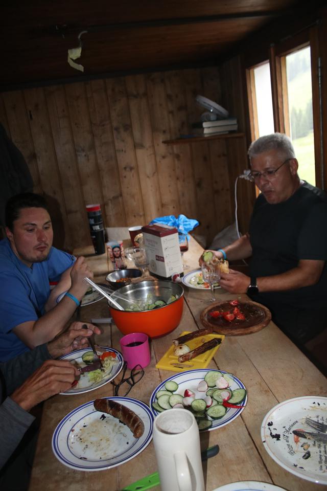 Zimmer bereit. Lege mich zu Mane und Humprey, das obere Bett unter der Dachschräge. Top was sich da alles in der Küche an Gebrauchsgegenstände findet, es fehlt wahrlich an nichts. Ein E-Herd mit Backofen daneben ein Küchenschrank. Einiges an Lebensmittel steht im Regal. Gläser Tassen Besteck und vieles mehr findet sich in einem Einbauschrank neben dem Ofen. Die Füße von Bodo sind stark lädiert, angeschwollen die Nägel Blau, das sind drei Schritte zurück. Fleisch Wurst Butter Milch Wein und Bier werden auch im Wasser gekühlt. Es wird Lebendig gut das wir uns noch entfalten können. Schnell wird es Häuslich Mane sticht das Gold Ochsen Fass von Ali spendiert dir ein Dankeschön! Bodo müht sich das Feuer zu entfachen, der Kamin des feinen wie kleinen Kachelofen zieht nicht. 4 Fenster sorgen für Helligkeit, etliche Sitzkissen für die Eckbank und Stühle Massiv der Große Tisch. Ausreichend Steckdosen. Mauri öffnet den 3 Liter Wein im Karton. Nüsse Chips Salzstangen sind am Tisch in kleinen Schalen, schlecht die Luft durch den Rauch. Starte den Bericht. Schnell geht das Fass zur Neige, Ärgerlich das wir auf das dritte verzichtet haben. Unter der Voraussetzung das bei Rückkehr ein Glas Bier am Tisch steht, gehe ich zum Auto und hole das dritte Fass. Mittlerer weile knistert es im Ofen die Herd Platte gibt mollige Wärme ab. Mit den Hüttenschuhen und einem Rucksack wird die Mission umgesetzt, es ist von Oben gerade Trocken. Absolut Motiviert die Zufriedenheit aller ist deutlich spürbar, ein jeder bringt sich ein, es wird ein Guter Abschluss ziert alles, Stimuliert dementsprechend der Schritt, 17.06 Uhr, binnen 22 Minuten ist das Auto erreicht. Auf dem Rückweg einsam entlang des Bach mehrheitlich im Wald, hierher verirren sich nicht viele Wanderer, es beginnt zu Tröpfeln das wird gerne in Kauf genommen. Zum Glück bleibt das meiste in den Bäumen hängen, je näher das Ziel kommt steigert sich der Regen, ein Schirm wäre berechtigt. Mauri kämpft mit dem entfachen des Grill Feuer, selbst kleine Holz Spachtelnd und Papier entzünden nicht, der Rauch wie in einem Meiler. Es ist 17.30 Uhr, benötigte etwas mehr als vorher im Aufstieg. Bodo schließt als er in das Haus geht, die Eingangstüre nicht. Ein Feuermelder nach dem anderen löst zwar keine Panik aber Unruhe aus. Mane reagiert Geistesgegenwärtig schreitet zur Tat. Ali wird von diesem Alarm aus dem Schlaf gerissen. Zwangsweise werden sämtliche Fenster geöffnet, di Einströmende Kaltluft ist mehr als Unangenehm. Flori möchte alleinig Salat für das Essen zubereiten. Der Grill von Ali benötigt seine Zeit bis die Kohle Glühen, von unten kommt zu wenig Luft. Die Teller und das Besteck wird an den Tisch gestellt, mittlerer Weile ist durch das Feuer von Bodo wieder Mollig warm. Als die Glut steht geht’s ganz schnell Ali und Mauri leisten Top Arbeit im Freien lassen sich vom Regen nicht schrecken. Flori Serviert den Bunten Salat Mix. Bodo schneidet das Wagenrad (Roggenbrot) ein hartes Stück Arbeit, es könnte ein Steinbrot sein. 18.30 Uhr, Mauri verteilt die gegrillten Bratwürste, so schnell können wir die Würste gar, nicht gegessen werden. Richtig gut die Auswahl. Stimmen werden wahr genommen, da kommt doch wer, es ist die Gruppe Beschamps wohl allesamt Rentner, trifft Klatschnass ein, sie sind nur zu viert. Schön warm habt ihr es! Kurzer Plausch, die Tour startete an der Tilsuna Hütte. Dankbar hängen sie ihr Textil nachdem wir die Kleider von der Gruppe von Jochen abhängen, über dem Kacheloffen auf. Wie ist das mit dem Lager geregelt? Ihr könnt eines der beiden 6 Bett Zimmer auf der Ostseite belegen. Sie halten sich später am Tisch in der Küche auf. Bodo der Wasser für einen Tee aufkocht auf der Herdplatte aufheizt überlässt ihnen das Wasser. Morgen steht eine Etappe nach Klosters an. Flori hält sich mit dem Genuss von Alkohol zurück, er Trinkt ein kleines Gläschen Rot Wein. Später testen wir die Menge die in ein Wein Glas, 3 Gläser von Humprey ergeben 0,5 L, das Glas von Flori passt 8x. Auch das Grillfleisch schmeckt absolut lecker. Die Glut wohl am Höhepunkt, doch mehr als Essen geht nicht, wir sind pappe satt.