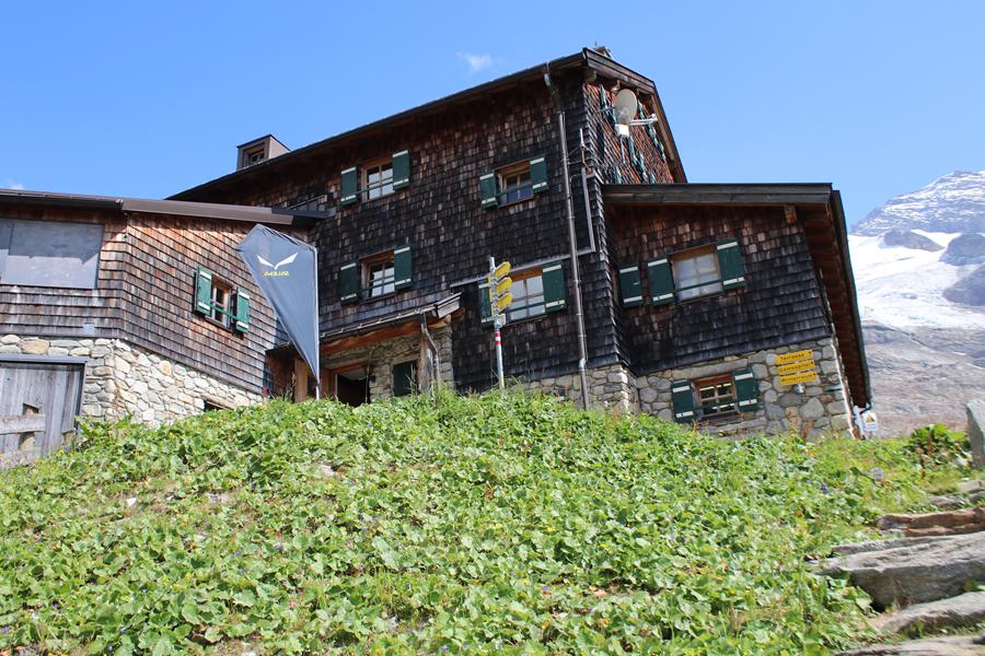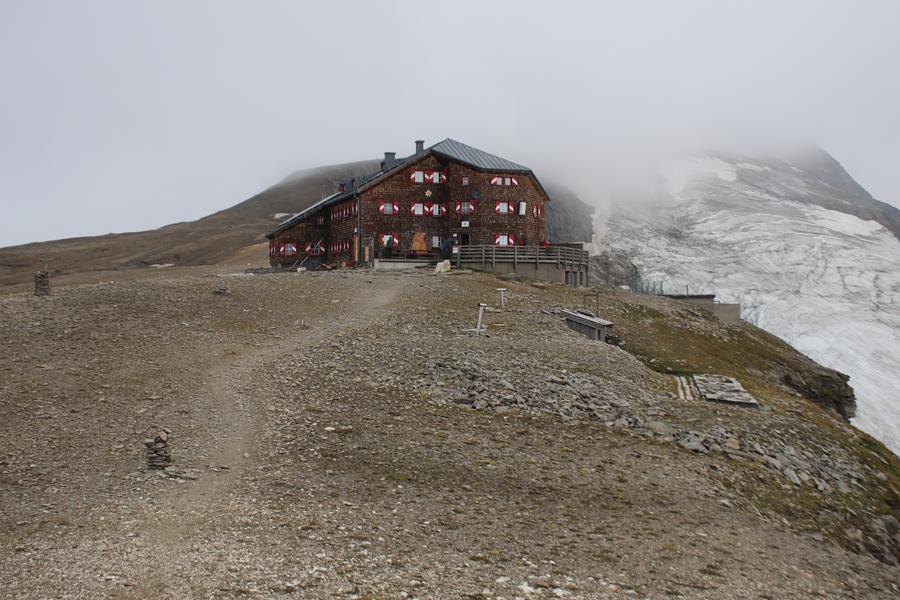 Ab hier beginnt der Eigentliche Aufstieg. Erstmal in Nördlicher Richtung über die geschliffenen Platten insgesamt ist es gut Markiert auch Steinmänner. Das kostet Kraft und Zeit die Beine sind schon etwas schwerfällig. Wasserläufe vom noch nicht Sichtbaren Südlichen Bockkarkees fließen Talwärts. Der Burgstall auf dem die Hütte steht teilt die Gletscher. Die Richtung wechselt leicht Westlich dem Ziel entgegen, weiter meist Ältere Personen stammen aus dem Osten. Von Westen zieht wohl ein Wetter auf. Ein Gletscherabfluss wird über eine Brücke überquert. Mühen uns von Stange zu Stange die Wegfindung nun nicht einfach. Der Rucksack wird zum Übel, ein Stück ist Weglos, beobachte gut ausgerüstete Personen wie sie sich nicht sicher sind, fast perfekt finde ich den Durchstieg, bin nun vor der kleinen Gruppe. Eine schmale Stelle findet sich, wo das Gletscherende überschritten wird. Achte darauf das Humprey mich im Auge hat. Wieder geht es über den Gletscherschliff bis zu einer von weitem Sichtbaren Stange. Der weitere Anstieg ist gut Markiert. Eine weitere Gruppe Älterer aus dem Osten das könnte ein Wanderverein oder ähnliches sein die absteigen. Ein Hinweisschild auf den Klettersteig Schwierigkeit A-B. Viele Markierungen über den Erdigen Untergrund bis zum Einstieg vor einer Wand. Stahlseile und Trittklammer, zum Abschluss noch ein Schmankerl. Humprey bittet mich den Stock am Rucksack zu befestigen, warten kurz bis 4 Personen abgestiegen sind. Es beginnt zu Tröpfeln, Anfangs steil empor mit einer Querung, ein Aufschwung mit Trittbügel weitere 4 Personen begegnen. Durchgehend das Stahlseil, teilweise liegt Sand, ansonsten aber gut ausgeräumt, dennoch liegen auch Steine. Der Niederschlag mehrt sich, zum Glück sind wir Flott Unterwegs binnen 12 Minuten sind wir auf dem Burgstall. Ca. 70 m Entfernt weht eine Große Grüne OAEV Fahne im Wind, gleich haben wir es geschafft. Links im Blickfeld der Obere Pasterzen Gletscher. Flach geht es zur Großen Oberwalder Hütte der Sektion OAEV Austria auf 2973 m, diese liegt auf dem Großen Burgstall wie eine Burg, umgeben von Eismassen. Schaut gut aus das Verschindelte Gebäude mit den Rot Weißen Fensterläden. Dahinter Deckeln Wolken die Berge. Es ist 16 Uhr, nach 7 ½ Std. am Ziel. Die Getränke Karte überrascht trotz Heli Versorgung sind die Preise in Ordnung. Schon beim ersten Schritt durch die Türe ist Wärme spürbar. Sofort wird klar, dass es hier um einen Hochalpinen Ausbildungs Stützpunkt handelt. Sehr viele Gelegenheiten für die Ausrüstung Pickel Seil etc. Eine Gruppe kommt von der Ausbildung zurück, es wird laut und Eng im Vor und Schuhraum. Auch finden sich Hüttenschuhe. Humprey trifft ein er hat wohl etwas mehr Regen abbekommen. Zeige ihm wo mein Pickel deponiert ist. Ruhig ist es in der Geräumigen Gaststube, fragen an der Theke dahinter ist die Küche, wegen unserer Reservierung, eine ältere Dame mit leichtem Akzent, nimmt sich uns Freundlich an. Das Lager im Raum 3 im 1.Stock. Abendessen gibt es von 18 bis 19.30 Uhr, auch ein AV Essen, heute sind es Spinatknödel, wir erhalten eine Karte für die Bestellungen, meldet euch einfach an der Theke. Der erste Eindruck sehr gut. Weitläufig das innere, wir suchen einige Zeit bis sich das Rätsel löst, in den Lagern sind nochmals Zimmer mit Lager. Einfach und ausreichend das Angebotene. Auf 2 Ebenen verteilen sich die 16 Schlafplätze. Humprey legt sich an die Fensterseite. Insgesamt sind es 139. Für die Rucksäcke gibt es separate Plätze. Die Gegenstände kommen wie immer in einen Stoffbeutel. Handy Kamera Geldbeutel, Brille und das Schreibzeug. Großer Waschraum mit Bodenebener Dusche und genügend Waschbecken, scheint erst Saniert worden sein. Die Füße erhalten ein Bad. Das Nebenzimmer sehr Gemütlich auffallend die Kassetten Decke, der Raum ist Reserviert für die Sektion Bonn, bis zum Essen dürfen wir gerne bleiben, setzen uns an die Außenwand reichlich Fenster mit Blick nach Westen. Mehrere Steckdosen für das Laden des Handys. Es herrscht Selbst Bedienung warum auch immer. Der Akku der Kamera hält schon 7 Tage, ein sehr Gutes Internet steht zur Verfügung. Später wechseln wir in einen anderen Raum, ein kleiner Tisch wie geschaffen, es ist etwas kühl, setze die Notizen fort, 2-3 Stunden sind es Täglich. Trotz der Größe verliert sich die Atmosphäre nicht. Humprey trinkt ein Radler ich ein Skiwasser. Später zum Essen ein Paulaner Hefe für 5.90 €. Das Große Essen beginnt. An der Theke ist eine Art Buffet aufgebaut, große Behälter aus denen das Essen geschöpft wird, warum fehlt es an Personal? am Abend erfahre ich, dass die Pächter ihre letzte Saison hier verbringen. Mit der Zeit sind etliche Plätze belegt. Humprey kann nicht länger wiederstehen kurz vor 19 Uhr, bekommt er an der Theke 3 Spinat Knödel in einer Buttersoße, zuschauen möchte ich nicht, Das Essen ist Reichlich und Gut. Flott auch der Ausschank an der Theke.