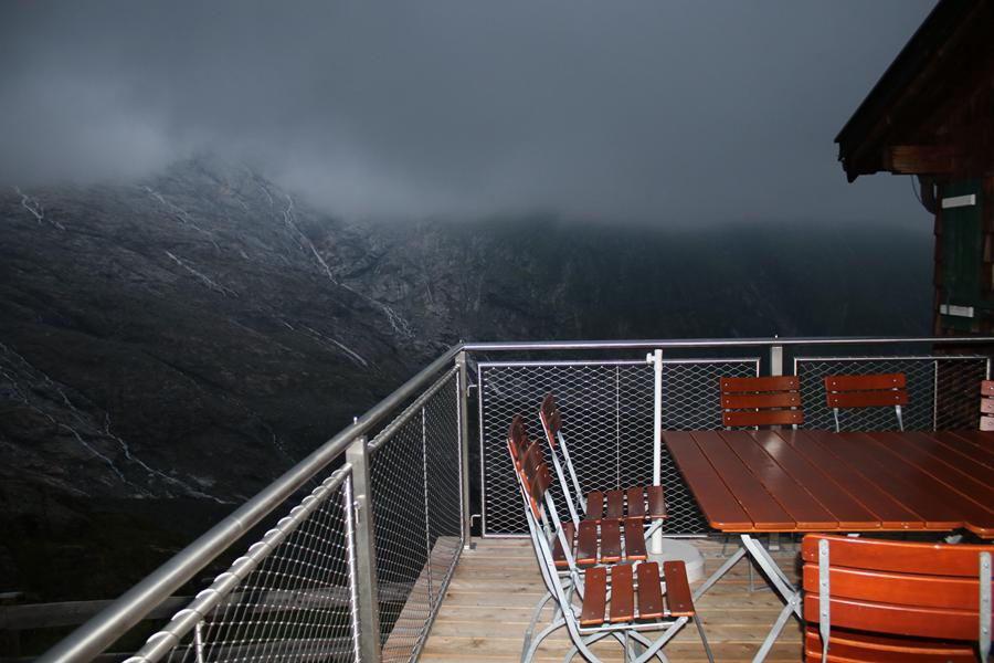 Die HP wird serviert, hier ist alles Perfekt eingespielt. Gipfelstürmer treffen ein reichen sich die Hände, ja es ist Trocken geblieben vor allem war es am Berg Relativ Ruhig. Hole Chili Knobi und ein Messer aus dem Rucksack. Nur kurz halte ich mich auf der Terrasse auf, es ist Recht Frisch kein Wunder sind wir fast auf 3500 Meter. Alina sitzt mit einer Decke am Tisch. Marco zieht sich nach dem Essen um 19 Uhr, zurück. Wir können Morgen das Gepäck im Vorraum oder Schuhraum hinterlegen. Wecken um 5.30 Uhr, Start eine Stunde später. Marco ist der Meinung das wir nicht in einer Seilschaft aufsteigen, erwähne das Sicherungsstangen aber vorhanden sind. Es ist kurz nach 20 Uhr, als der Angekündigte Regen einsetzt, nachdem ich und Humprey die nicht benötigte Ausrüstung in seinen Rucksack verstauen, auch ohne Essen und Trinken, Trinken wir zum Abschluss Humprey ein viertele Roten für mich eine Halbe, Bodo sitzt bei einem viertele Weißen Trocken dazu die gleiche Menge Wasser. 20.40 Uhr, Alina zieht sich vor ihrem großen Tag zurück. 21 Uhr, es hellt schon wieder auf dem Wind bläst aus Nord. Als die Nacht einbricht halten sich noch 20 Gäste verteilt an den Tischen. Christian meldete sich mittels WhattsApp, beantworte ihm den Verlauf des Tags in Kurzform. Die Toilette befindet sich im UG nackter Beton, der Blick geht nach Nord Ost. Zeitig ziehen auch wir uns zurück, die Außentür kann auch nicht gekippt werden, das wird Marco gar nicht behagen, durch die Glastüre dringt genügend Licht um sich sicher zurück zu ziehen.