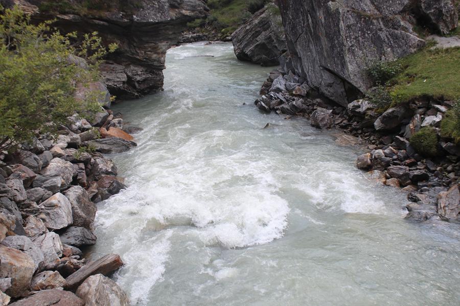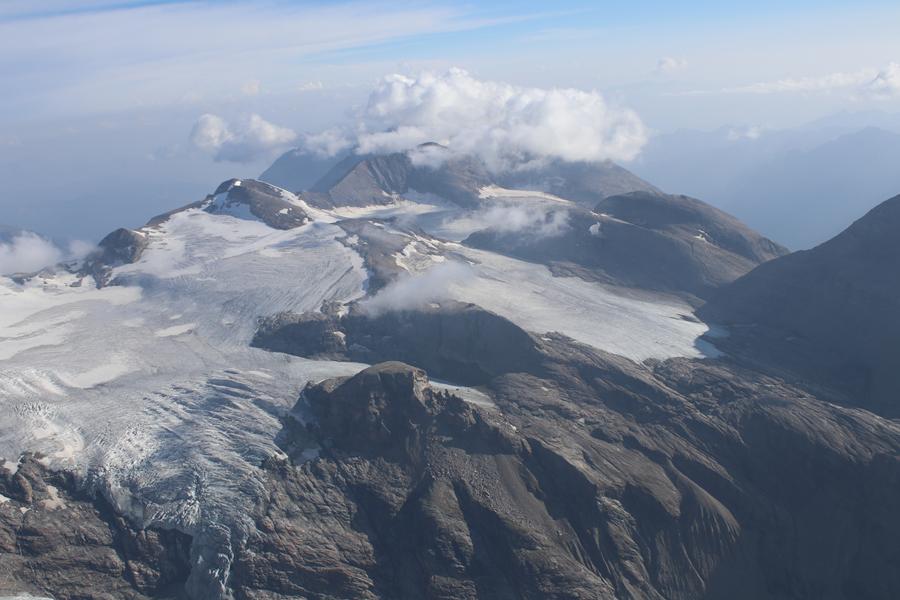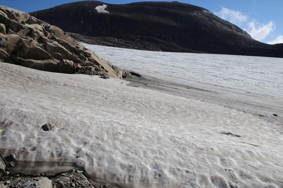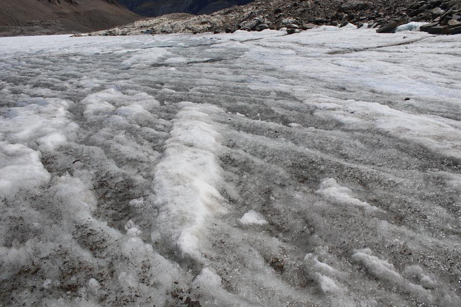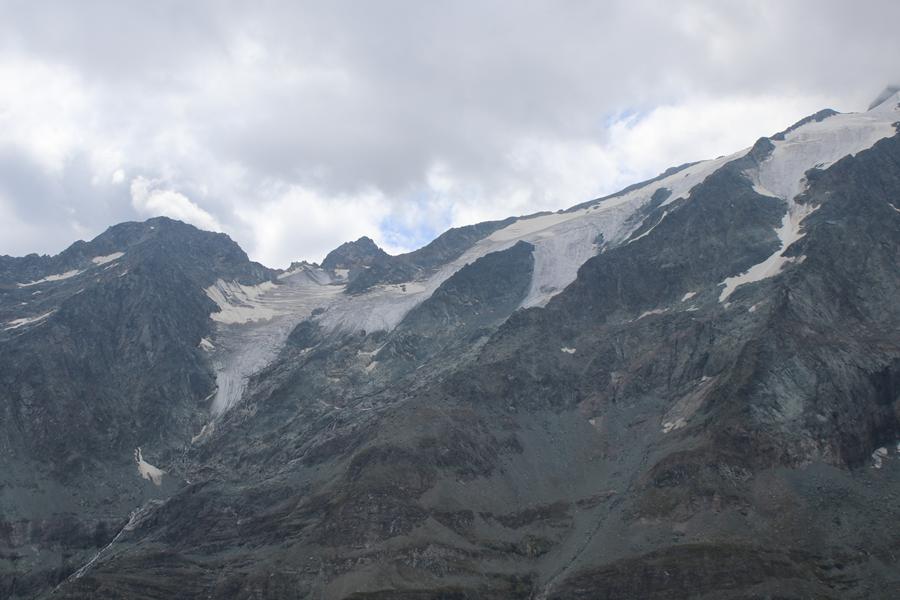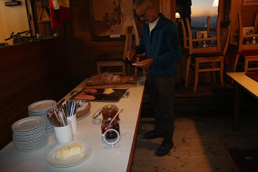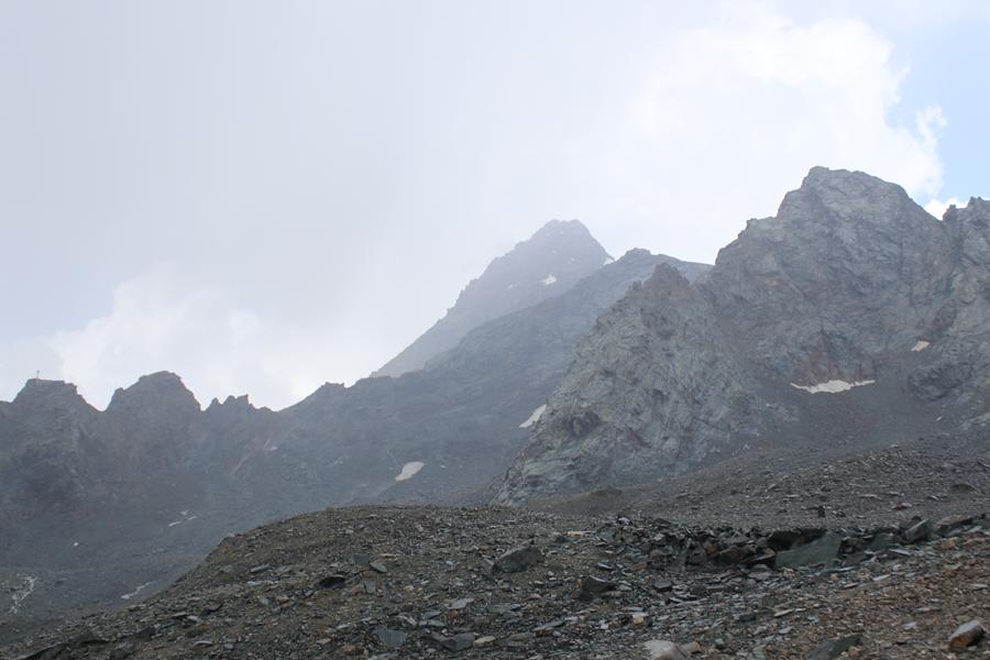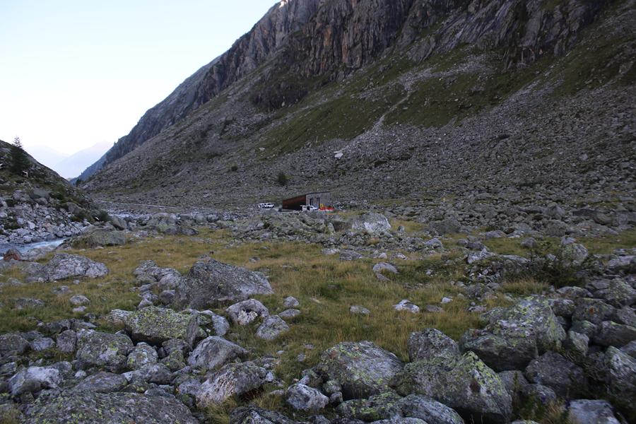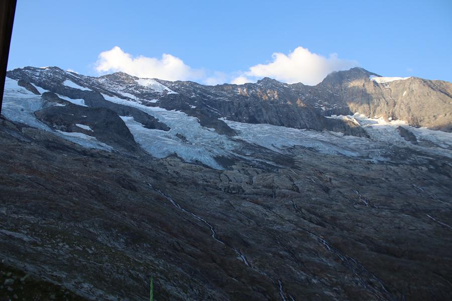Montag 11.August: Humprey empört sich in der Nacht über das schnarchen von Christian, es wird etwas lauter Emotionen entstehen, gut dann steige ich ab, vermutlich schläft er um das zu vermeiden, die nächsten Stunden nicht mehr. Es ist mir wohl bekannt, gestört hat es mich nicht mittelbar. Die Geräusche des abfließenden Schmelzwassers des Gletschers wirken beruhigend auf die Sinne. Frage nach der Uhrzeit, es ist 7.15 Uhr, die Decke zusammenlegen über die Leiter absteigen, die erste Stufe ist gemeistert. Öffne das Fenster für einen Blick nach Süden, wie angekündigt haben sich die Wolken weitgehendst verzogen, Reste hängen noch tief. Die Sonne erhellt die Grauen Felsen. Stahlblau der Himmel. So kann ein Tag beginnen. Eng geht es zu, etwas Unstimmigkeit ist spürbar, mit der Vesper für das Frühstück geht es zwei Stock tiefer. Die Toilette wie üblich um diese Zeit belegt. Dieselben Gäste sitzen schon am Tisch, Redlich die Stimmung Typisch am Morgen. Die Gäste stehen am Buffet an. Christian bestellt beim Chef 1 Liter Teewasser, habt ihr kein Frühstück? In einer Edelstahl Kanne bringt er es sogar an den Tisch. 2 Tee Beutel sind ausreichend. Humprey kann nicht ohne Kaffee. Unterhalten uns mit der Frau und ihrem Sohn der etwas schüchtern wirkt. Die Spitzwecken sind schon etwas ausgetrocknet, mit Leberkäse und Camembert rutscht er besser durch den Rachen. Kurz vor 8 Uhr wird es ruhig. 2 Tassen Tee wohl nicht genügend Flüssigkeit. Studiere kurz die Karte.