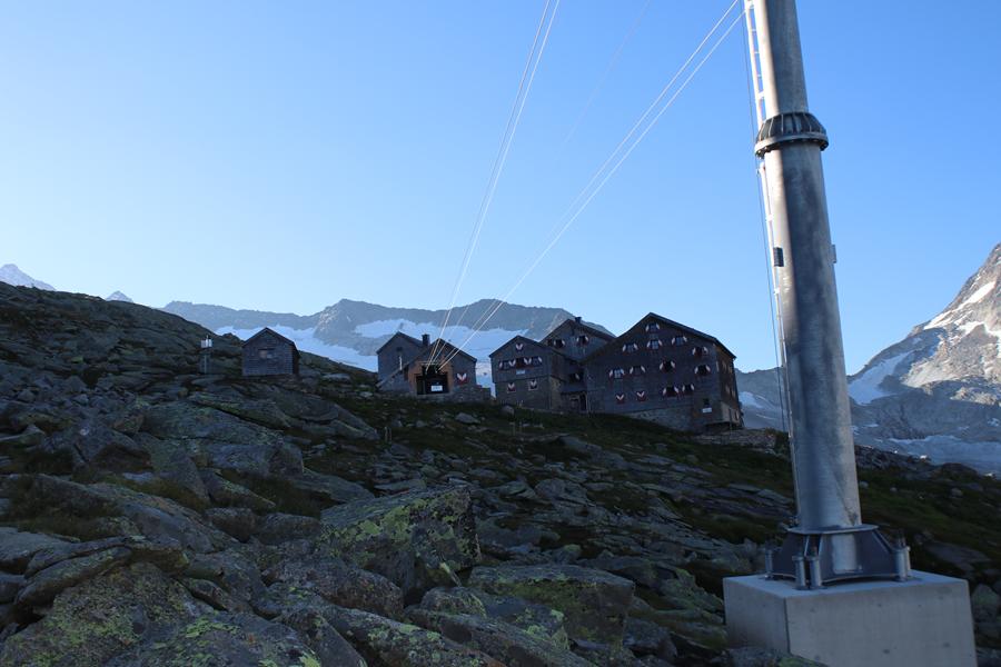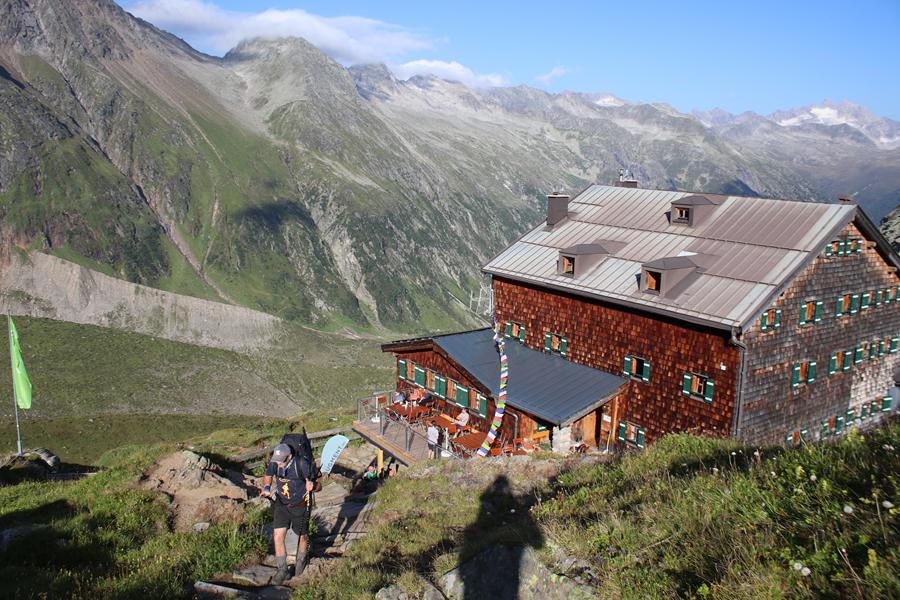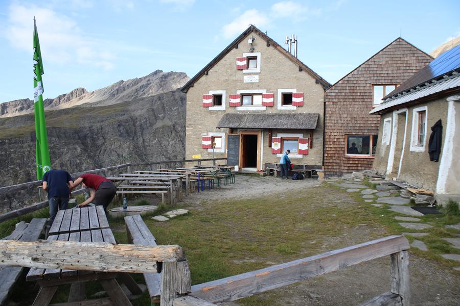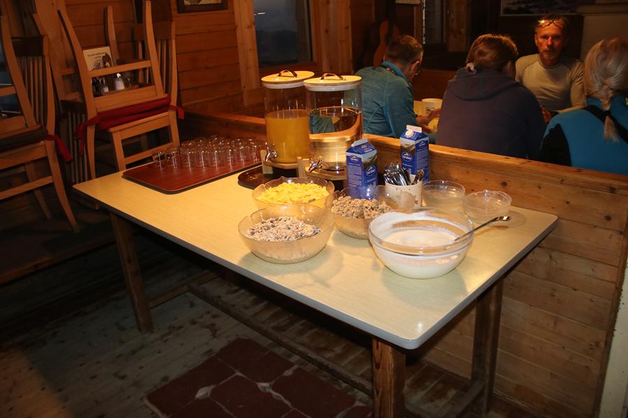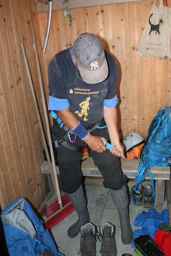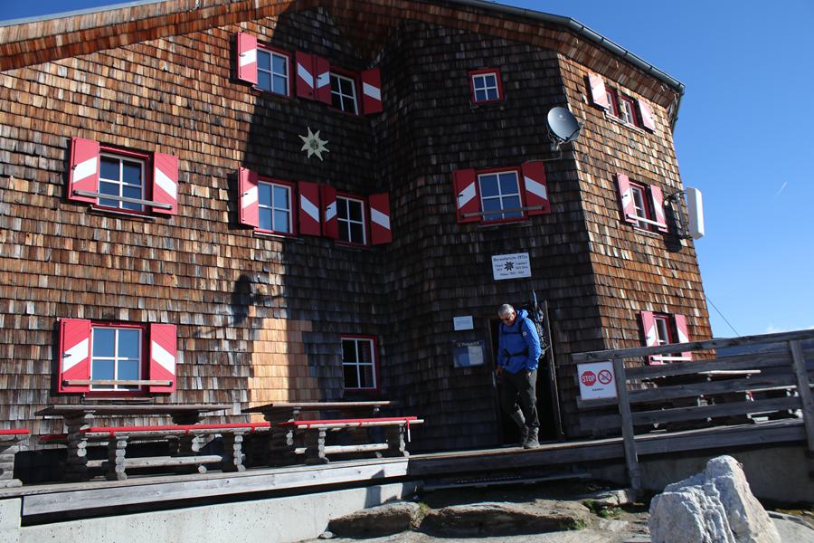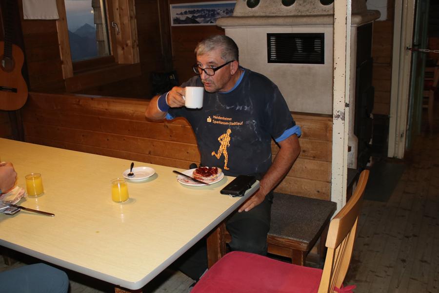 Montag 18.August: Ein Handy nach dem anderen weckt die Menschen, ein jeder versucht so lautlos wie möglich zu sein. Während Humprey in der Nacht die Toilette aufsuchte, überstand ich das verlangen danach. Noch vor dem Signal des Weckers stehen wir auf. Es ist 6.40 Uhr, ein Blick aus dem Fenster begeistert, ein Stahlblauer Himmel, ja wäre nicht dieser Heftige Wind aus Nord-Ost. Schneiden uns gleich hier Brot und Wurst. Auf dem Weg nach unten wird die Toilette aufgesucht. Gäste verlassen jetzt schon die Gaststube. Bestellen beim Chef Teewasser, wir dürfen uns selber am Buffet Wasser nehmen, zeigt auf die Tee Beutel. Wenn ihr wollt nehmt euch Marsch Tee. Setzen uns in das Stüberl, die Bonner bereiten sich wohl auf die Ausbildung vor. Hole eine 2 Tasse während Humprey einen Kaffee trinkt. Er klebt sich die Ferse am linken Fuß ab, zum Ende hin noch eine Blessur, auch außergewöhnlich. Schaue mir die Tour nochmal an, auf der Karte sieht es anders aus als nachher in der Realität. Die Rechnung beträgt 41.80 € Humprey begleicht 49.50 €. Auch die Chefin ist unglaublich Sympathisch, sie wünscht uns zum Abschluss eine Erfolgreiche Tour. Am Haus läuft eine Ausbildung mit dem Seil, wohl für Einsteiger. In wenigen Minuten ist das Hab und Gut gepackt, heute ist langes Textil angesagt. Humprey vermisst einen Handschuh. Kühl ist es im Hausgang, kein Wunder die Türe ist Sperrangelweit geöffnet. Die Schuhe werden im Warmen Schuhraum angezogen. Wohl auch sehr viele Privaten Hausschuhe sind hier deponiert. Während Humprey sich die Schuhe anzieht, sehe ich auf der Bank im Eingang einen einzelnen Handschuh, zeige ihn ihm, ja genau den vermisse ich. Ein Heli wird wahrnehmbar, kurz später fliegt dieser ein.