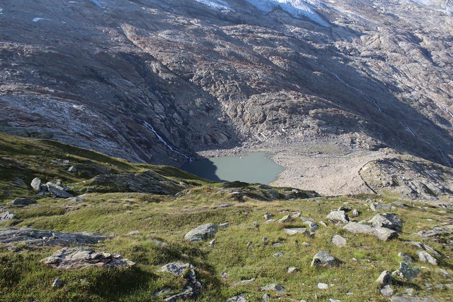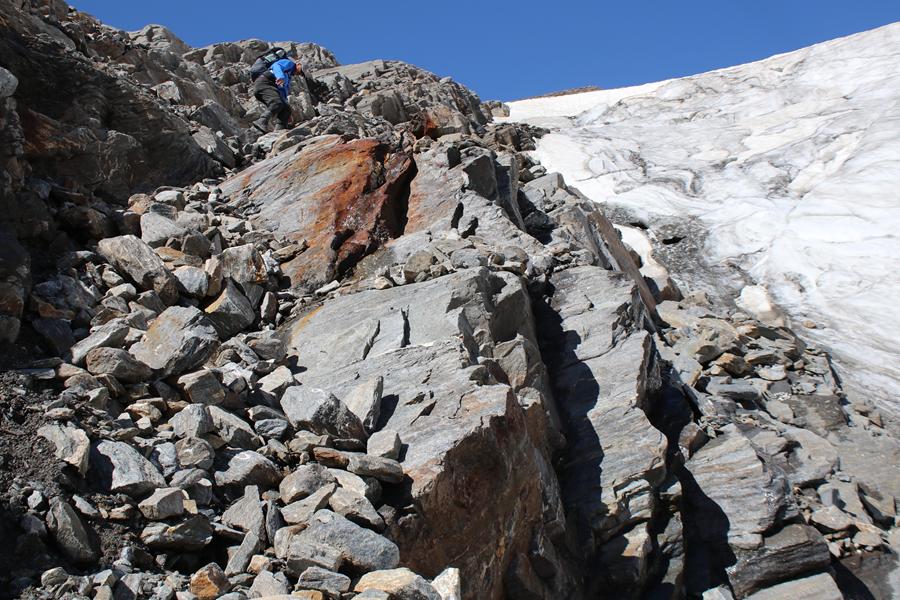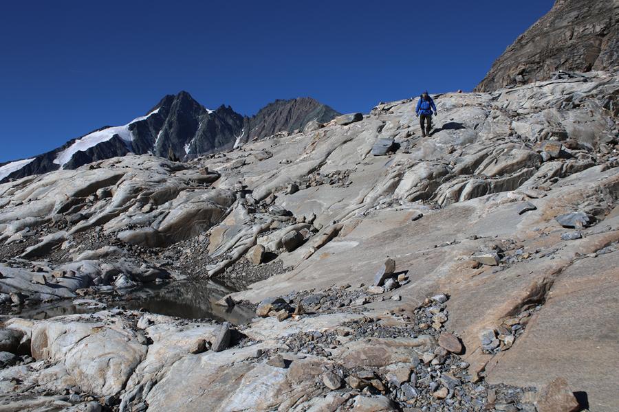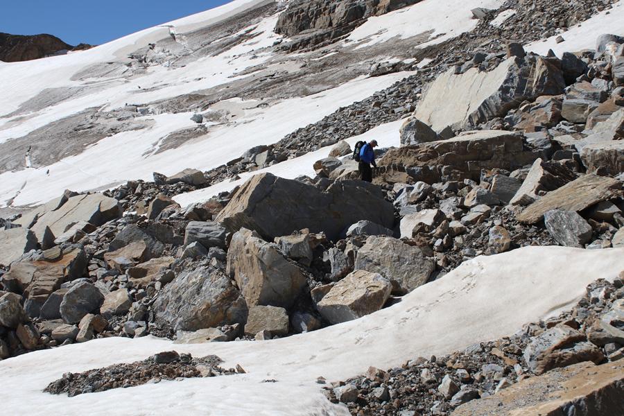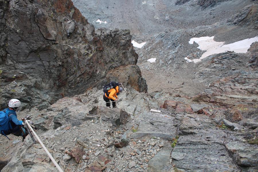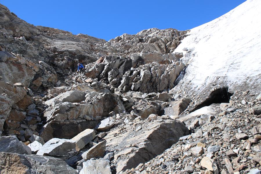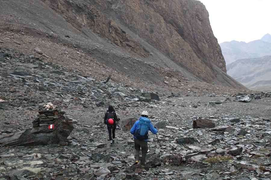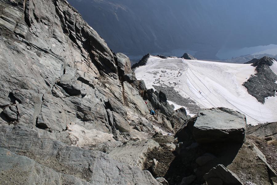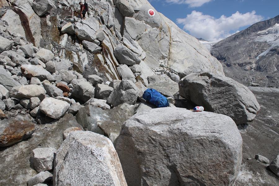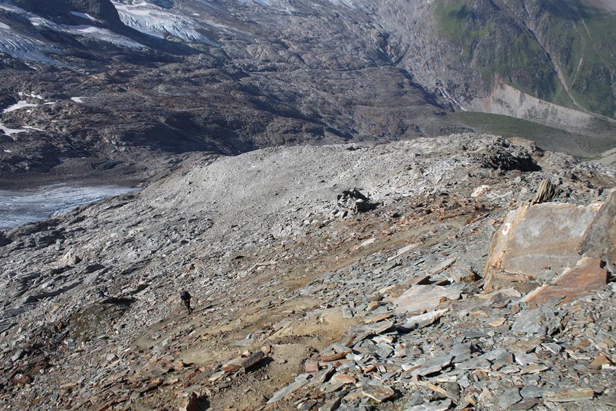 Marco ist einige Meter höher, wir können die Gletscher Ausrüstung ablegen. Etwas Unorthodox das ablegen in dieser Stelle. Bodo müht sich mit der Schlaufe der Eisen. Warte bis er soweit ist bis auch ich ablegen kann. Ein Pickel lehnt an der Wand, sicherlich hat es einen Grund. Humprey steigt zu den anderen auf. Abklopfen der Eisen so gut wie es geht, die Gummi Stöpsel auf die Zacken rein in den Beutel, da Seil ist feucht kommt zum Schluss in den Rucksack. Diese Aktionen kosten Zeit, klar das Wetter wird beobachtet noch hält es. Die Bedienung die aus Holland stammt, ist auf dem Rückweg. Die Route in dieser Schuttflanke ist unerwartet gut, eine große Blaue Metallbox steht am Boden, leichte Kletterei und Gehgelände auch Stangen zum Sichern sind Installiert, kein Wunder auf über 3000 Meter liegt in der Nordseite lange der Schnee. Es sind nur wenige Minuten bis in die Scharte 3183 m, die Wand ist sehr Brüchig daher Steinschlaggefährdet. In einer sehr breiten nicht zu steilen Rinne ist wohl ein Klettersteig Installiert. 13.18 Uhr. Marco ist auf dem Weg nach Unten Alina folgt ihm in dem Sie sich mit dem Gurt sichert. Ein letzter Blick zur Pasterze und der Oberwalder Hütte. Morgen werden wir nach einem langen Tag dort zu Gast sein. Auch Bodo setzt den Gurt ein, ein Fast durchgehendes Tau Holzstufen und Trittklammer die ganze Palette an Hilfsmittel, wie es scheint findet Alina in dieser guten unerwartet sicheren Route gefallen, sieht von der Nutzung des Gurtes ab. Klar Vorsicht wegen der Vorrausgehenden ist Voraussetzung. Die ersten sind unten ausgestiegen es flacht etwas ab. Es quert auf der Linken Seite bis fast an den Felsen. Eine Wand wird über Trittbügel abgestiegen. Eine Schuttpassage ist mit Stufen die an zwei Seile gebunden ist überwunden, Lose die letzten Meter an der Wand entlang, die Anspannung weicht. Warum eine Box vor der Scharte seine Berechtigung besitzt ist nun klar geworden. Während die anderen dem ausgeprägten Weg im Schutt folgen, nütze ich den Weichen Untergrund für einen flotten geradlinigen Abstieg, es quert leicht fallend Östlich, die Rinne wird breiter öffnet sich, hier war einst der Hohenwartkees davon ist nichts mehr übrig, geblieben. Die Orientierung ist ohne Markierungen nicht einfach, mit Weitblick findet sich ein Steinmann. Blöcke Platten Steine teils auf geschliffenen Untergrund, der Ganze Kessel ein Relikt der Erosion diese setzte hier gewaltig zu. Marco legt eine Pause, allzu lange sind wir nicht mehr Unterwegs. Jetzt können wir definitiv die Ausrüstung ablegen. Die Stimmung positiv, liegt das an einem ersten Blaues Loch im Norden. Ein Blick zurück lässt überhaupt nicht erahnen das sich ein so guter Durchstieg findet. Östlich ist nun ein Teil des Gletschers noch erhalten. Große Steinmänner sind Hilfreich, endlich endet dieser Steinbruch. Übergang in erdiges Gelände die ersten Pflanzen finden ihren Lebensraum. Es beginnt zu Tröpfeln der Schirm kommt zum ersten Mal zum Einsatz, das spricht für ein gutes Wetter die letzten Tage, nähern uns dem Schwerteckes die Hütte ist noch immer nicht zu sehen.