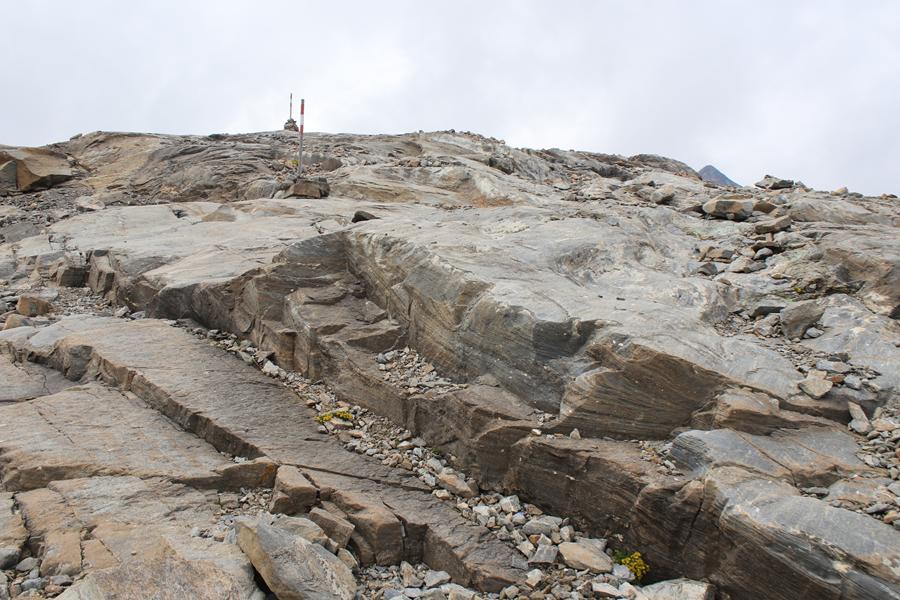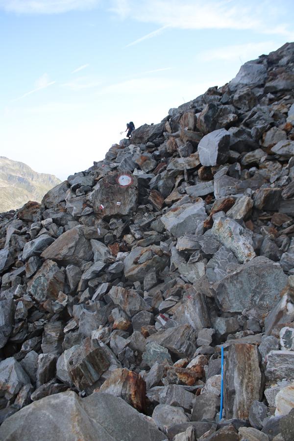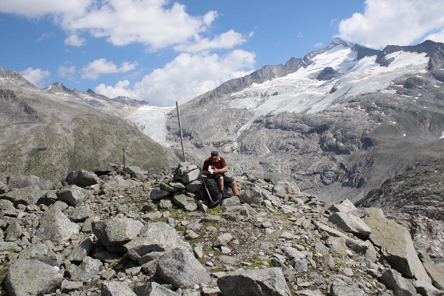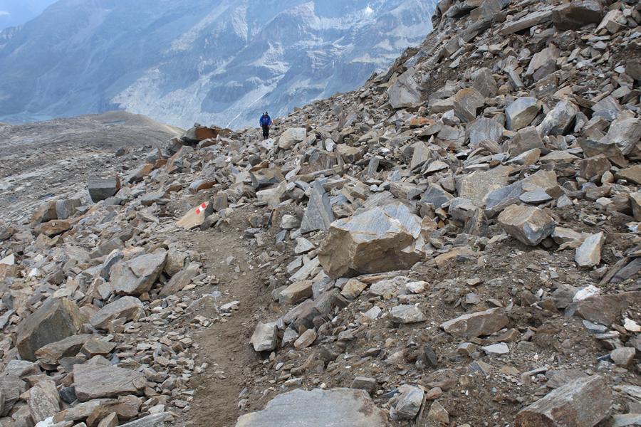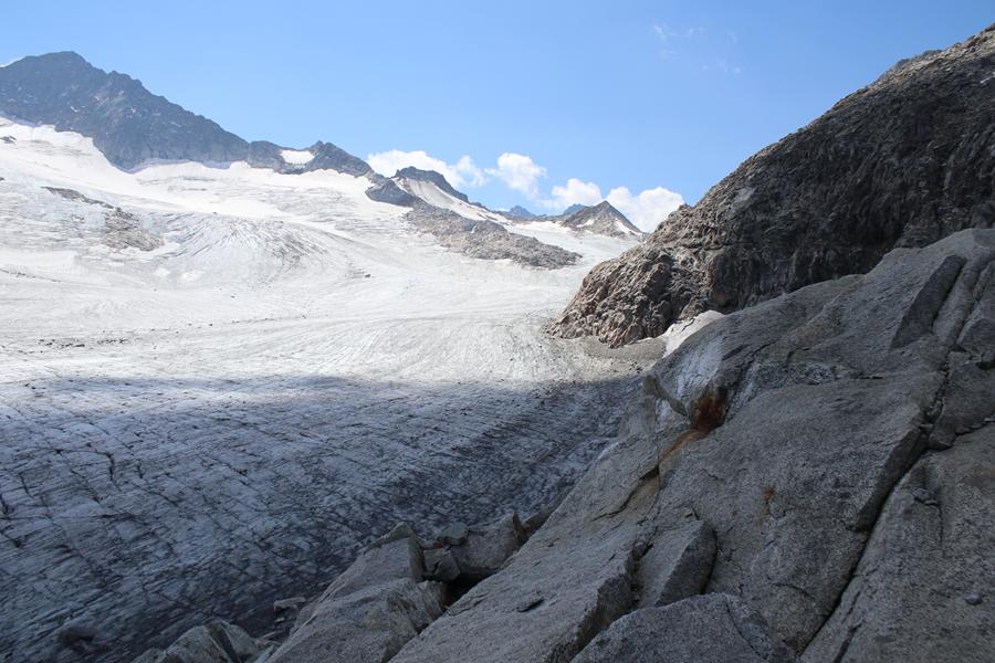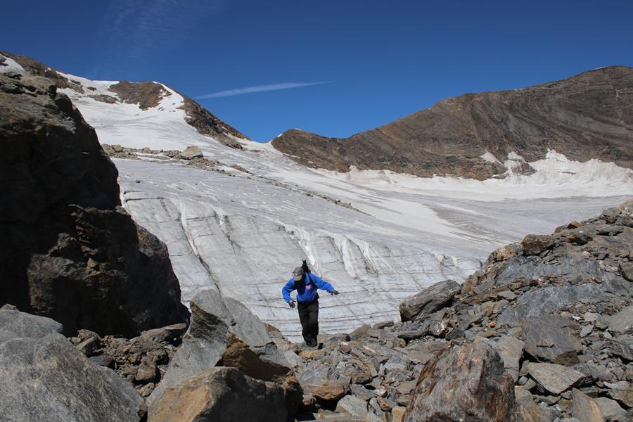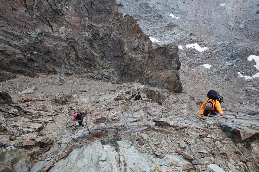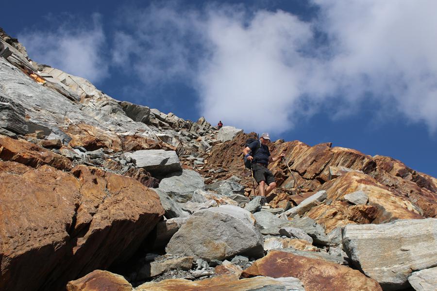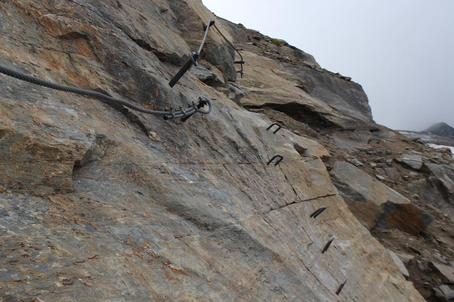 Marco ist einige Meter höher, wir können die Gletscher Ausrüstung ablegen. Etwas Unorthodox das ablegen in dieser Stelle. Bodo müht sich mit der Schlaufe der Eisen. Warte bis er soweit ist bis auch ich ablegen kann. Ein Pickel lehnt an der Wand, sicherlich hat es einen Grund. Humprey steigt zu den anderen auf. Abklopfen der Eisen so gut wie es geht, die Gummi Stöpsel auf die Zacken rein in den Beutel, da Seil ist feucht kommt zum Schluss in den Rucksack. Diese Aktionen kosten Zeit, klar das Wetter wird beobachtet noch hält es. Die Bedienung die aus Holland stammt, ist auf dem Rückweg. Die Route in dieser Schuttflanke ist unerwartet gut, eine große Blaue Metallbox steht am Boden, leichte Kletterei und Gehgelände auch Stangen zum Sichern sind Installiert, kein Wunder auf über 3000 Meter liegt in der Nordseite lange der Schnee. Es sind nur wenige Minuten bis in die Scharte 3183 m, die Wand ist sehr Brüchig daher Steinschlaggefährdet. In einer sehr breiten nicht zu steilen Rinne ist wohl ein Klettersteig Installiert. 13.18 Uhr. Marco ist auf dem Weg nach Unten Alina folgt ihm in dem Sie sich mit dem Gurt sichert. Ein letzter Blick zur Pasterze und der Oberwalder Hütte. Morgen werden wir nach einem langen Tag dort zu Gast sein. Auch Bodo setzt den Gurt ein, ein Fast durchgehendes Tau Holzstufen und Trittklammer die ganze Palette an Hilfsmittel, wie es scheint findet Alina in dieser guten unerwartet sicheren Route gefallen, sieht von der Nutzung des Gurtes ab. Klar Vorsicht wegen der Vorrausgehenden ist Voraussetzung. Die ersten sind unten ausgestiegen es flacht etwas ab. Es quert auf der Linken Seite bis fast an den Felsen. Eine Wand wird über Trittbügel abgestiegen. Eine Schuttpassage ist mit Stufen die an zwei Seile gebunden ist überwunden, Lose die letzten Meter an der Wand entlang, die Anspannung weicht. Warum eine Box vor der Scharte seine Berechtigung besitzt ist nun klar geworden. Während die anderen dem ausgeprägten Weg im Schutt folgen, nütze ich den Weichen Untergrund für einen flotten geradlinigen Abstieg, es quert leicht fallend Östlich, die Rinne wird breiter öffnet sich, hier war einst der Hohenwartkees davon ist nichts mehr übrig, geblieben. Die Orientierung ist ohne Markierungen nicht einfach, mit Weitblick findet sich ein Steinmann. Blöcke Platten Steine teils auf geschliffenen Untergrund, der Ganze Kessel ein Relikt der Erosion diese setzte hier gewaltig zu. Marco legt eine Pause, allzu lange sind wir nicht mehr Unterwegs. Jetzt können wir definitiv die Ausrüstung ablegen. Die Stimmung positiv, liegt das an einem ersten Blaues Loch im Norden. Ein Blick zurück lässt überhaupt nicht erahnen das sich ein so guter Durchstieg findet. Östlich ist nun ein Teil des Gletschers noch erhalten. Große Steinmänner sind Hilfreich, endlich endet dieser Steinbruch. Übergang in erdiges Gelände die ersten Pflanzen finden ihren Lebensraum. Es beginnt zu Tröpfeln der Schirm kommt zum ersten Mal zum Einsatz, das spricht für ein gutes Wetter die letzten Tage, nähern uns dem Schwerteckes die Hütte ist noch immer nicht zu sehen.