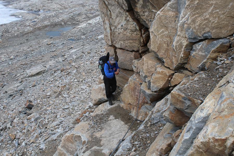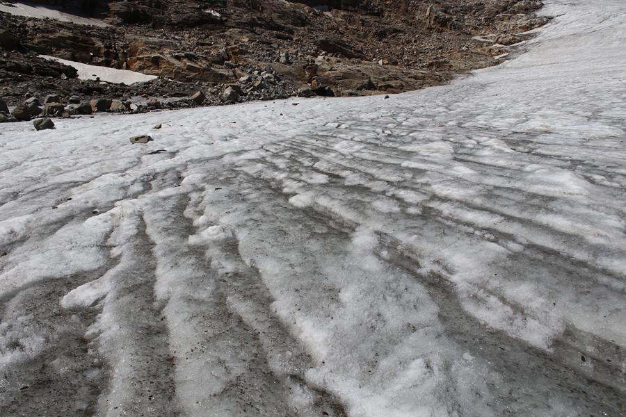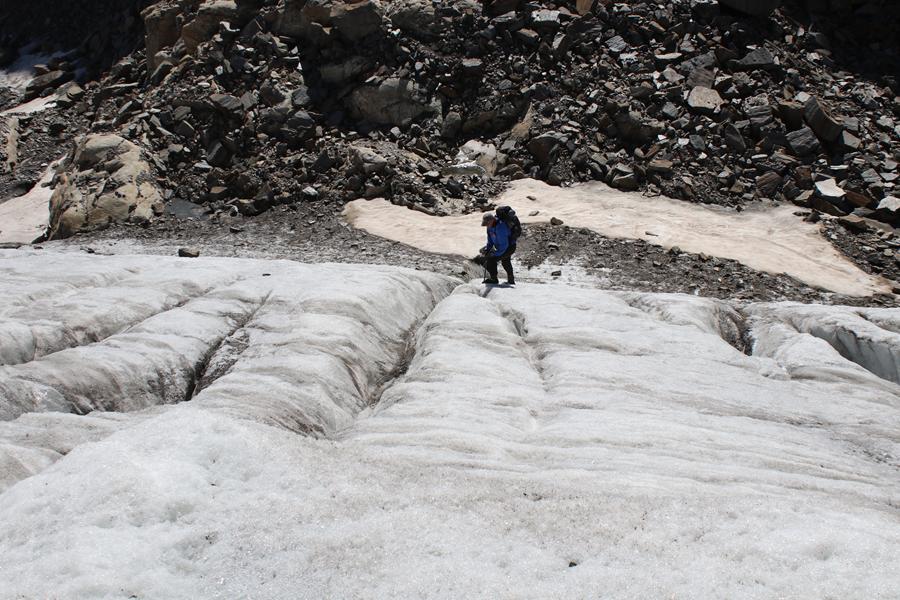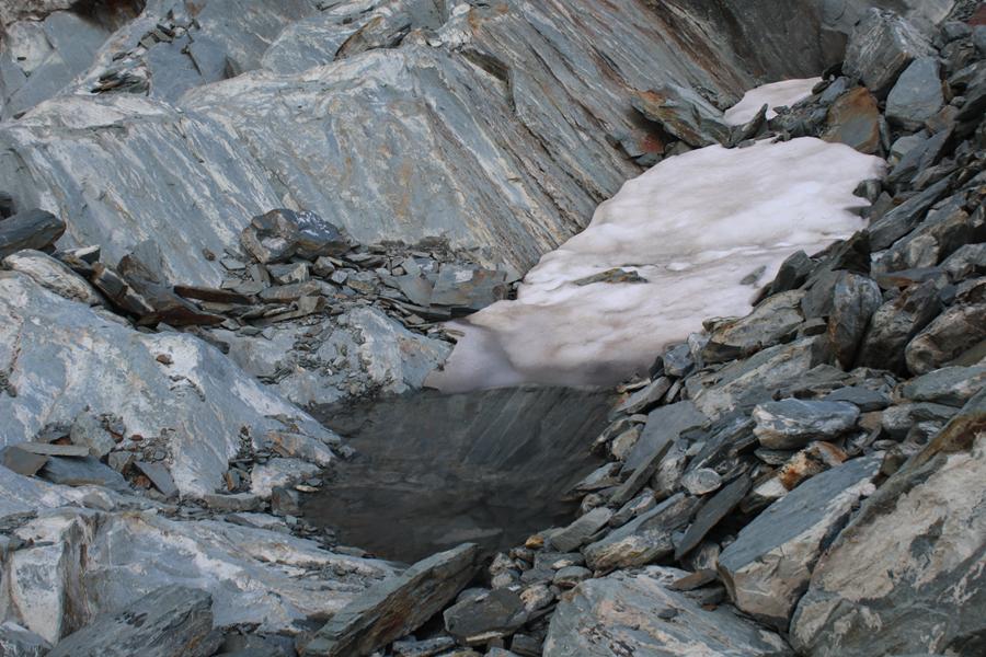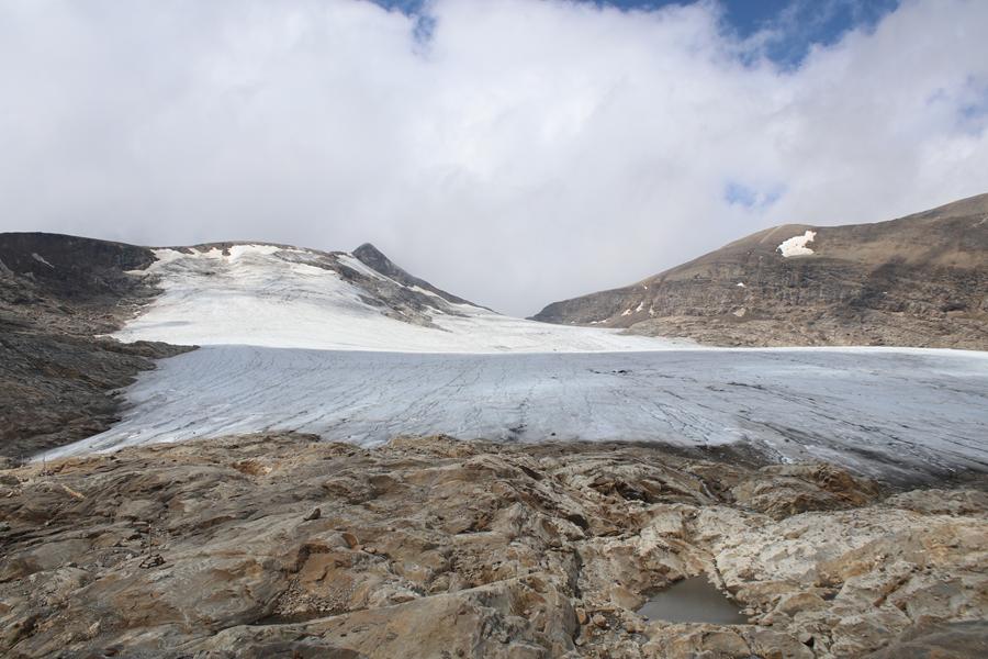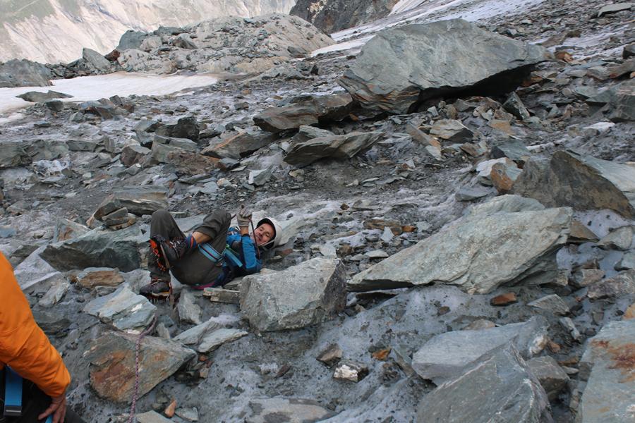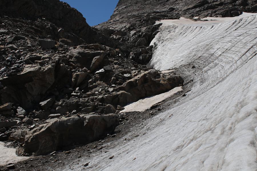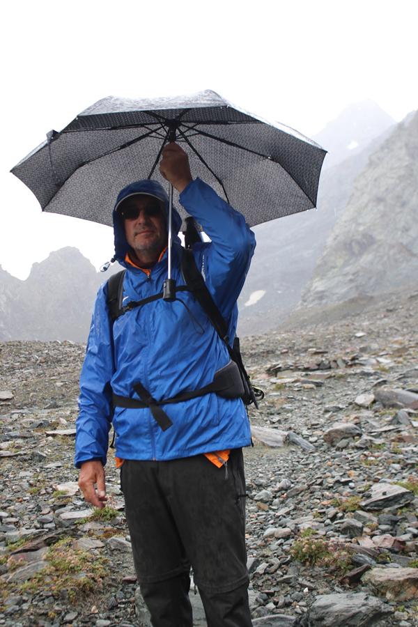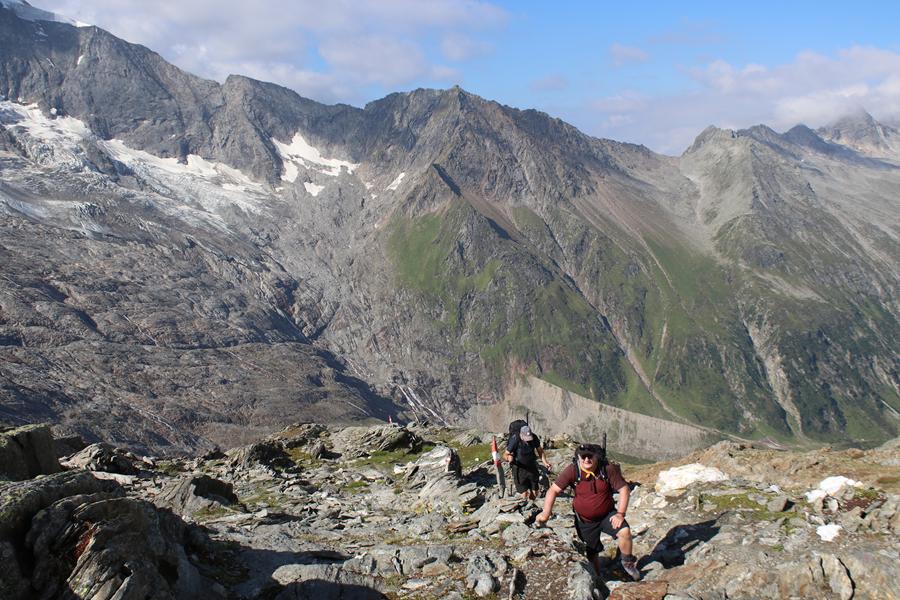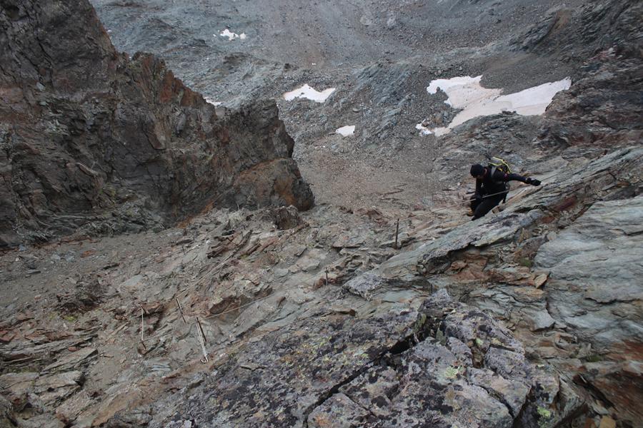 Marco ist einige Meter höher, wir können die Gletscher Ausrüstung ablegen. Etwas Unorthodox das ablegen in dieser Stelle. Bodo müht sich mit der Schlaufe der Eisen. Warte bis er soweit ist bis auch ich ablegen kann. Ein Pickel lehnt an der Wand, sicherlich hat es einen Grund. Humprey steigt zu den anderen auf. Abklopfen der Eisen so gut wie es geht, die Gummi Stöpsel auf die Zacken rein in den Beutel, da Seil ist feucht kommt zum Schluss in den Rucksack. Diese Aktionen kosten Zeit, klar das Wetter wird beobachtet noch hält es. Die Bedienung die aus Holland stammt, ist auf dem Rückweg. Die Route in dieser Schuttflanke ist unerwartet gut, eine große Blaue Metallbox steht am Boden, leichte Kletterei und Gehgelände auch Stangen zum Sichern sind Installiert, kein Wunder auf über 3000 Meter liegt in der Nordseite lange der Schnee. Es sind nur wenige Minuten bis in die Scharte 3183 m, die Wand ist sehr Brüchig daher Steinschlaggefährdet. In einer sehr breiten nicht zu steilen Rinne ist wohl ein Klettersteig Installiert. 13.18 Uhr. Marco ist auf dem Weg nach Unten Alina folgt ihm in dem Sie sich mit dem Gurt sichert. Ein letzter Blick zur Pasterze und der Oberwalder Hütte. Morgen werden wir nach einem langen Tag dort zu Gast sein. Auch Bodo setzt den Gurt ein, ein Fast durchgehendes Tau Holzstufen und Trittklammer die ganze Palette an Hilfsmittel, wie es scheint findet Alina in dieser guten unerwartet sicheren Route gefallen, sieht von der Nutzung des Gurtes ab. Klar Vorsicht wegen der Vorrausgehenden ist Voraussetzung. Die ersten sind unten ausgestiegen es flacht etwas ab. Es quert auf der Linken Seite bis fast an den Felsen. Eine Wand wird über Trittbügel abgestiegen. Eine Schuttpassage ist mit Stufen die an zwei Seile gebunden ist überwunden, Lose die letzten Meter an der Wand entlang, die Anspannung weicht. Warum eine Box vor der Scharte seine Berechtigung besitzt ist nun klar geworden. Während die anderen dem ausgeprägten Weg im Schutt folgen, nütze ich den Weichen Untergrund für einen flotten geradlinigen Abstieg, es quert leicht fallend Östlich, die Rinne wird breiter öffnet sich, hier war einst der Hohenwartkees davon ist nichts mehr übrig, geblieben. Die Orientierung ist ohne Markierungen nicht einfach, mit Weitblick findet sich ein Steinmann. Blöcke Platten Steine teils auf geschliffenen Untergrund, der Ganze Kessel ein Relikt der Erosion diese setzte hier gewaltig zu. Marco legt eine Pause, allzu lange sind wir nicht mehr Unterwegs. Jetzt können wir definitiv die Ausrüstung ablegen. Die Stimmung positiv, liegt das an einem ersten Blaues Loch im Norden. Ein Blick zurück lässt überhaupt nicht erahnen das sich ein so guter Durchstieg findet. Östlich ist nun ein Teil des Gletschers noch erhalten. Große Steinmänner sind Hilfreich, endlich endet dieser Steinbruch. Übergang in erdiges Gelände die ersten Pflanzen finden ihren Lebensraum. Es beginnt zu Tröpfeln der Schirm kommt zum ersten Mal zum Einsatz, das spricht für ein gutes Wetter die letzten Tage, nähern uns dem Schwerteckes die Hütte ist noch immer nicht zu sehen.