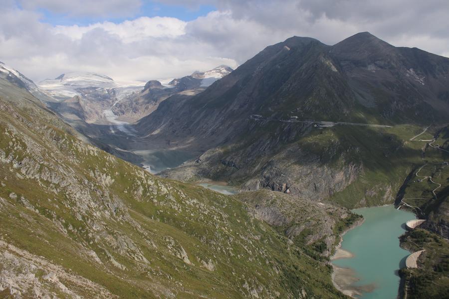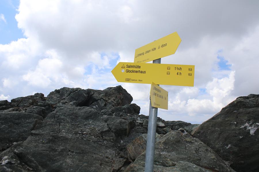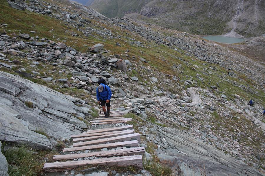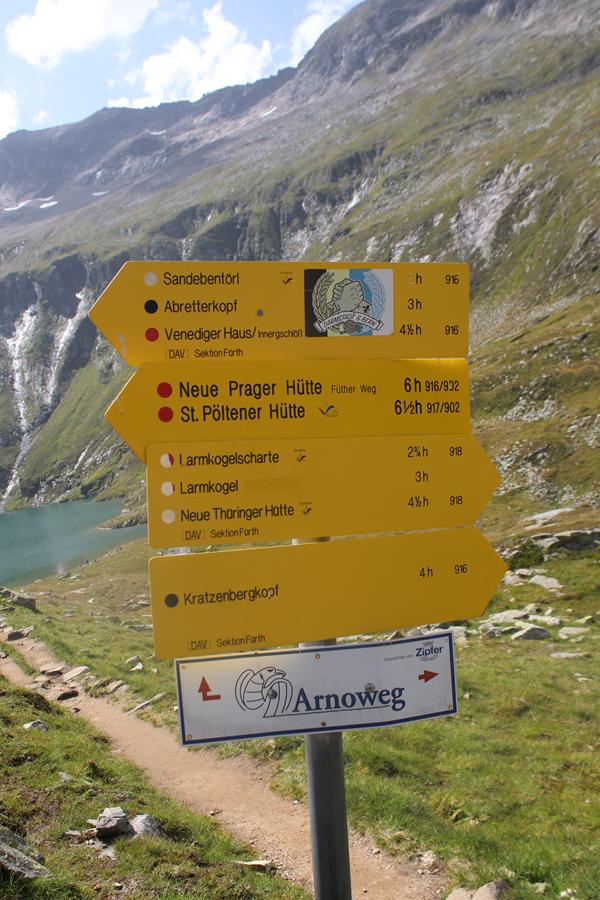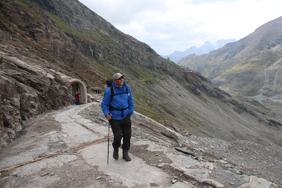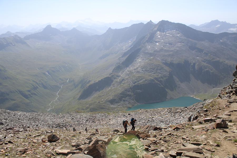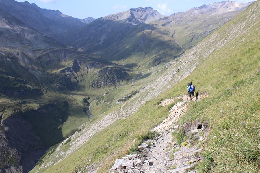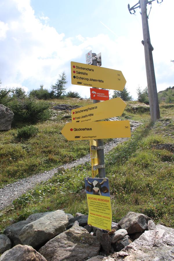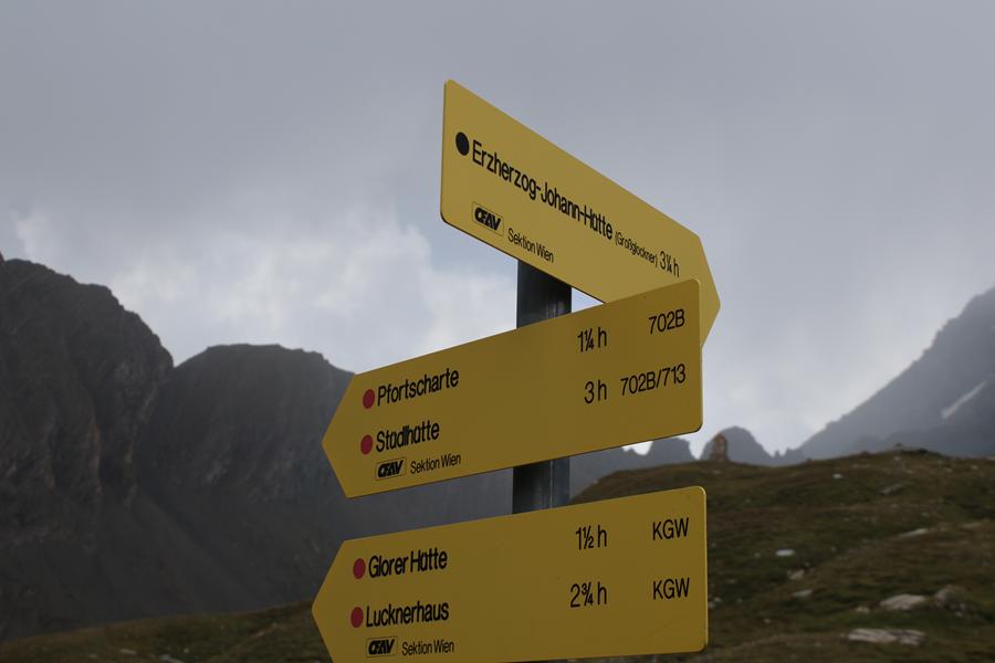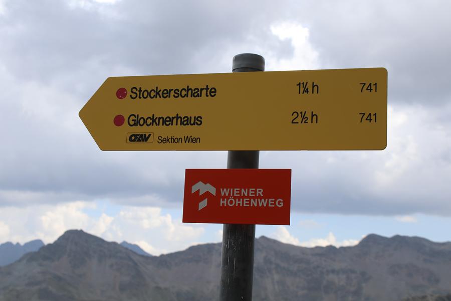 8.37 Uhr, Humprey öffnet das Gatter, ein Holzzaun um das Areal soll die Tiere fernhalten. Jetzt 4 Monate nach der Tour, ist klar geworden was Marco mit der Aussage, gleich zu Beginn des Gletschers zum Ausdruck bringen wollte, wenn einer Stürzt gefährdet er auch andere. Wenn ich das Umlege, sollte ein jeder in einem Gelände I-II befähigt sein, dies allein zu Meistern. Technisch sicherlich kein Problem. 8.37 Uhr, Humprey öffnet das Gatter, ein Holzzaun um das Areal soll die Tiere fernhalten. Ein Teilstück des Wiener Höhenweg liegt vor uns. Leider ist die Route zur Glorer Hütte nicht einsehbar, wäre Wissenswert gewesen wo sie sich gerade befinden. Der gute Weg im Hang noch unter der Vegetation Grenze verläuft unter dem Schwerteck und Schwertkopf dem Drittem und Zweiter Leiterkopf. Wissend das Nördlich die Franz-Josefs-Höhe liegt, ja die Etappe verläuft in einem sehr großen Bogen um diese Gipfel. Der Hang wird steiler, ein Wanderer mit dem Trikot des FC Heidenheim begegnet. Kurze Unterhaltung er und die Freundin sind Wanderer. Grau im Osten während es hier Aufgelockert ist. Tief unten der Leiterbach. Bewegen uns deutlich über der Baumgrenze. Vereinzelt Weiden Schafe Oberhalb des Weges. In einem linksbogen steigt es längere Zeit an, wohl wegen der Steilheit auch leicht ausgesetzt ist dieser Weg in den Angaben Rot Markiert. Anstrengend der Weg 741 in die Stockerscharte 2501 m. Da wurde nicht zu viel versprochen Herrlich die Aussicht nach Norden, Großglockner, Franz-Josephs-Höhe und Großglockner-Hochalpenstraße tief unten der Margaritzenstausee 2000 m. Gegenüber das Glocknerhaus und Hochalpenstraße bis zur Franz-Josefs-Höhe. Zeitgleich treffen Aufsteigende ein. Der Weg im Hang ist nicht Einsehbar könnte Spannend werden. Als Humprey eintrifft ist auch er ganz angetan, jedenfalls Wissen wir nun was uns heute bevorsteht. Wir haben hier ein Netz es seien etliche Nachrichten eingegangen. Sprechen uns kurz über die Route ab. Alternativ über das Glockner Haus, allein schon wegen der Pracht der Natur ist die Alternative keine. Der Abstieg kann nicht Langweilig, interessant die Wegführung, im Abstieg ist das ganz Ok, weniger störend der Wind da, die Temperatur zulegt. Kurz vor dem Stausee legen wir eine Pause zum Trinken ein. Eine Weg Tafel vor dem Stausee, der Gletscherweg verläuft links. Füllen und Trinken Wasser aus einem kleinen Bach. Erste Bäume nach 3 Tage in der Höhe. Wäre da nicht die Hochalpenstraße ein Idyllischer wie ruhiger Ort. Der Adria Wanderweg ist Top Rot-Weis Markiert, ein Anstieg setzt zu, wie gerufen über kommt eine Künstlich Holzrinne das Wasser fließt in einen Holzbrunnen, auch diese Gelegenheit wird zum Trinken genützt. Der Elisabethfelsen bleibt rechts liegen.