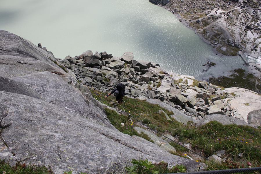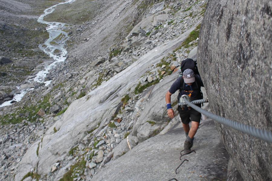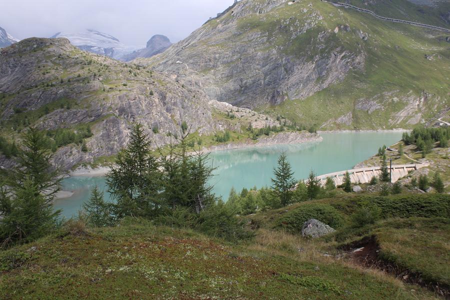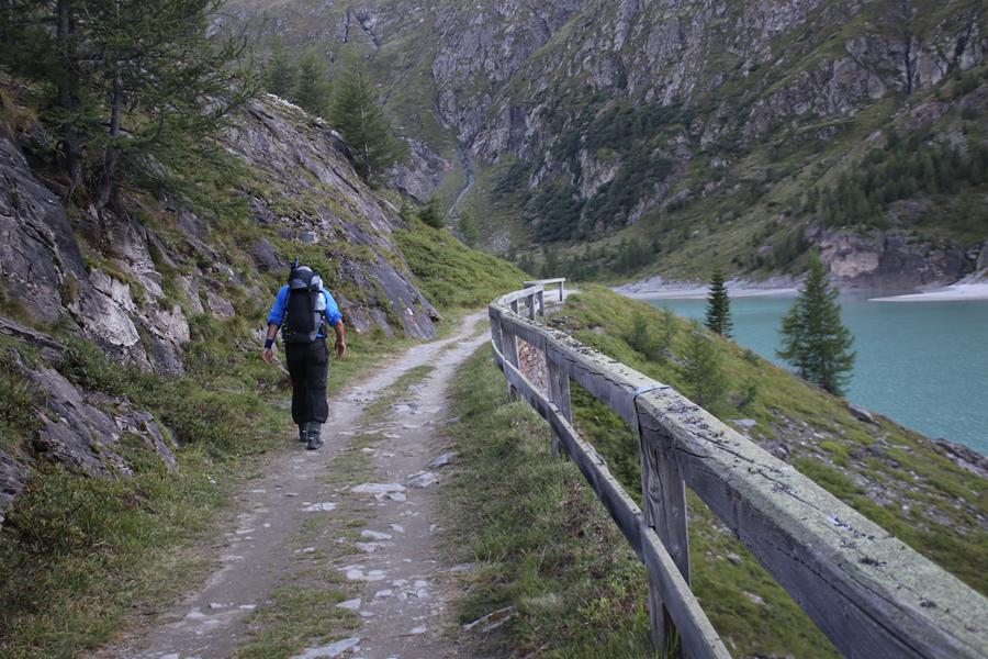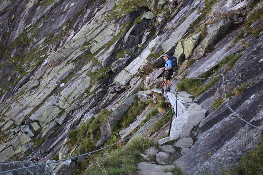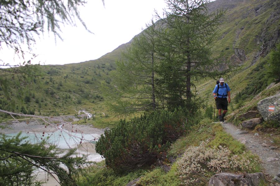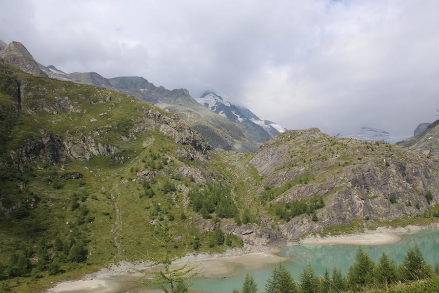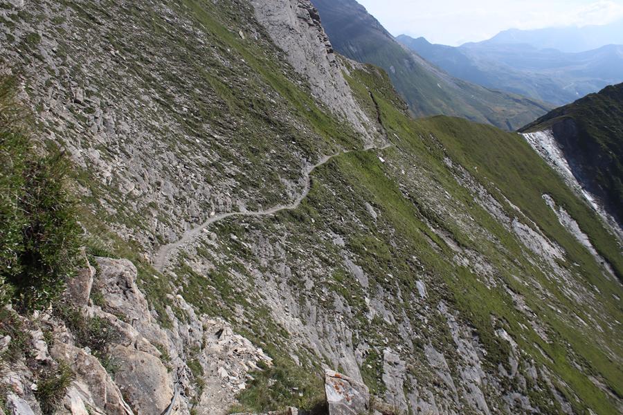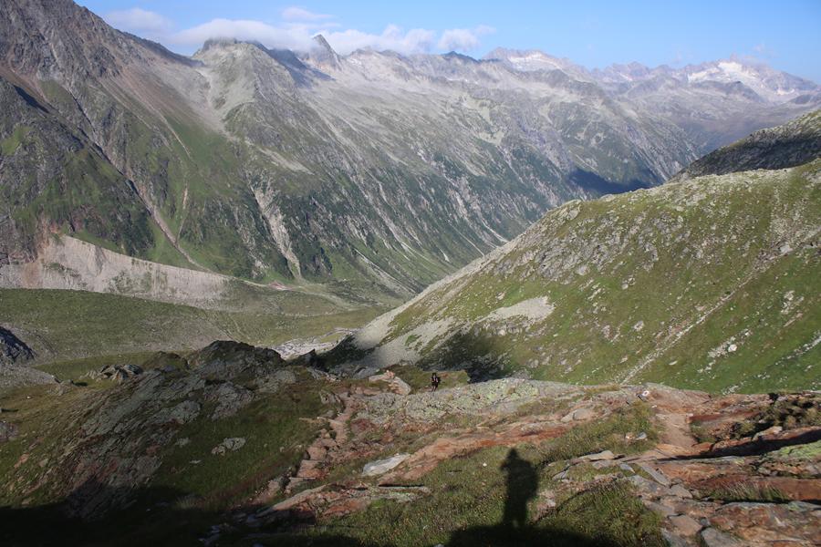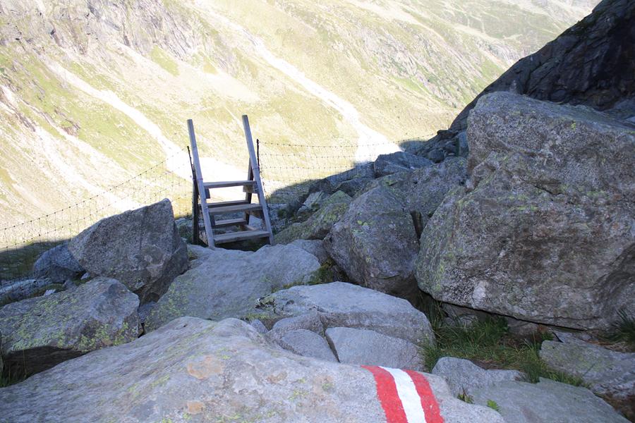 8.37 Uhr, Humprey öffnet das Gatter, ein Holzzaun um das Areal soll die Tiere fernhalten. Jetzt 4 Monate nach der Tour, ist klar geworden was Marco mit der Aussage, gleich zu Beginn des Gletschers zum Ausdruck bringen wollte, wenn einer Stürzt gefährdet er auch andere. Wenn ich das Umlege, sollte ein jeder in einem Gelände I-II befähigt sein, dies allein zu Meistern. Technisch sicherlich kein Problem. 8.37 Uhr, Humprey öffnet das Gatter, ein Holzzaun um das Areal soll die Tiere fernhalten. Ein Teilstück des Wiener Höhenweg liegt vor uns. Leider ist die Route zur Glorer Hütte nicht einsehbar, wäre Wissenswert gewesen wo sie sich gerade befinden. Der gute Weg im Hang noch unter der Vegetation Grenze verläuft unter dem Schwerteck und Schwertkopf dem Drittem und Zweiter Leiterkopf. Wissend das Nördlich die Franz-Josefs-Höhe liegt, ja die Etappe verläuft in einem sehr großen Bogen um diese Gipfel. Der Hang wird steiler, ein Wanderer mit dem Trikot des FC Heidenheim begegnet. Kurze Unterhaltung er und die Freundin sind Wanderer. Grau im Osten während es hier Aufgelockert ist. Tief unten der Leiterbach. Bewegen uns deutlich über der Baumgrenze. Vereinzelt Weiden Schafe Oberhalb des Weges. In einem linksbogen steigt es längere Zeit an, wohl wegen der Steilheit auch leicht ausgesetzt ist dieser Weg in den Angaben Rot Markiert. Anstrengend der Weg 741 in die Stockerscharte 2501 m. Da wurde nicht zu viel versprochen Herrlich die Aussicht nach Norden, Großglockner, Franz-Josephs-Höhe und Großglockner-Hochalpenstraße tief unten der Margaritzenstausee 2000 m. Gegenüber das Glocknerhaus und Hochalpenstraße bis zur Franz-Josefs-Höhe. Zeitgleich treffen Aufsteigende ein. Der Weg im Hang ist nicht Einsehbar könnte Spannend werden. Als Humprey eintrifft ist auch er ganz angetan, jedenfalls Wissen wir nun was uns heute bevorsteht. Wir haben hier ein Netz es seien etliche Nachrichten eingegangen. Sprechen uns kurz über die Route ab. Alternativ über das Glockner Haus, allein schon wegen der Pracht der Natur ist die Alternative keine. Der Abstieg kann nicht Langweilig, interessant die Wegführung, im Abstieg ist das ganz Ok, weniger störend der Wind da, die Temperatur zulegt. Kurz vor dem Stausee legen wir eine Pause zum Trinken ein. Eine Weg Tafel vor dem Stausee, der Gletscherweg verläuft links. Füllen und Trinken Wasser aus einem kleinen Bach. Erste Bäume nach 3 Tage in der Höhe. Wäre da nicht die Hochalpenstraße ein Idyllischer wie ruhiger Ort. Der Adria Wanderweg ist Top Rot-Weis Markiert, ein Anstieg setzt zu, wie gerufen über kommt eine Künstlich Holzrinne das Wasser fließt in einen Holzbrunnen, auch diese Gelegenheit wird zum Trinken genützt. Der Elisabethfelsen bleibt rechts liegen.