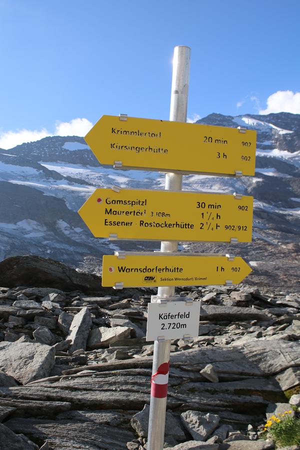 Begleichen der Rechnung das Lager 14 €, ja die Preise ziehen jedes Jahr an, das AV Essen 11 €, ein Bier 5,70 Hefe 5,90 €. Lege 37 € auf die Theke. Christian begleicht das Teewasser 3,50 €. Bedanken uns für die Bewirtung. Allgemeine Aufbruchstimmung, es ist 8.30 Uhr, 7 Minuten später starten wir auf der Ostseite, die Aufgehende Sonne erzeugt einen sehr langen Schatten, 13 °C das ist Ordentlich, 1 ¼ Std bis zur Gamsspitzl 2888 m. Leichter Rückenwind aus Süd West. Eins passt schon mal, Christian hat seinen Worten zum Glück nicht Taten folgen lassen. In dieser Rauen Bergwelt ist Wille und Durchhaltevermögen eine Tugend. Diese Etappe ist nun die Fortsetzung von 2019, verbindet diese mit 2024. Schmal der Weg der gleich fordert, Rot Weiß die Markierungen, die App zeichnet die Route auf. Relativ viel Grün, Trocken der Untergrund, das Gelände fordert. Wähle wissend um die Begleiter einen sehr Moderaten Schritt. Christian stellt es ständig hin, als bald ist die Hütte den Blicken entschwunden. Rechts die immer noch imposanten Ausläufer des Krimmlerkees, in einer Senke wird ein Gletschersee Sichtbar, der zum Tal von einer Moräne begrenzt wird diese sieht aus wie eine Künstliche Mauer. Ziel orientiert dem höchsten Punkt des Tages entgegen. Ein Paar ohne Gepäck zieht locker vorbei. Weg Tafel im Käferfeld 2720 m. Es ist jetzt 9.54 Uhr, bei besten Bedingungen. Das Überrascht, zur Essener Rostocker Hütte sind es nur 2 ¾ Std. 3 Std. bis zur Kürsinger, 30 Min. bis zur Markanten Gamsspitzl, ein Schutthaufen der schon Greifbar scheint. Der Rucksack lastet schwer, wenn das auf das Körper Gewicht umgelegt wird, Trage ich die schwerste Last, das verhält sich wie beim Essen, Christian verdient eine größere Portion als Humprey und so weiter…. Mit dem näherkommen ändert sich die Einschätzung. Es wechselt in die Südseite, dann in Nördlicher Richtung. Es läuft sich besser als Gedacht ein doch guter wenn auch schmaler Weg auf den Hausberg der Hütte.