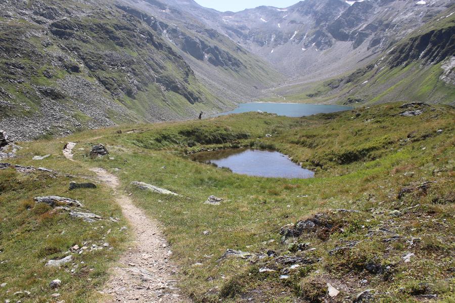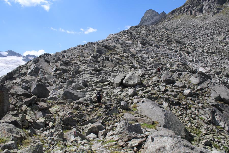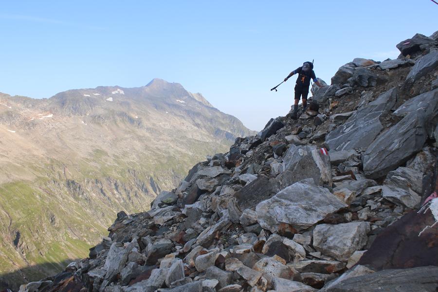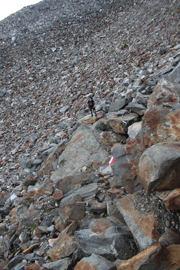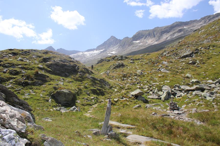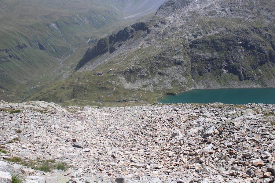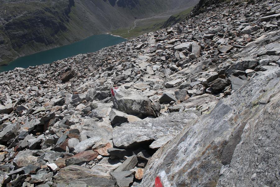 Wenige Schlieren Wolken deuten den Wetter Wechsel an. Mittlerer weile sind wir Hellwach wobei die Schultern zu spüren sind. Es ist 6.23 Uhr geworden, es geht gleich Bergauf ein guter Weg im noch satten Grünen. Eine Kleine Kapelle und zwei kleinere Gebäude stehen etwas Oberhalb in Reihe angeordnet. Alsbald ist die Hütte nicht mehr sichtbar. Dafür der See der den Hang ohne jegliche Bewegung spiegelt. Die Sonne erreicht den Hang gegenüber. Das Tempo das ich vorlege absolut Moderat gewählt. Eine Rampe bricht Steil ab, der Weg kann wohl nur Oberhalb verlaufen, so kommt es dann auch, es steigt mit jedem Schritt an, das Gelände ändert sich je näher der Abretterkopf ein knapp 3000er kommt, der Weg verläuft Anfangs durch und über Steine geht dann in Blockwerk über, mühevoll wurden von Fleißigen Steinplatten und Blöcke zurecht gelegt. Etwas Zeit verbleibt des Öfteren bis Humprey wieder aufschließt. Der Venediger zeigt sich, auch der See wird wieder Einsehbar. Die Oberarme werden wegen des Ärmellosen T-Shirt etwas kühl. Übergang in Wegloses Gelände, der Abretterkopf ein einziger Bruch, Blaue und Rote Markierungsstangen dienen der Orientierung, an Farbe wurde nicht gespart hierverlieren wir unweigerlich Zeit, ein jeder Schritt sollte überlegt sein, wie schnell kann ein Stein oder Platte kippen, die Wegführung ist gut gewählt ohne Höhe zu verlieren. Steinschlag gefährdet eine Kritische Zone das ist wohl die der Schwarz Markierte Bereich.