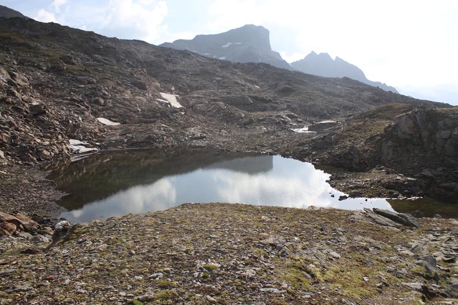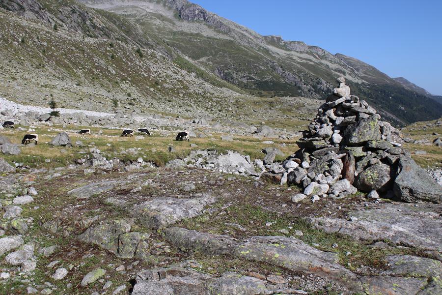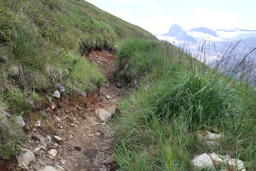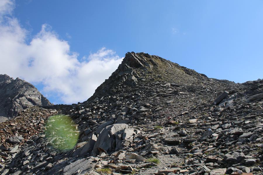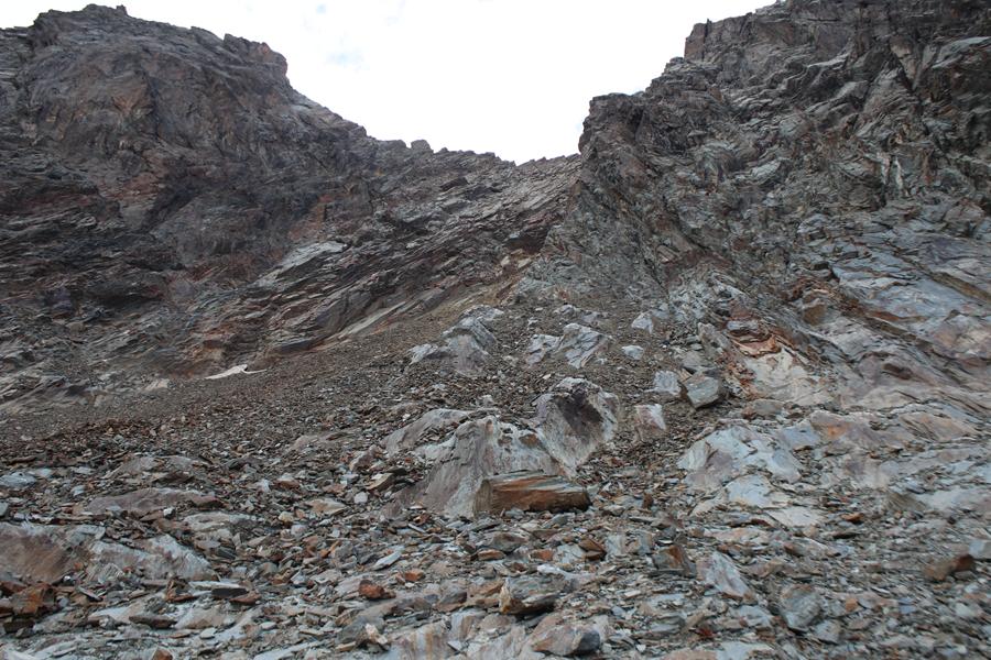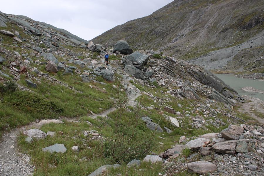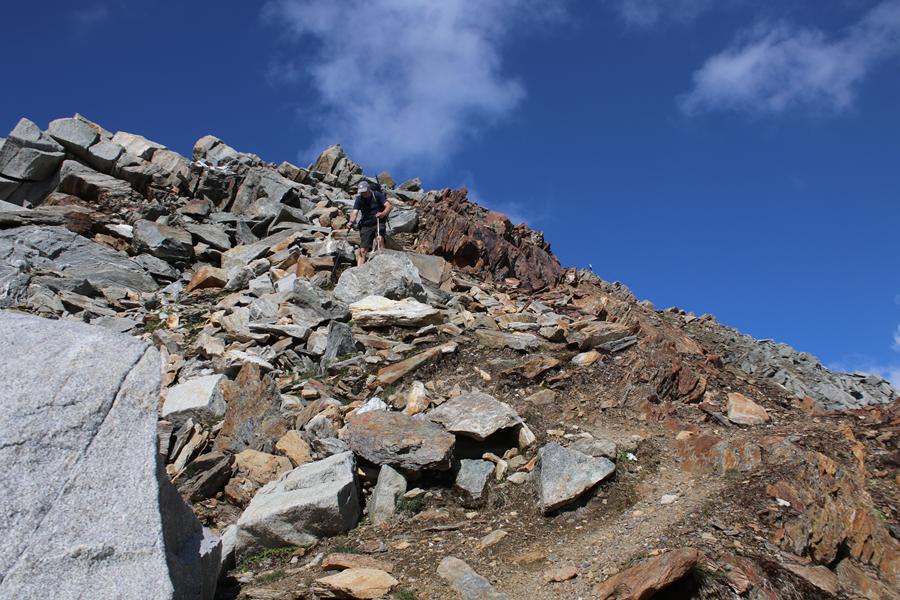 Wenige Schlieren Wolken deuten den Wetter Wechsel an. Mittlerer weile sind wir Hellwach wobei die Schultern zu spüren sind. Es ist 6.23 Uhr geworden, es geht gleich Bergauf ein guter Weg im noch satten Grünen. Eine Kleine Kapelle und zwei kleinere Gebäude stehen etwas Oberhalb in Reihe angeordnet. Alsbald ist die Hütte nicht mehr sichtbar. Dafür der See der den Hang ohne jegliche Bewegung spiegelt. Die Sonne erreicht den Hang gegenüber. Das Tempo das ich vorlege absolut Moderat gewählt. Eine Rampe bricht Steil ab, der Weg kann wohl nur Oberhalb verlaufen, so kommt es dann auch, es steigt mit jedem Schritt an, das Gelände ändert sich je näher der Abretterkopf ein knapp 3000er kommt, der Weg verläuft Anfangs durch und über Steine geht dann in Blockwerk über, mühevoll wurden von Fleißigen Steinplatten und Blöcke zurecht gelegt. Etwas Zeit verbleibt des Öfteren bis Humprey wieder aufschließt. Der Venediger zeigt sich, auch der See wird wieder Einsehbar. Die Oberarme werden wegen des Ärmellosen T-Shirt etwas kühl. Übergang in Wegloses Gelände, der Abretterkopf ein einziger Bruch, Blaue und Rote Markierungsstangen dienen der Orientierung, an Farbe wurde nicht gespart hierverlieren wir unweigerlich Zeit, ein jeder Schritt sollte überlegt sein, wie schnell kann ein Stein oder Platte kippen, die Wegführung ist gut gewählt ohne Höhe zu verlieren. Steinschlag gefährdet eine Kritische Zone das ist wohl die der Schwarz Markierte Bereich.