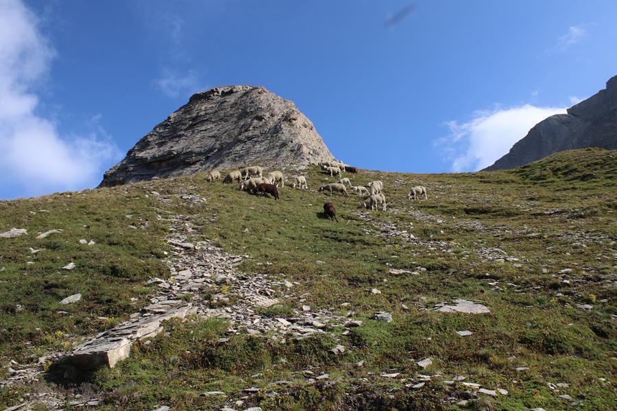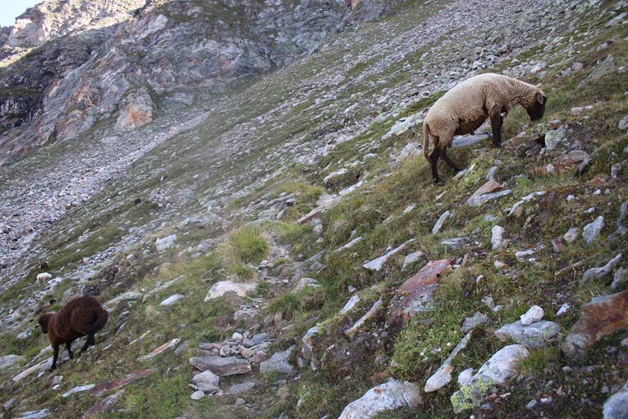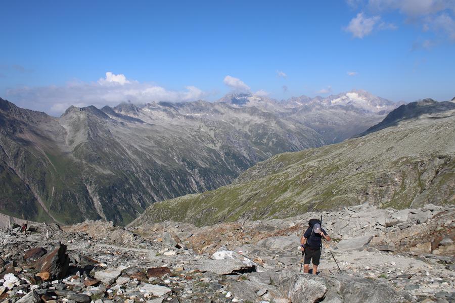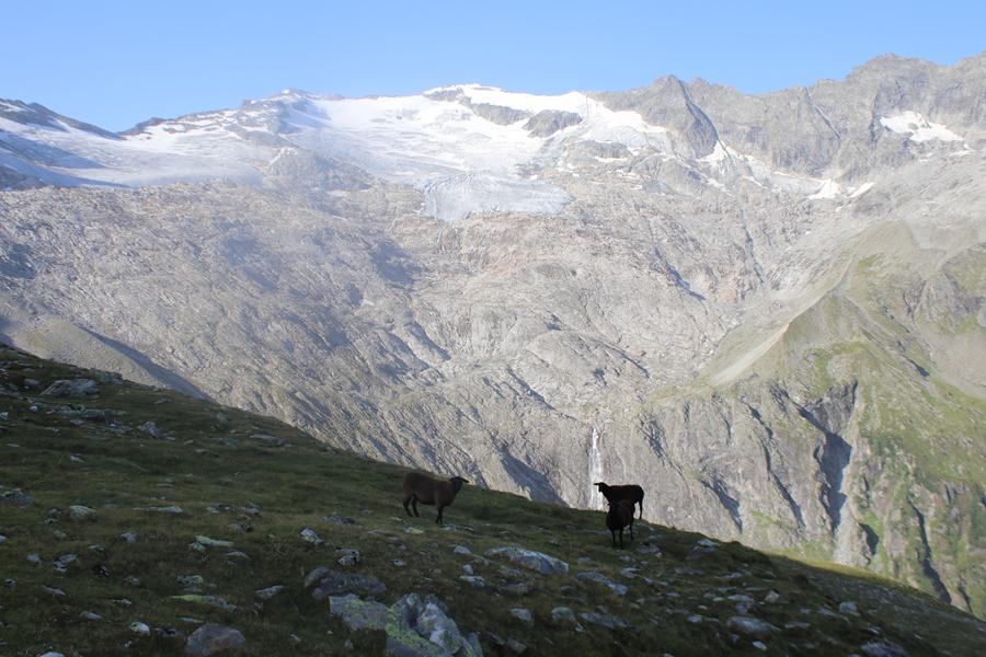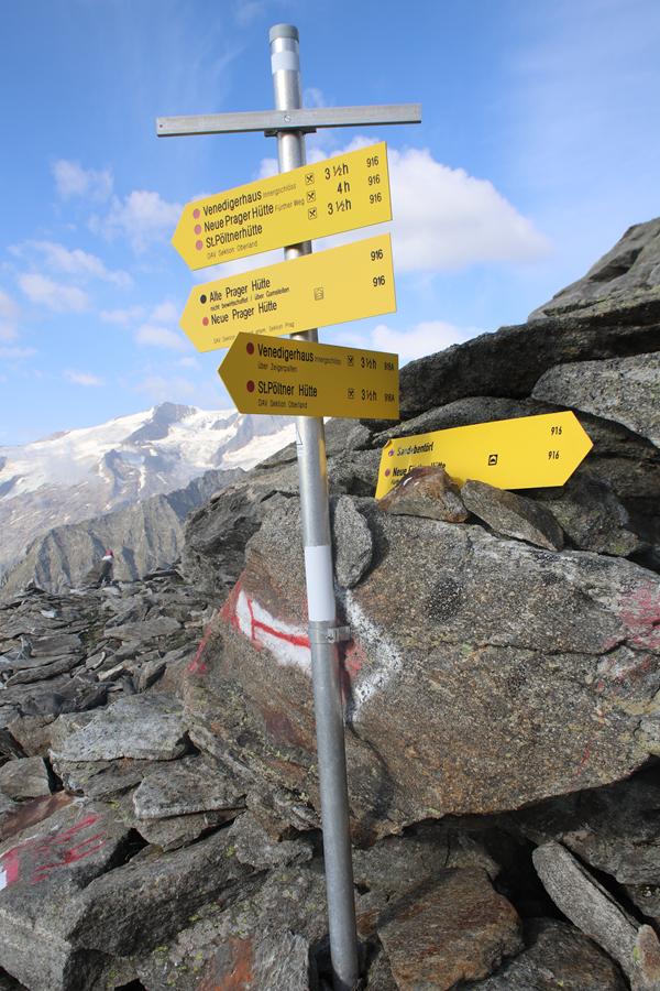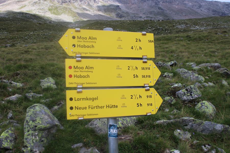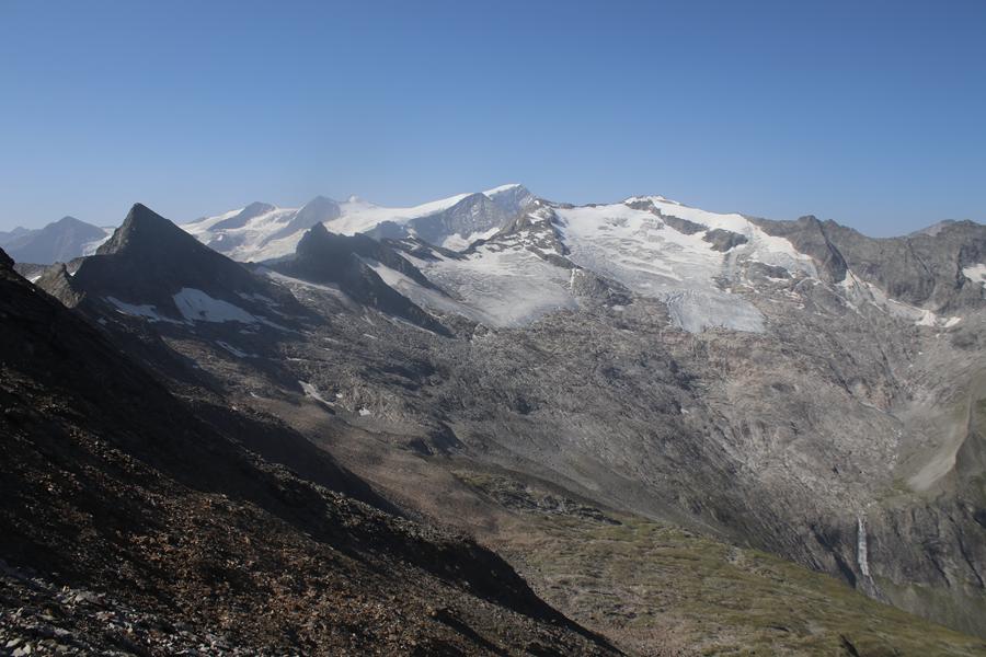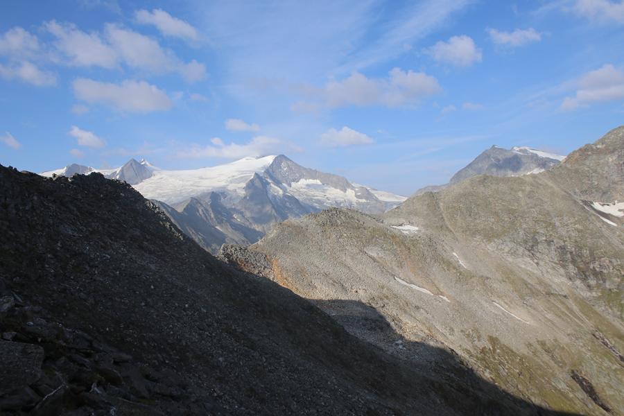 Laut Wetterbericht steigt ab Morgen die Gewitter Gefahr. Das Sympathische Ehepaar verfolgt dasselbe Ziel wie wir, sie kalkulieren mit 4 Std. Sie starten um 7.50 Uhr. Humprey packt seinen Rucksack. Kurz vor 8 Uhr, tue ich ihm gleich. Zum Abschluss begleichen wir die Rechnung, 3 € für das Teewasser 1 € das Brot. Bedanken uns für die Gastfreundschaft. Mehrere Gäste starten Richtung Tal. Zügig verläuft das packen. Der Pickel und die Schuhe aus dem Schuhraum bilden den Abschluss. Geburtstags Grüße an Steffen. Um 8.20 Uhr starten ich, Humprey ist voraus, das ist nun der zweite Tag ohne Christian. Der Anstieg verläuft noch eine Gewisse Zeit im Schatten. Der Wind hatte gedreht weht nun aus Ost. An der Wegteilung erreiche ich ihn. Die Kulisse hat schon etwas, gerne wären wir vor 20 Jahren hier gewesen, etlich der Eismasse ist seitdem gewichen, irgendwo in Verlängerung Südlich befindet sich die von einer Lawine Zerstörte Alte Thüringer Hütte. Gut Markiert der Weg zum Hausberg über die Hochalmwiesen. Die Sonne geht gleich südlich des Larmkogel auf, die Strahlen stören jetzt schon beim Knipsen. Flach der Puls ob des gemachen Anstiegs. Relativ geradlinig, wie vermutet wird ein steiler Hang rechts vermieden. Weit verteilt grasen die Typischen Schwarz und Weiße Schafe. Ein Bach wird überschritten, wie geschaffen für eine Trinkpause fülle gleich die Wasserflasche. Die Steine Säumen mehr und mehr den Hang, es wird etwas steiler, Serpentinen nehmen die Steigung, die Route verlagert wieder leicht nach links, beim Blick zurück sind wir in Verlängerung zur Hütte. Humprey zollt Tribut, er kann die Konstanz nicht lange halten. Das Ehepaar läuft auf einem Rücken, die Lichtverhältnisse zaubern ein Fantastisches Bild, es scheint es bewegen sich Strichmännchen. Ein Stopp damit er wieder aufschließen kann. Die Schafe nützen den Weg als Toilette. Das Grün endet in den Geröllhalden, Brüchig Blockwerke, dennoch eine gute Spur und bestens Markiert. Dieser Bereich ist wohl schwarz markiert für mich nicht nachvollziehbar. Es quert ansteigend südlich. Die Rot Weißen Markierungen glänzen in der Morgen Sonne. Personen im Abstieg begegnen. Ziemlich genau 2 Std. bis in die Scharte 2933 m. Es ist 10.25 Uhr. Der Blick absolut lohnend. Die Augen und Sinne benötigen etwas Zeit um das alles zu sontieren, jedenfalls gilt es erstmal den Rucksack abzulegen. Der Großklockner hebt sich im Osten ab. Gewaltig der von einer Rampe geteilte Habachkees, die Habachscharte zeichnet sich deutlich ab. Der Abstieg von dieser zur Neuen Thüringer Hütte lässt sich erahnen. Schaut recht verwegen aus. Dahinter die Gewaltige Eis und Schneemassen unter dem Großvenediger. Im Osten tief unten der Grün Blaue Kratzenbergsee, etwa 200 m Nördlich die etwas höher gelegene Neue Fürther Hütte, kleiner Gebäude um diese. Mehrere Personen erreichen gleich die Scharte. Als Humprey ankommt, schwärmt er vom Gipfel, Absteigende motivierten ihn. Er startet mit dem Rucksack, ein kleiner Hinweis dann macht es Klick, klar ohne läuft es sich leichter. 15 Min. so die Info, 1 ½ Std. bis zur Neuen Fürther Hütte. Sehr viel begangen wohl von beiden Hütten ein Lohnendes Ziel.