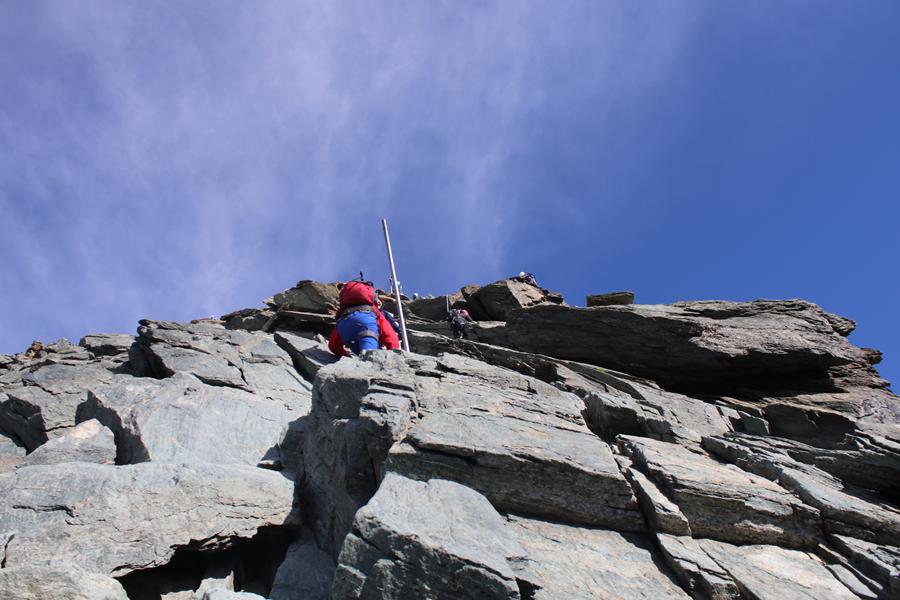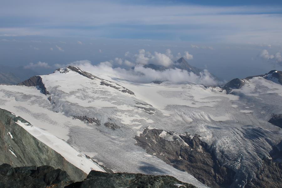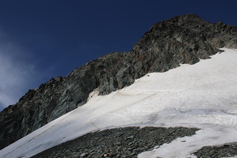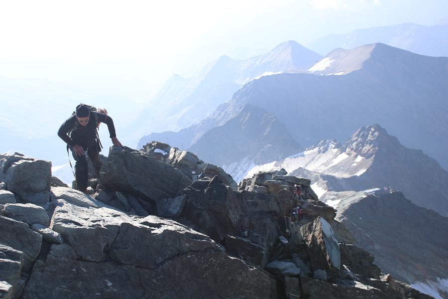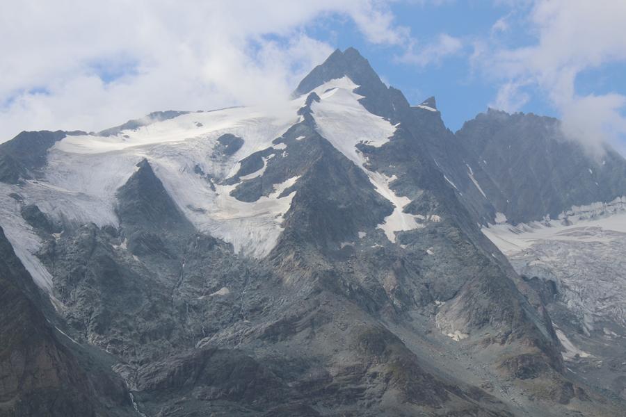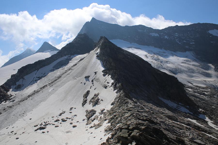 Bodo fühlt sich ganz gut. Schneefrei geht es erstmal über die Steinplatten, die Spur in Stein und Fels hebt sich deutlich ab. Mit leichtem Gepäck ist fast schon ungewohnt. Ein Rot Weißer Windsack weht Waagrecht der Wind kommt aus Norden, wählen eine Route von vielen aber relativ direkt zum Beginn des wenig steilen Schneefeld. 20 Minuten nach Start werden die Steigeisen mittlerer Weile geübt angelegt. Insgesamt klappt das recht gut, wobei es bei Bodo etwas komplizierter von statten geht. Schnell wird es im Bahnhof steiler. Die Spuren im Schnee sind deutlich ausgeprägt, wieviel Menschen sind es Täglich die ihr können unter Beweis stellen. Marco geht gleichmäßig wir haben keine Eile, die dünne Luft zeigt dem Körper eh die Grenzen. Der Schnee ist durch die Kalte Nacht Hart die Eisen greifen ein jeder Schritt ist hörbar. Wie vereinbart verzichten wir auf ein Seil. Marco Bodo benützt die Stöcke von Humprey Marco die eigenen, während wir mit dem Pickel Handtieren. Der Schnee endet am Dunklen Fels, der Gipfel liegt verdeckt, mehrere Spuren vereinen sich, keine Serpentinen das Gelände ist kein Sturzgelände ein Seil ist wahrlich nicht nötig, versetzt bewegen sich die Gruppen zum Einstieg geschätzt 1 Km von der Hütte, die Sonne könnte der Winner werden. Wir nehmen uns die Zeit, laut Wetterbericht könnte es am zum Spät Nachmittag zu Gewitter kommen. Relativ Zeitig unter einer Stunde legen wir im Stehen die Steigeisen ab. 2 Routen mit Dicken Hanfseilen sind gesichert. Die Stöcke Pickel und Steigeisen bleiben zurück an geeigneter Stelle hänge ich die Eisen an den Pickel der im Schnee steckt. Marco wählt die Route links, Humprey startet, ein Vater mit dem ca. 15-jährigen Sohn folgt am langen Seil, nur zögerlich was die beiden da abliefern, schaut weniger gut aus. Marco rät ab, da ein Stück bis zum Seil vereist ist. Warten Geduldig. Schleier Wolken zieren nun den Himmel. An guten Tritten fehlt es nicht das Tau ist natürlich absolut Hilfreich. Alina und Bodo erhalten den Vortritt, Bodo sichert sich mit einem Prusik von mir während Alina das Klettersteig Set einsetzt, die beiden kommen gut voran. Übergang in einen breiten Kamin hier wird es etwas kniffelig, ein Bergführer der links eingestiegen ist sichert seine 4 Kunden an einem Kurz Seil, steigen völlig unbedarft auf. Während Alina noch überlegt rate ich ihr, wenn es kritisch ist nicht weiterzugehen, der Aufstieg ist Technisch nicht schwierig, es Bedarf einer Überwindung. Folge den Voraus Steigenden, um den beiden dann ein Zeichen zu geben. Ja es waren zwei Schritte, locker geht es nun weiter, die Stelle wo es am Grat mündet ist ein Gelbes Schild, es gibt also eine zweite Route. Es scheint die Gruppe macht den Weg frei, nütze die Gunst schließe auf, die ersten im Abstieg begegnen, es kommt ins Stocken, an denn meisten Stellen gibt es eine Alternative. Schwierigkeit bis II. Brüchig die Südflanke mit Tiefenblick. Der Grat gut vom Schutt befreit wirkt sehr Stabil, eine Garantie gibt es nicht. Selten Kurze Gehstellen, vor dem Grat des Glocknerleitl die Schlüsselstelle hier staut es sich, wechselt die Gruppe in die Flanke der Südseite unter dem 29 m tieferen Kleinglockner, nur an wenigen Stellen ist Vorsicht geboten, auch die Hände werden zu Hilfe genommen. Welch Überraschung es steigt rechts auf eine Plattige Fläche, kurz danach stehen wir vor der Glocknerscharte, hier treffen Ab auf Aufsteigende resultierend ein Stau. Marco und Humprey sind quasi hinter mir, welch genialer Schachzug.
