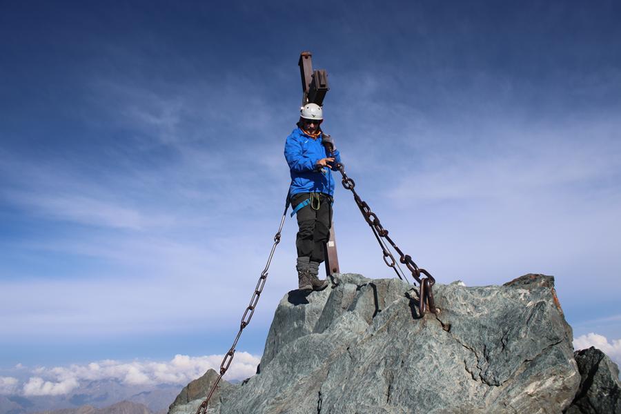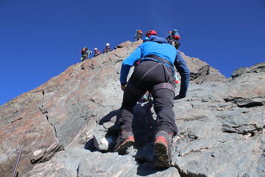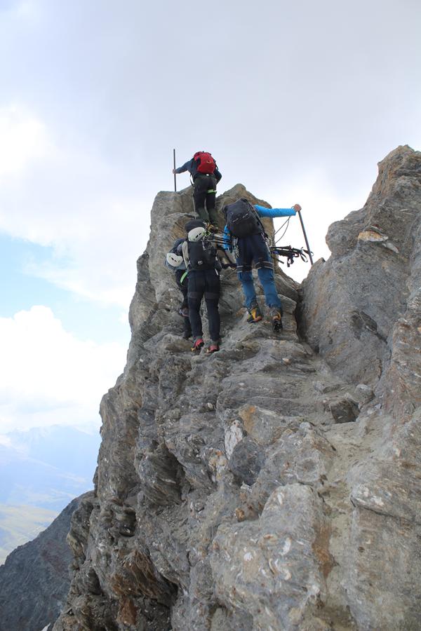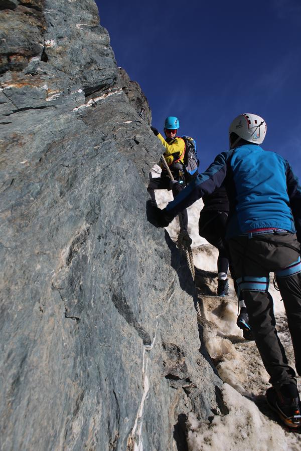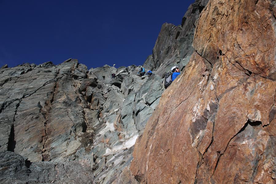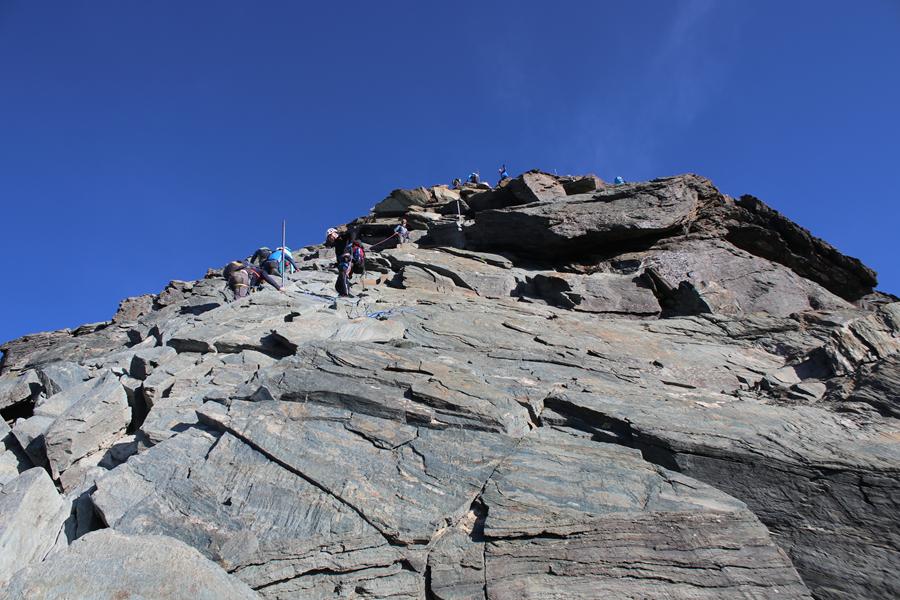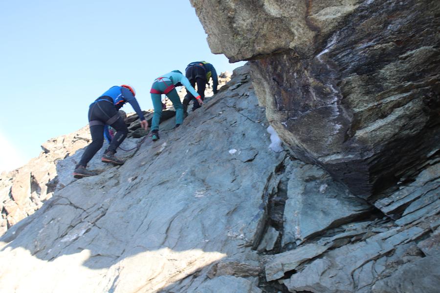 Bodo fühlt sich ganz gut. Schneefrei geht es erstmal über die Steinplatten, die Spur in Stein und Fels hebt sich deutlich ab. Mit leichtem Gepäck ist fast schon ungewohnt. Ein Rot Weißer Windsack weht Waagrecht der Wind kommt aus Norden, wählen eine Route von vielen aber relativ direkt zum Beginn des wenig steilen Schneefeld. 20 Minuten nach Start werden die Steigeisen mittlerer Weile geübt angelegt. Insgesamt klappt das recht gut, wobei es bei Bodo etwas komplizierter von statten geht. Schnell wird es im Bahnhof steiler. Die Spuren im Schnee sind deutlich ausgeprägt, wieviel Menschen sind es Täglich die ihr können unter Beweis stellen. Marco geht gleichmäßig wir haben keine Eile, die dünne Luft zeigt dem Körper eh die Grenzen. Der Schnee ist durch die Kalte Nacht Hart die Eisen greifen ein jeder Schritt ist hörbar. Wie vereinbart verzichten wir auf ein Seil. Marco Bodo benützt die Stöcke von Humprey Marco die eigenen, während wir mit dem Pickel Handtieren. Der Schnee endet am Dunklen Fels, der Gipfel liegt verdeckt, mehrere Spuren vereinen sich, keine Serpentinen das Gelände ist kein Sturzgelände ein Seil ist wahrlich nicht nötig, versetzt bewegen sich die Gruppen zum Einstieg geschätzt 1 Km von der Hütte, die Sonne könnte der Winner werden. Wir nehmen uns die Zeit, laut Wetterbericht könnte es am zum Spät Nachmittag zu Gewitter kommen. Relativ Zeitig unter einer Stunde legen wir im Stehen die Steigeisen ab. 2 Routen mit Dicken Hanfseilen sind gesichert. Die Stöcke Pickel und Steigeisen bleiben zurück an geeigneter Stelle hänge ich die Eisen an den Pickel der im Schnee steckt. Marco wählt die Route links, Humprey startet, ein Vater mit dem ca. 15-jährigen Sohn folgt am langen Seil, nur zögerlich was die beiden da abliefern, schaut weniger gut aus. Marco rät ab, da ein Stück bis zum Seil vereist ist. Warten Geduldig. Schleier Wolken zieren nun den Himmel. An guten Tritten fehlt es nicht das Tau ist natürlich absolut Hilfreich. Alina und Bodo erhalten den Vortritt, Bodo sichert sich mit einem Prusik von mir während Alina das Klettersteig Set einsetzt, die beiden kommen gut voran. Übergang in einen breiten Kamin hier wird es etwas kniffelig, ein Bergführer der links eingestiegen ist sichert seine 4 Kunden an einem Kurz Seil, steigen völlig unbedarft auf. Während Alina noch überlegt rate ich ihr, wenn es kritisch ist nicht weiterzugehen, der Aufstieg ist Technisch nicht schwierig, es Bedarf einer Überwindung. Folge den Voraus Steigenden, um den beiden dann ein Zeichen zu geben. Ja es waren zwei Schritte, locker geht es nun weiter, die Stelle wo es am Grat mündet ist ein Gelbes Schild, es gibt also eine zweite Route. Es scheint die Gruppe macht den Weg frei, nütze die Gunst schließe auf, die ersten im Abstieg begegnen, es kommt ins Stocken, an denn meisten Stellen gibt es eine Alternative. Schwierigkeit bis II. Brüchig die Südflanke mit Tiefenblick. Der Grat gut vom Schutt befreit wirkt sehr Stabil, eine Garantie gibt es nicht. Selten Kurze Gehstellen, vor dem Grat des Glocknerleitl die Schlüsselstelle hier staut es sich, wechselt die Gruppe in die Flanke der Südseite unter dem 29 m tieferen Kleinglockner, nur an wenigen Stellen ist Vorsicht geboten, auch die Hände werden zu Hilfe genommen. Welch Überraschung es steigt rechts auf eine Plattige Fläche, kurz danach stehen wir vor der Glocknerscharte, hier treffen Ab auf Aufsteigende resultierend ein Stau. Marco und Humprey sind quasi hinter mir, welch genialer Schachzug.