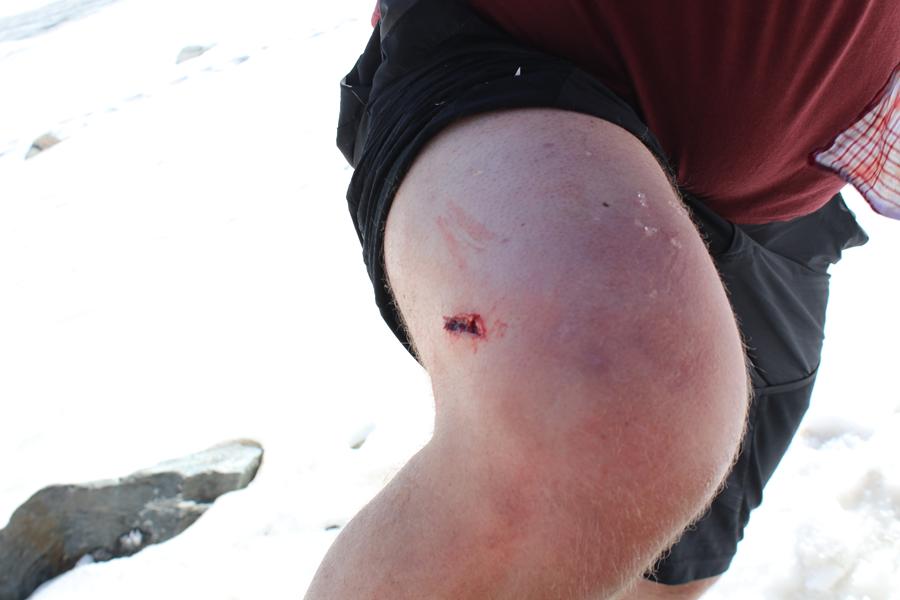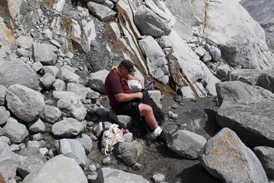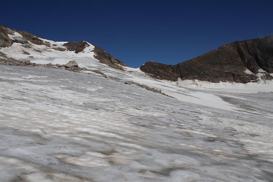 Das Paar kommt entgegen, es war ihnen nicht ganz geheuer, wobei das noch als einfach bezeichnet werden muss. Kurz unter dem Gipfel führt der Weg zum Gletscher, doch die „Gamsspitzl nehmen ich gerne mit“. Massiv das Stählerne Gipfel Kreuz, es ist 10.21 Uhr. Toller Blick nach Osten, wie mag das noch vor 50 Jahren ausgesehen haben, wohl ein Meer aus Eis. In der Ferne ist die Hütte am Hang unter dem Kesskogel 3291 m und der Bachmayrspitze 3120 m Sichtbar, davor liegt der Krimmlertörlkees den wir demnächst begehen. Auf der Südseite ist auch ein Zugang zum Gletscher, Kurzärmelige ist ein Aufenthalt unangenehm. Vor dem gegen Aufstieg zur Hütte, gilt es weit abzusteigen. Rechts in den Wolken liegt der Großvenediger. Warte bis Humprey erscheint. Eine Spur führt nach Nord zu einem Felssporn, eine weitere rechts, wohl zur Essener Rostocker Hütte. Wir müssen uns etwas nach links halten, zum Ende des Gletschers an die Felsen. Humprey folgt, mögen es 50 Meter sein bis zum Schnee, einer der beiden die vorher aus Respekt nicht zum Gipfel ging, ist in einem Bogen aufgestiegen bis der Gletscher Sichtbar wurde. Christian winkt uns vom Gipfel zu. Suche einen guten Platz im Steinbruch, zum Sitzen in den Steinen. Eine Randkluft bringt mich in die Bredouille, versinke gehörig mit einem Bein ein Stein klemmt den Schuh ein. Kurze Querung der Schnee selber ist Fest, Humprey der das beobachtete ist gewarnt. Humprey legt sich die Steigeisen an, du solltest zuerst den Gurt anlegen. Krame die schwere Ausrüstung die unten liegt aus dem Rucksack. Erstmal das Seil vorbereiten. Teile einen Apfel auf. Die Steigeisen sitzen gut an diesem leichten Schuh. Christian wählt einen ungünstigen Platz, sein Rucksack kommt ins Rutschen, welch Glück er bleibt hängen. Als er ihn holt stürzt er. Falter Hilf mir doch bitte ich benötige eine Binde, wir checken das erst gar nicht was da geschehen ist. Während Humprey einen Erste Hilfe Beutel aus dem Rucksack kramt schnappe ich mir die Kamera. Erstmal das geschehen in Bild festhalten, das schaut ja gar nicht gut aus, regelrecht aufgeschlitzt der Oberschenkel etwas über dem Knie. Es blutet noch nicht so stark, er hält sein Taschentuch auf die Schnittverletzung. Eine Rote Binde wickeln wir vereint auch über das Taschentuch. Er ist in den Eis Pickel gefallen. Durch den Schock verspürt er noch keinen Schmerz, er entscheidet wir gehen weiter. Nehmen ihn in die Seilmitte, der Rucksack ist nun leichter. Das Wetter schaut noch ganz gut aus, besser als noch gestern. Christian ist der Meinung Richtung des Felssporn zu gehen, das verneine ich, die Route ist mir klar. 11.20 Uhr starten wir. Nach 30 Meter ist das Eis erreicht, Das schaut doch ganz gut aus. Gemütlich gilt es sich an die Eisen zu gewöhnen. Humprey hat die Stöcke mit dem Pickel getauscht. Teilweise liegt noch in den Querrinnen Schnee, wobei ich nur eine Kritische Stelle Sondiere. Die Richtung ist mit dem Gletscherverlauf vage vorgegeben. Zwei Spaltenreiche Passagen erfordern etwas Zeit für um einen guten Durchstieg zu finden. Rätsle über die Route für Morgen zur Neuen Thüringer Hütte. Das Typische geeire aber es geht ja Bergab. Passieren eine größere Gletschermühle Reichlich Schmelzwasser fließt in den Rinnen. Ein Schluck Trinken tut ganz gut, das Wasser ist natürlich richtig kalt.