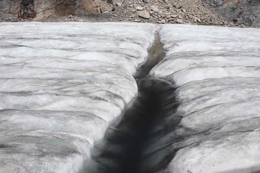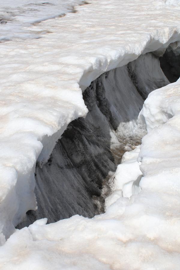 Der Wind legt sich, die Sonne heizt die kühle Luft auf das letzte Stück führt über geschliffenen Platten. Es ist 9.30 Uhr. Als das Südliche Bockkarkees erreicht wird. Ein Flacher Gletscher mit wenig Steilheit, das sollte ohne Eisen kein Problem darstellen, nach wenigen Meter würde Humprey lieber mit Metall unter Sohlen gehen. Ja der Regen am Abend hatte die Poren des Eis geschlossen. Konzentriere mich auf den Gurt und die Eisen anlegen, als ich feststelle er hatte seinen Gurt nicht angelegt, Trotz des Hinweis ist er wohl zu Bequem ihn anzulegen, das Gefällt mir nicht. Die Richtung Nördlich die Scharte liegt etwas im Osten. Deutlich Thront die Hütte über dem Rücken des Großen Burgstall. Wie es ausschaut sind wir wohl die einzigen die diese Tour heute gehen. Reichlich Steine liegen über dem Eis bei der Querung unter dem Eiswandbuhel. Reichlich Schmelzwasser fließt jetzt schon über dem Eis. Nur wenige Spalten erfordern ein geringes ausweichen, die Szenerie wechselt nur langsam, rechts begrenzt der Grad, der vom Fuscherkarkopf zum Breitkopf verläuft, über dem Eis ist es etwas Monoton, dennoch ist Wachsamkeit geboten. Nähern uns der Bockkarscharte die also solches erst kurz vor erreichen sichtbar ist, die letzten 100 Meter sind Schnee und Eisfrei. Die Steigeisen werden wohl nicht mehr benötigt. Über Geröll und ohne jegliches Spuren erreichen wird die Scharte. Der Nördliche Bockkarkees, ist bis tief unter der Scharte Abgeschmolzen, Steil die Flanken Rätsel wie es dort weitergeht, doch erstmal müssen wir durch steiles Brüchiges Gelände absteigen, stelle Humprey die Frage, ob er gewillt für das kommende ist, ja wir werden es versuchen, es findet sich ein etwas heikler Schwachpunkt durch loses Gestein und Blöcke, um die Gefahr gering zu halten steigen wir versetzt in einer Querung zum tiefsten Punkt ab. Der Untergrund recht lose überraschenderweise geht aber ganz gut. Geröll und Steine liegen über dem Eis, Quere Östlich bis an eine Stelle wo der Gletscher nicht mehr so Steil ist. Der Pickel ist nun eine Wertvolle Hilfe, das könnte für Humprey als Anfänger spannend werden. Ganz wohl ist wohl uns beiden nicht, Reiche im auf den letzten wirklich steilen Meter eine 3 Meter Bandschlinge, ganz schön heftig wie fest er daran zieht. Schaue auf die App, wir müssen Westlich. Im Osten hängen die Wolken unverändert sehr tief, in dieser Richtung geht es zur Schwarzenberg Hütte. Eine Weitläufige Fläche, wo liegt die Keilscharte die weit über 3000 Meter liegt? Kleinere Spalten die noch vom Schnee bedeckt sind erfordern Vorsicht, eine Spur wird im Schneebedeckten Hang Sichtbar, das schaut doch schonmal gut aus. Der Schnee wird tiefer in diesem Fall sind wir zu spät gestartet. Es kostet Kraft zwei Serpentinen ansonsten Relativ Geradlinig, die Sonne scheint in den Rücken, der Puls hoch. Humprey müht sich. Als ich die Anhöhe erreiche ein etwas Zweifel überkommen. Ein Blick auf die App wir sind oberhalb der Route, jetzt bimmeltes, die App sollte in solchen Fällen öfters geöffnet werden, das Problem ist der Handy Akku, eine Powerbank wohl unverzichtbar. Als Humprey dazu kommt teile ich ihm die Situation mit, wir müssen wieder absteigen, es gibt zwar eine Route über den Grad, ist wohl nicht empfehlenswert. Der Abstieg im Tiefschnee kostet auch ein wenig Kraft. Versuchen nicht ganz abzusteigen, um in Nördlicher Richtung zur Keilscharte zu wechseln. Spalten kosten Zeit, hier ohne Seil zu gehen Hi Risk, teile ihm meine Meinung mit, dass der Gurt bei einem Sturz für die Bergung schon mal das mindeste ist. Die Schuhe sind jetzt schon durchweicht. Humprey fühlt sich ausgepowert seiner Meinung nach hat er zu wenig gegessen und getrunken. Die Moral weicht, es ist 12.30 Uhr, als wir das Vorhaben abrechen, ein Schlafplatz auf der Oberwalder das kleinste Übel, es fallen lediglich die Kosten bei einer verspäteten Absage an. Ja es ist zu fortgeschrittener Stunde, wir haben vielleicht 25% der Tour bewältigt. Spaltenreich der Gletscher auch Schneebedeckt dadurch sind Spalten noch verdeckt. Die Erfahrung ein guter Helfer, wobei Humprey nicht achtet wie ich mich an den Kritischen Stellen verhalte, er versinkt zweimal zum Glück mit nur einem Fuß. Das Sondieren kostet Zeit. Eine Sehenswerte Spalte zeigt sich erst so richtig als sie überschritten ist, nach dem er darüber ist, nütze ich die Gelegenheit für ein paar Minuten einer Lehrstunde. Wie verläuft eine Spalte wo tritt sie auf, Was ist eine Randkluft, was ist eine Gletschermühle. Was ist ein Wind kolk der Klassische sehen wir wenig später unter der Bockkarscharte. Die Füße sind durch die Feuchtigkeit Kalt. Dazu ist das Tempo sehr Moderat, der Kreislauf zirkuliert zu wenig Blut. Das Kopf Kino tagt, der Treffpunkt mit Christian ist in Mooserboden unmöglich, wo treffen wir uns? Fragen über Fragen. Erreichen den Abbruch vor der Scharte etwas tiefer hier ist er weniger Steil, Schreite voran um ihm ein sicheres Gefühl zu vermitteln, er soll Quer gehen die Beine auseinander um nicht im eigenen Eisen hängen zu bleiben.