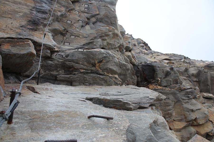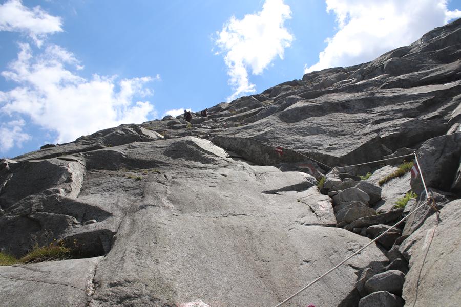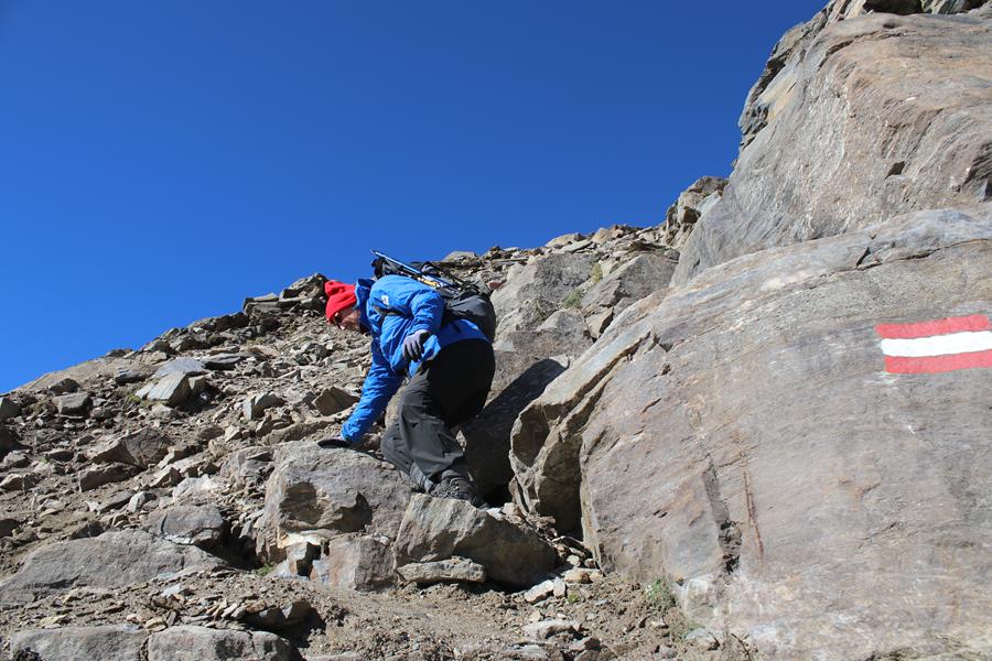Eine Pause zum inne halten tut gut, Es ist ein Stück arbeitet das lässt sich nicht nur bei den drei erkennen. Etliches Klettern ab, interessanterweise auch mit Eisen und Seilversichert. Stahlseile im Felsen als Sicherung, es quert kurz im Einstieg insgesamt sind es wenige Minuten im Durchstieg. Beobachten genüsslich das Treiben. Der Körper ist Fit nur leicht verschwitzt erholt sich sehr schnell. Ein paar Minuten später 12.15 Uhr, sind wir komplett. Ohne dass es jemand bemerkt steigt Marco ein. Kurze Frage in die Runde ob ihr bereit seid. Alina möchte den Gurt anlegen. Eine Lücke nütze ich zum Einstieg, schon nach wenigen Bewegungen ist klar, kein Problem, das Gelände bietet genügend Griffe und Tritte auch ohne Sicherungen. Teile ihnen mit es ist ein leichter Steig A-B. Es sind im Aufstieg nur ein paar Minuten für die „Schlüsselstelle“ überhole zwei Czechen einer etwas schwerfällig hat so seine liebe Not. Marco verweilt auf einem Stein sitzend die Wasserflasche am Mund. Über den Felsen fließt reichlich Wasser erlabe mich daran, es ist hier eine wenn auch schräge Fläche mit mehrheitlich Schnee, links zieht der Grat im Kampl Hoch. Marco startet nach dem eintreffen der drei, Füllen die Wasserflaschen auf der Hütte sei das Wasser Unbezahlbar. Teile Magnesium Tabletten aus nach einer kurzen Pause gehen wir weiter. Bodo wird das Meistern das schaut bisher ganz gut aus. Auch der Wetterbericht meldet erst später Gewitter. 200 Hm sind es in etwa noch, die Absteigenden wählen die direkte Route durch den Schnee, Bodo startet Humprey wählt einen Rechtsbogen zum Grat. De Schnee ist verfestigt trägt noch gut, kleinere Blöcke und Steine ragen hervor. Am Grat wird der Blick nach Süden Frei, sogar das Lucknerhaus ist sichtbar, die Erstellung der Materialseilbahn ein sicherlich Kostspieliges Unternehmen. Nach wenigen Minuten zweigt ein Abstieg über das Blaue Schartl zu denselben Hütten ab, ebenfalls schwarz markiert. Gutes Gehgelände deutlich die Weg Spur, geprägt von unendlich vielen Menschen. Auch die Salm Hütte/n sind am Ende es langen Leitertal Sichtbar. Interessant wie „einfach“ doch diese Route obwohl Stellen I-II darunter sind, an den wichtigen Stellen auch Stahlseile klar auch die Hände kommen zum Einsatz, nur selten ist es richtig Luftig. Nur wenige Menschen begegnen der erste Schwung ist durch.