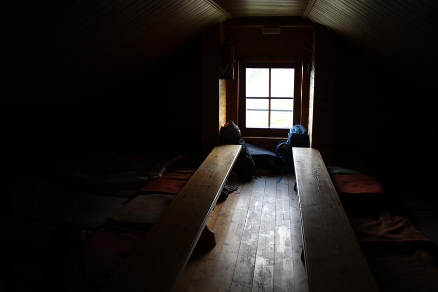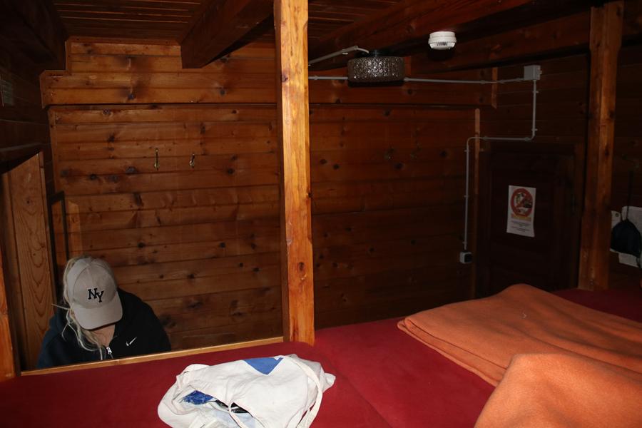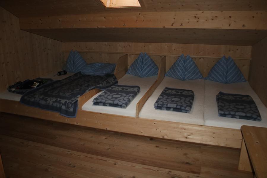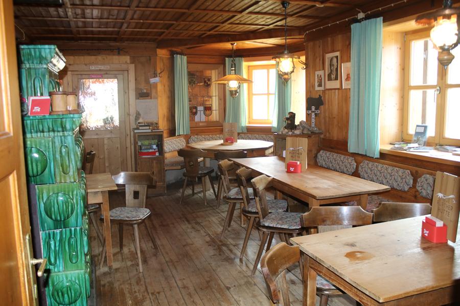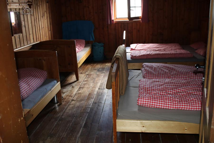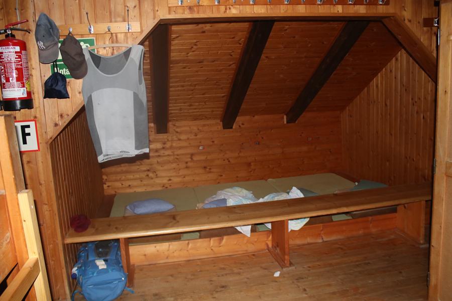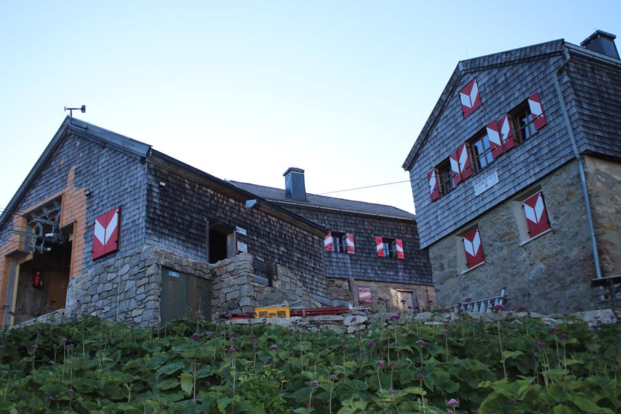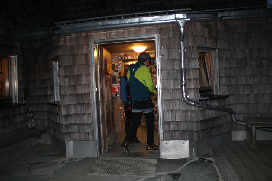 Die Technik im Gebäude steht auf einem Metallraum, die12 KW Turbine erzeugt die Energie das Summen des neuen Generators ist relativ ruhig. 2 Wasserschläuche mir verschiedenen Durchmesser führen zur Hütte. Folge diesen, später erfahre ich durch meine Neugier das der Brunnen ausgetrocknet ist, die Schläuche dienen der Notversorgung geschätzte 200 Meter. Ein echtes Provisorium, an etliche Stellen spritzt Wasser aus den Verbindungen, 14 Stunden Arbeit am gestrigen Tag die Zweckmäßigkeit ist erfüllt. Vor der Hütte treffe ich auf Humprey der dem Weg gefolgt ist. Ruhig ist es auf der Altehrwürdigen Hütte 2200 m, so zumindest der erste Eindruck. Schier unglaublich, die Hütte bietet 44 Betten und 45 Lager. Ein Schlauchboot lehnt an der Fassade, im Erdgeschoss sind die Natursteine Sichtbar, nach Oben sind es die Typischen Schindeln al Verkleidung. Verteilt auf dem Süd und Westseite des Gebäudes stehen Moderne Garnituren und Massive Bänke und Tische, der Eingang über Stufen erreichbar auf der Westseite. Viel Grün um das Haus Erstellt 1928/29. Das Ehepaar sitzt am Tisch nahe dem Eingang bei einem Stiegl Bier, begrüßen Sie Freundlich. Sie unterhalten sich mit Sebastian der wohl sehr locker drauf ist. Einige Sprüche fallen wir halten dagegen. Er scheint das ehrlich zu meinen, jedenfalls frägt er wegen der Reservierung, die Chemie stimmt schon einmal. Toll die Einrichtung der Gaststube Geschmack und Stillvoll sowie Rustikal. 21 Anmeldungen sind es heute. Als er meinen Namen hört verbindet er das mit Christian, ja das war eine unglückliche Geschichte. Vor dem Schuhraum erzählen wir die Geschehnisse um diesen Black Monday. Er berichtet das im letzten Jahr an der Ein Ausstiegstelle eine schwere Bergung stattgefunden hatte, mehrere Organisationen sogar mit Sonar waren im Einsatz, da ein Bergsteiger 16 m in die Kluft stürzte. Erhalten die Nächtigungsmarke Nr. 201 Lager 25+1 Sie verzichten auf eine Geld Forderung gegenüber Christian. Nette Geste. Das Treppenhaus knarrt bei jedem Schritt, alles ist hier auf kleinsten Raum gehalten. Der Vergleich zur Greiner Hütte ist passend. Das Lager befindet sich im oberen Stock die 2 Türe links, auf der rechten Seite. Unterteilt in 3 Abteile mit je 5 Schlafplätze, an der Außenwand mit Fenster Südseite. Hinter einer Wand befinden sich weitere 15 Schlafplätze Ein Stock tiefer die Sanitärräume hole mir dort Trinkwasser an einem Ausgussbecken, gegenüber einem kleinen Raum mit WC.