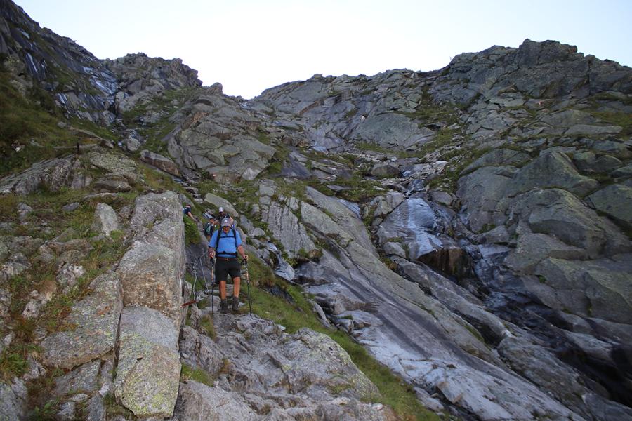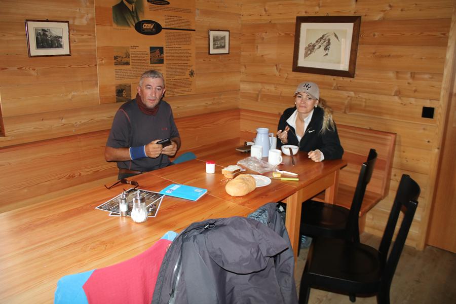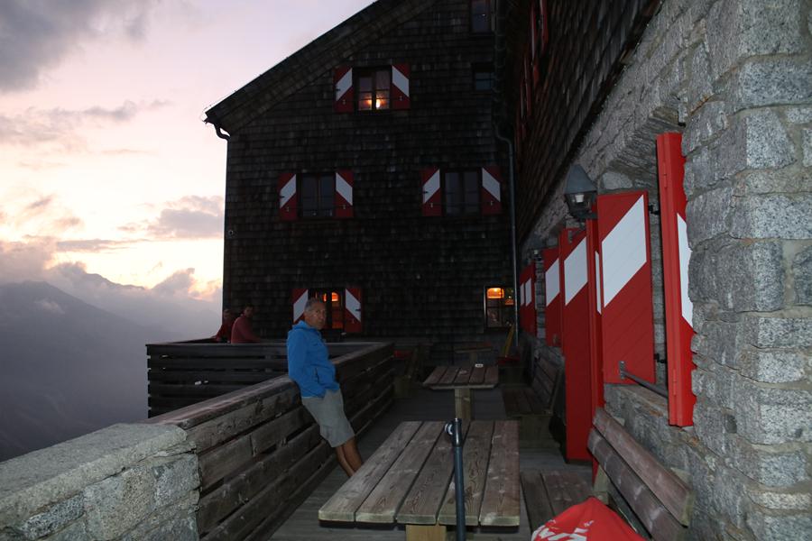 Donnerstag 14.August: Sehr früh ist es etwas unruhig. 5.45 Uhr, das Handy von Humprey gibt das Signal zum Aufstehen. Es dauert ein wenig bis wir uns aufrichten, So leise wie es nur möglich ist, wird alles im Rucksack verstaut, es dämmert schon es geht auch ohne Licht, es scheint so, dass die Luft die durch das Fenster dringt nicht so kühl ist. In der Küche brennt schon Licht schaue kurz in den Raum, Theresia ist schon aktiv. Bereit das Frühstück vor. Wir stellen die Ausrüstung im Vorraum ab. Pickel und die Schuhe holen wir aus dem Schuhraum, es ist kühl waren da die Fenster und Türen offen. Sebastian geistert fast unbemerkt durch das Haus. Frage nach, ob in der Nacht noch jemand die Hütte erreichte? Nein! Ein Kräftiger Schluck Wasser aus dem Hahn. Der Obligatorische Toilettengang. Bedanken uns für die Bewirtung, mit den besten Wünschen sagen wir Good bye. Die Kamera hält mit Bildern von uns, diesen Augenblick vor dem Eingang fest.