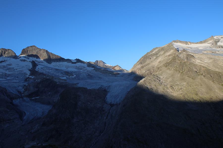 Freitag 15.August: Regen prasselt Donner ist wahrzunehmen, eine Person schließt das Fenster. Hoffentlich hatten die Nachzügler einen Überdachten Schlafplatz gefunden. Kurz später stehen die Zimmer Nachbar mit unglaublicher Rücksicht auf. Es ist selbst im Tief eingeschnitten Tal schon etwas Hell. Es ist wohl 7 Uhr, als das Handy von Humprey das Zeichen zum Aufstehen Akustisch vermittelt. Heute geht’s auf den Gletscher daher langes Textil, das Wetter als solches schaut gut, zumindest im eingeschränkten Bereich des Ködnitztal. Laut Wetterbericht steigt das Gewitterrisiko ab 13 Uhr. Nach dem Toilettengang treffen wir uns um 7.10 Uhr, im Frühstücksraum mit den Panorama Fenster. Stahlblau der Himmel mit etwas Schleierwolke. Reichlich Auswahl am Frühstücks Buffet, weit über dem Niveau einer Berg Hütte. Wurstsalat mit Frischen Wecken O-Saft und Milch. Humprey Butter Marmelade und Wecken. Die kleinen Tische sind alle ausgelastet. Ein kommen und gehen. Eine Bedienung bewerkstelligt den Service. Lade das Handy im Stüberl auch hier sitzt eine Gruppe beim Frühstück. Aktualisieren der Notizen. Studiere die Karte wegen des Aufstiegs von ca. 5 Std. Der Rucksack ist binnen weniger Minuten gepackt. Zähne Putzen die Bürste und Zahnpasta findet sich in der Außen Tasche. Ein kräftiger Schluck Wasser am Morgen ist kein Fehler. Schnappe den Rucksack um ihn auf der Terrasse abzulegen. Es ist 8 Uhr, wer sitzt denn da auf der Feuchten Natur Holzbank, Alina und Bodo. Schwitzend aber Hellwach von einem 50 Min. Aufstieg, übernachtet hatten sie am Lift Gebäude des Materiallift. Bodo fühlt sich gut, ihm kommt die Schlüsselrolle zu. Marco trinkt laut den beiden einen Kaffee. Humprey ist schon Start klar, Schuhe anziehen und den Pickel am Rucksack sichern. Allgemeine Aufbruchstimmung der Hütten Gäste. Die Alpenverein Aktiv App wegen der Aufzeichnung starten. Während ich mit Marco einen Plausch abhalte starten die drei um 8. 20 Uhr, in einen spannenden Tag, das Wetter sollte bis 13 Uhr halten. Setzen die Unterhaltung während des Gehens auf dem Wanderweg 712a in einer schönen Kulisse fort. Über 1200 Hm gilt es zu bewältigen, dass Zeil als solches ist nicht sichtbar. Anfangs Links unter dem Materiallift danach lange Zeit rechts davon.