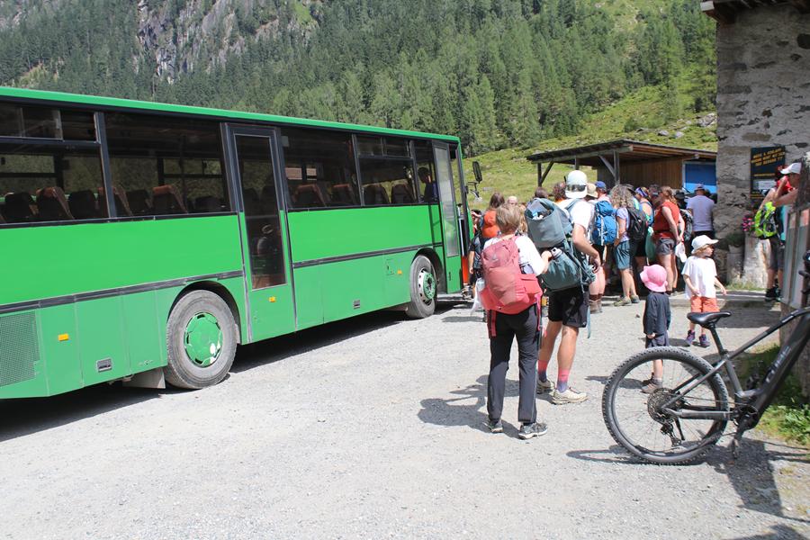 Platzieren uns im Weichen Gras, erstmal die Schuhe ablegen. Info an die Gruppe. Humprey wäscht sein schwarzes T- Shirt das vom Schweiß und dem Verlust von Salz weise Stellen aufweist. Herrlich das Wasser vermengt mit einer Tablette. Laut der Karte sind wir in etwa auf halbem Weg. Wie ist das mit einer Transport Gelegenheit, einige Fragen die sich stellen. Das Markante Habachtal kommt näher, die Sicht in die Hohen Bergen ist komplett verwehrt. Ständig passieren Radfahrer, ein Radl das wäre jetzt Cool., die Salzach wird überschritten, danach geht sogar ein Stück Bergauf. Kurz nach 12 Uhr, zweigt es endlich in das Habachtal ab, über einen Ferienhof kürzen wir ab, danach wird ein großer Parkplatz erreicht. Ein kleines Info Gebäude des Nationalparks kommt wie gerufen. Unendliche viele Fahrzeug parken. Gleich am Gebäude ist ein Brunnen, Bänke unter einer Info Wand wie geschaffen. 12.20 Uhr, frage die Junge Dame ob es hier einen Personen Transport in das Habachtal besteht, Sie antwortet mit einem klaren ja. Wann fährt das nächste Fahrzeug? 13.30 Uhr, das passt ja Super, von hier sind es bis zur Neuen Thüringer Hütte 5 Std. Logischerweise sind es mit der Fahrt dann deutlich weniger. Ist eine Reservierung nötig, das könnt ihr selber entscheiden, gut dann bitte für 2 Personen. Setzen und direkt daneben auf eine der Beiden Bänke. Schuhe Socken T-Shirt in die Sonne stellen, gleich vor der Nase die Straße dahinter ein Langgezogener Parkplatz der vom Berg begrenzt ist, teile liegen im Schatten von Bäumen. Eine Vesperpause passt Zeitlich. Der Mohnwecken wird verspeist, der Käse geht zur Neige. Ein Mülleimer findet sich. Nütze die Gunst im sitzen zu schreiben. Ständig kommen Fahrzeuge nur selten verlässt jemand das Gelände. Es gibt Probleme mit dem Parkautomat Hilfsbereit wie Sie ist kümmert Sie sich um die Besucher, wobei es nicht ihre Aufgabe ist. Sie gibt mir mein Handy zurück, nachdem es geladen ist. Mehr und mehr Menschen versammeln sich hier überwiegend sind es Tages Gäste mit Kind und Kegel, wollen die alle zur Alpenrose? Ein Grüner Bus fährt vor, Smaragd Express, ich kann es nicht glauben, hier verkehrt ein Bus. Ca. 30 Personen sind versammelt, bei 10 € sind das 300 €. Humprey begleicht beim Fahrer die Rechnung setzten uns hinten nach der Türe auf freie Plätze, der Rucksack findet einen Platz auf selber Sitzbank.