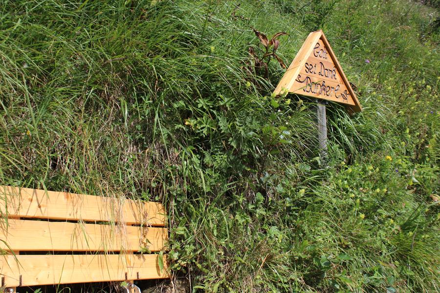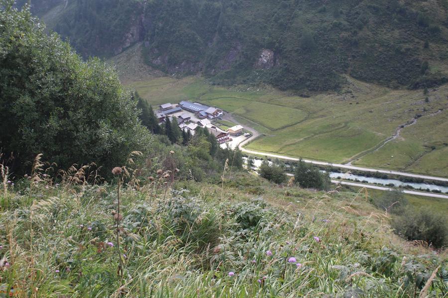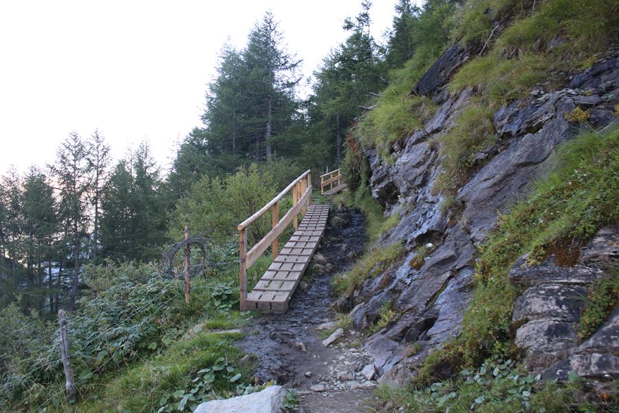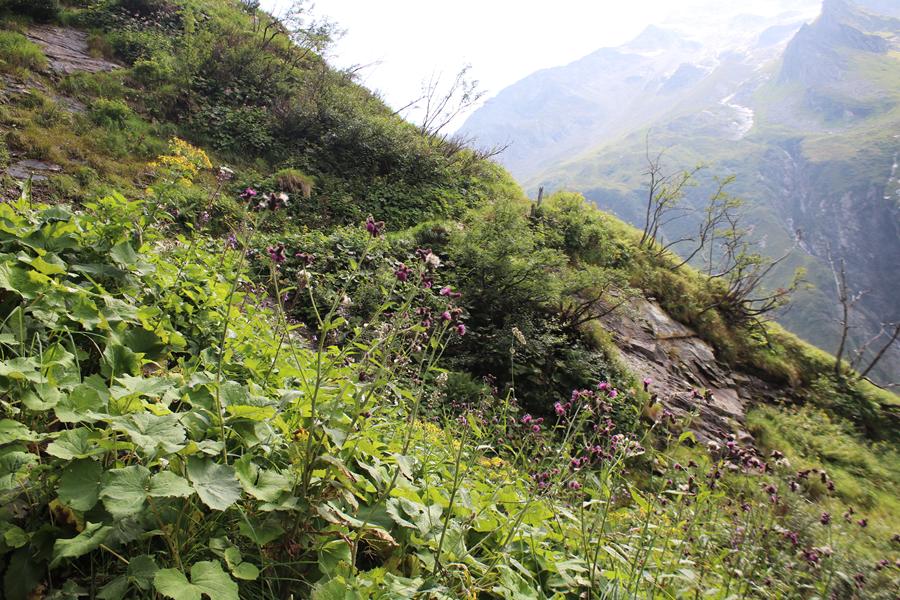 Warm ist es im Fahrzeug. Auffahrt meist im Schatten der Bäume über die Schotter Piste. Etliche Radfahrer weichen Großzügig aus, der Fahrer beherrscht seine Kupplung, das ist sofort beim Anfahren an der Schranke aufgefallen. Ein Halt am Gasthof Enzianhütte. Um 14 Uhr an der Almgasthof Alpenrose 1384 m, ein Hinweisschild erklärt das wegen dem Begriff Smaragd, eine Mure spülte 2002 Smaragde nahe der Alpenrose zu Tal, gegen eine Gebühr gibt es Sieb Schaufel und ein Eimer. Hier öffnet sich das schöne Tal. Starte ohne Wasser. Noch Trennen uns 859 m. Einige Hohe Berge begrenzen diese Tal, Schafkopf Kratzenberg Schwarzkopf, die Habachscharte sollte auch dabei sein, auch das Habachkees ist darunter. Baumbewachsen die Hänge zu beiden Seiten. Der Habach Trennt das Tal. Leicht steigt es an Folgen der Schotterstraße. 2 Personen sind vor uns. Flott der Schritt, Humprey lässt wissen das er noch Power besitzt das Tal verengt sich wie auch die Schotterstraße in einen Weg übergeht. Es steigt im Bewachsenen Hang an, Jungvieh versperrt den Weg, der Schritt passt sich dem gut zu gehenden Gelände an. Teils Tief die Wegspur, nach 35 Minuten eine Weg Tafel auf 1659 m, diese weist zwei Möglichkeiten auf, der Rote Weg 2 Std. 1 ½ Std. über den schwarzen schwereren Weg, steige ein paar Meter auf, warte auf Humprey ob es ihm Recht ist. Welch wohltat wenn der Rucksack abgelegt werden kann. Steil der Hang unglaublich bewachsen, Farne Gräser Sträucher, laut Aufzeichnung sind wir 1 Std, bei 200 Hm gelaufen. Ein wohl spannender Aufstieg steht an, das Gelände lässt keinen anderen Schluss zu. Ein älteres Dynamischer Ehepaar zieht vorbei. Die Route lässt sich gut verfolgen. Vor einer auffällig Dunklen Wand, geht es unterhalb Rechts, reichlich hohe Pflanzen des Wilden Wuchs. Nach der Traversierung folgt eine Rampe, die Ausgesetztheit steigert sich, wenn nötig auch, Seilversichert, ein ganz besonderer Aufstieg, kleinere Bäume nehmen den Tiefenblick. Hohe Stufen nehmen die Luft, der Schweiß fließt, der Puls hämmert, die Sonne tut das übrige. Humprey geht seinen Schritt, nähere mich dem Ehepaar, echt Zäh die beiden, kurz Zeit danach erreiche ich sie, an geeigneter Stelle darf ich vorbei, er frägt mich ob es noch eine ½ Std. sei. Das glaube ich nicht, es wird wohl mehr sein. Etwas Wasser fließt an einer Braunen Felsplatte, gierig sauge ich das lauwarme Wasser auf. Eine Querung über Holzbohlen, sehr Abwechslungsreich die eingesetzte Wahl der Mittel. Nach 300 Hm, fällt das Gelände zurück. Das „Gott sei Dank Bankerl“ wird dankend für eine Pause angenommen. Es ist 15.47 Uhr. Ein wahrlicher Interessanter Aufstieg was da gewählt worden ist. Kurz später wird ein Wasserlauf überschritten, fülle die Wasserflasche um diesen ¾ Liter gleich zu Trinken.