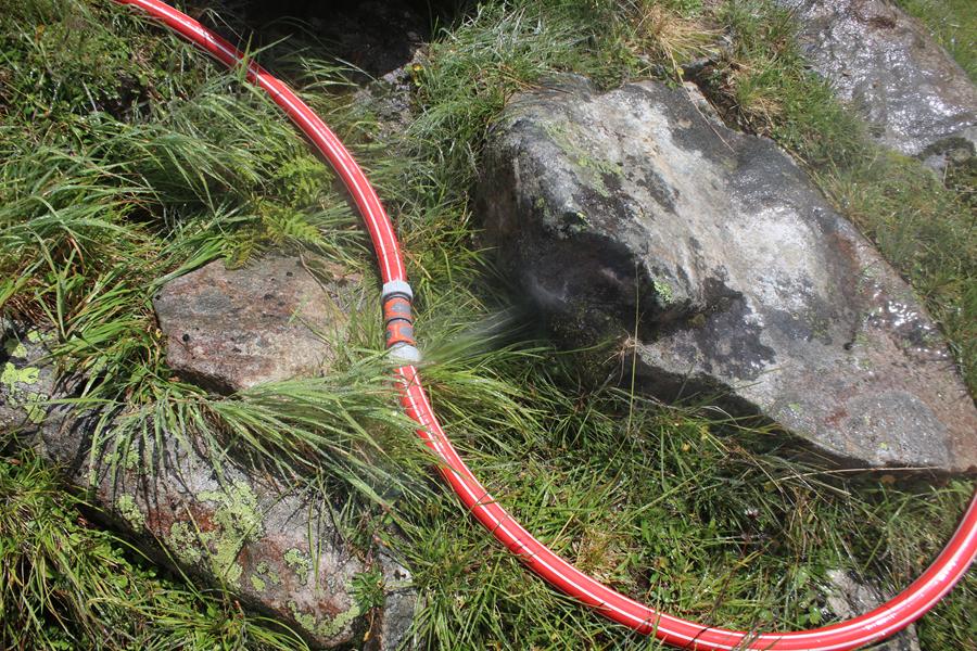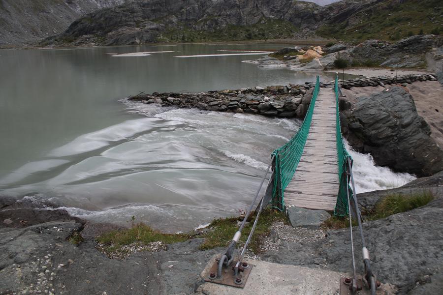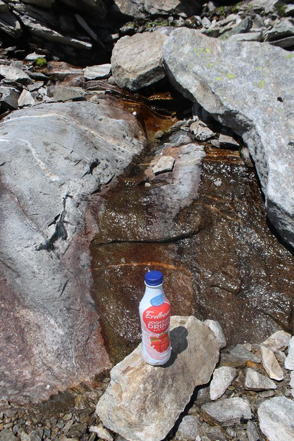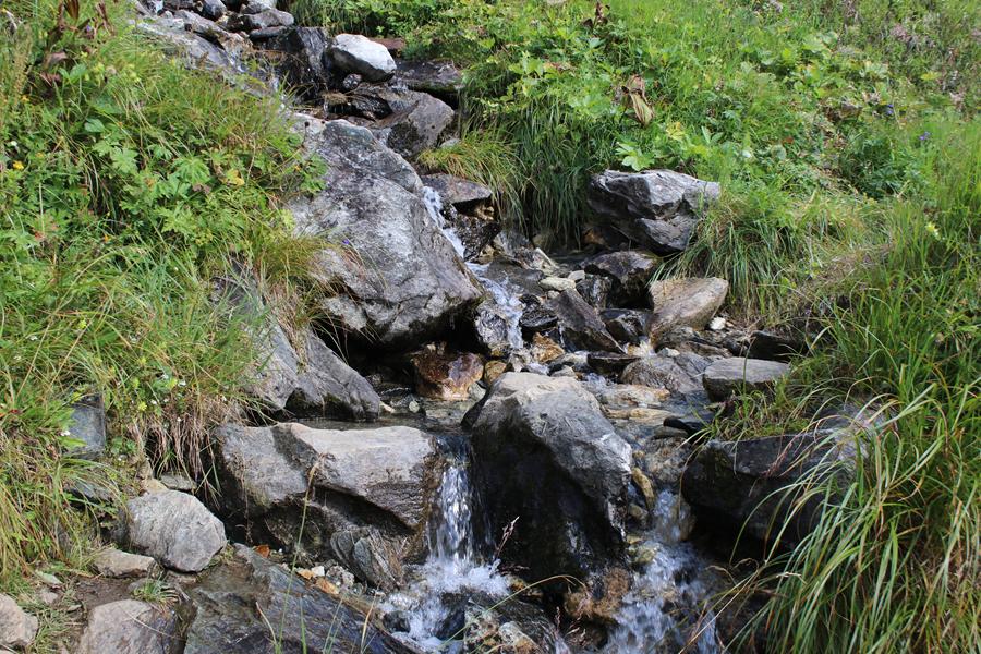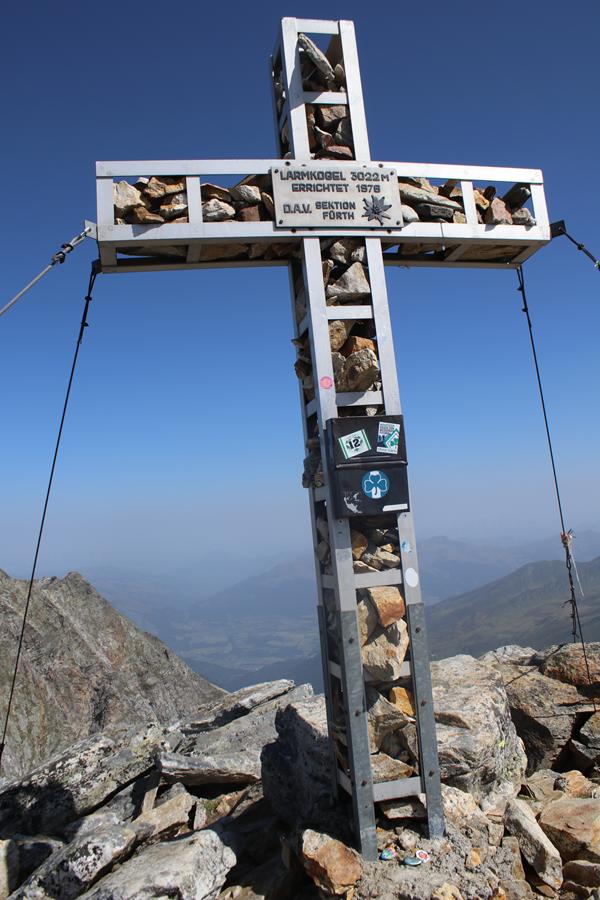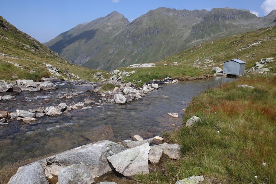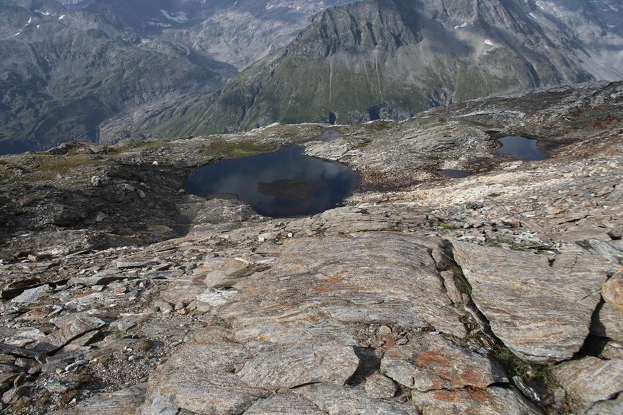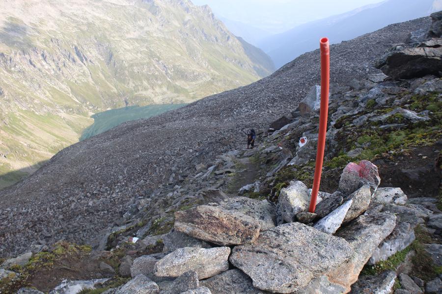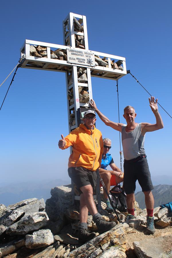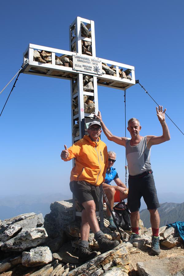 Eigentlich ist es ein Typischer Schuttberg. Relativ Gradlinig, der Aufstieg ist aber kein Grat eher ein Rücken. Das letzte Stück verläuft in der Wand. Ein Dickes Stahlseil zum Ende hin Ketten als Sicherung, scheint erst Neu Installiert worden zu sein. Ein Herr meines Alters heftet sich an die Fersen, mehrere Personen steigen ab, sicherlich starteten diese von der Fürther Hütte. Ein zahmer Aufstieg ohne Technische Finessen. Ein Metallrahmen gefüllt mit Steinen, das Gipfelbuch darf nicht fehlen. Larmkogel 3022 m, gestiftet von der Sektion Fürth. Es ist 10.52 Uhr. Links eine Fläche mit mehreren großen Steinmänner. Humprey und ein End zwanziger erreichen den Gipfel, er knipst uns unter dem Gipfelkreuz. Er besucht jedes Jahr diese Ecke, er beschreibt uns die Gipfel, er innert sich ganz gut wo einst der Gletscher endete. Die Alte Hütte wurde damals von einer Lawine regelrecht in das Tal gerissen. Genießen ein paar Minuten die Ruhe das Bisherige Traumwetter und natürlich das Panorama im Nationalpark Hohe Tauern. Flott verläuft der Abstieg mehrere Personen steigen auch mit Kindern auf. Sehr Gutes Internet. Ende ein Bild vom Glockner und Venediger in die Gruppe. Der Abstieg von der Scharte ist einfach, auch hier geht es anfangs durch Blockwerk, Teils ist der Weg mit Steinplatten ausgelegt. Die Sonne ist in Hochform. Humprey nützt diesen Tag der als sogenannter Ruhe Tag deklariert worden ist. Der Ausläufer des Hollerbachtal ist das erste dieser Tour, mit einem nur kleinen Gletscher im Talschluß, dieser speist den See. Stelle mir die Frage ob der Hütte mit einem Kleinen Wasserkraftwerk mit Elektrizität versorgt wird. Frage einen entgegenkommenden ob es auf dem Weg Wasser gibt? eher Rinnsale, recht hatte er mit Geduld füllt sich die Flasche. Hier auf 2670 m ist kein Netz mehr Verfügbar. Perfekt der Großklockner liegt genau in einer Scharte die jetzt den Blick frei gibt. Weiter geht es in Südlicher Richtung, Der See nimmt an Größe zu, wenn wundertes, wir nähern uns. So langsam gewöhnt sich der Körper an die Sonne insbesondere der Rucksack wirkt nicht mehr so schwer. Irgendwo im Hang gegenüber verläuft Morgen der Aufstieg zum Sandebentörl. Ein doch längerer Stopp an einem größeren Rinnsal, Relativ schnell ist die Flasche gefüllt. Als Humprey erscheint gibt er mir eine Tablette. Fülle den Inhalt in seine Flasche die große sperrige 1,5 l Flasche ist da nicht geeignet. Steuern genau auf den Abfluss der See zu. Der Hang ändert das aussehen Erste Pflanzen behaupten sich in diesem Gelände. Größere Bogen sind auszulaufen, wobei das Gelände nicht so steil ist. Erste Sträucher leider keine Blaubeeren. Ist das am Wasser ein Turbinenhaus? Personen halten sich am See auf, die Tische an der Hütte lassen sich auch schon erkennen. Die Pflicht geht zu Ende die Kür steht an. Zielstrebig Richtung des Wassers. Eine Alu Brücke als letztes Hindernis. Wolken ziehen auf. Zwischen den Steinen findet sich im Gras ein geeigneter Platz für eine Pause. Es ist doch 13.25 Uhr, geworden. Bis auf die Hose fallen die Kleider, etwas feucht der Untergrund. Die Sonne spiegelt sich auf dem Wasser. (Der Kratzenbergsee ist mit 24 ha Größe der größte natürliche Gebirgssee im Nationalpark Hohe Tauern und im Raum der Tauern insgesamt). Die Unterhose und das Funktionshemd werden im ca. 14°C kühlen Wasser gewaschen. Die ganze Palette des Vespers wird einverleibt. Radieschen Zwiebelröhrchen, Knobi, Chili, Berg Wurst, Salami, zum Schluss schneide ich das Rauchfleisch auf dazu das Brot von Humprey. Top Morgen besteht die Gelegenheit zum Einkauf. Das Textil trocknet so nebenbei. Eine Familie lässt sich ein paar Meter weiter nieder, stapfen ein wenig im Wasser. Zwei Wanderer kommen vom Gipfel danach wird es ruhig. Nach gut 1 Std. relaxen folgt ein kurzer Aufstieg zur Hütte, weiche vom Weg ab um das Wasserkraftwerk zu inspizieren, das abfließende Wasser wird geteilt ein Teil davon fließt in die Fassung. Über ein Dickes Stahlrohr ca. 40 cm Durchmesser fließt das Wasser in das Betonierte Gebäude, davor verjüngt sich die Leitung.