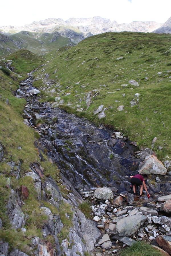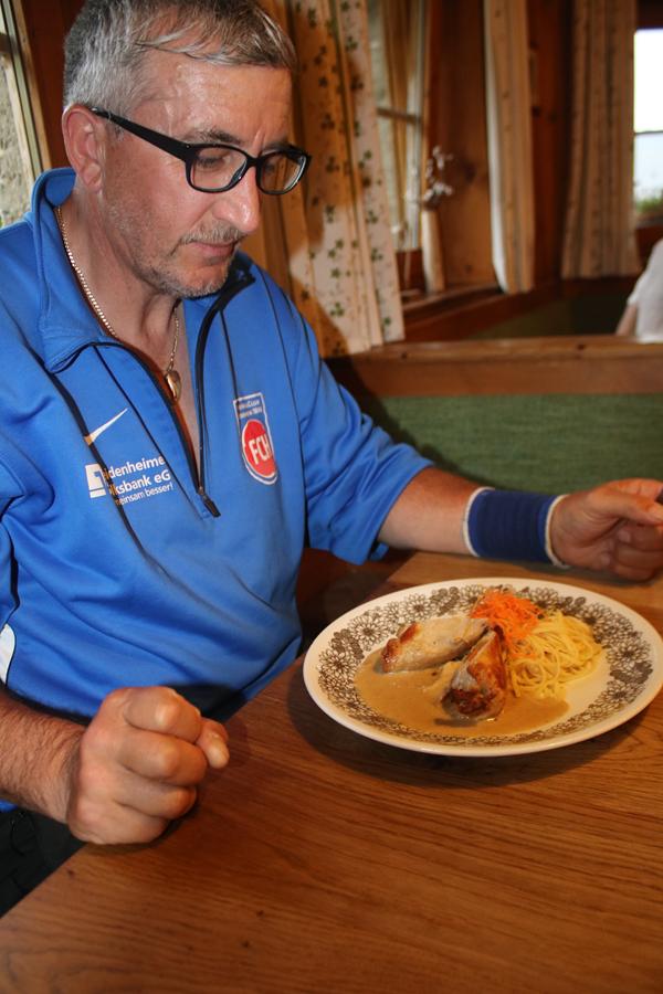 Nütze die Pause, lege mich ein bisschen ab, bis Humprey dazu kommt. Klatsch Nass kommt Humprey an, er nützt die Gelegenheit das Shirt gleich hier zu waschen. Im Zick Zack geht es nun auch in Südlicher Richtung weiter, hinter einem auffälligen Wasserfall wird die Hütte und die Bergkette die in einem Bogen da Tal begrenzt. Welch spende der Natur Links des Weges hängen Reichlich wohlschmeckende Blaubeeren an den Büschen. Bald haben wir es geschafft, kurz vor der Hütte quert es im dicht bewachsenen Gelände. Isoliert liegt die Neue Thüringer Hütte auf 2240 m. Isoliert im Wohl Lawinen sicheren Hang. Die Frau füllt ihre Wasserflasche in der Rinne wo etwas tiefer der Wasserfall stürzt. Ja noch einmal das Kostenfrei Wasser in die Flasche füllen. Der Weg ist gut zu gehen die Höhe ist bewältigt. Es ist 16.45 Uhr, ein Weidezaun schützt das Gelände vor dem Besuch des Vieh. Eine Weg Tafel, bis zur Neue Fürther Hütte sind es auf dem Weg 918 5 Std. Das vor 54 Jahren von der Sektion Oberkochen gebaute Gebäude, ist seit 2006 Eigentum des Sektionsverband Thüringen. Folge dem Schild „Sonnenterrasse“ diese liegt auf der Südseite, Die Holzvertäfelung an der Fassade sieh t relativ Neu aus. Zur Überraschung weilen doch viele Gäste unter den Rot Weißen Sonnenschirmen der Kaiser Brauerei, auf der Holzterrasse. Gute Stimmung hier, wenn wundert es bei diesem Wetter aktuell sind es 20°C. Wobei es wie auch die letzten Tage zum Abend bewölkt. Abstellen des Rucksack, zurück auf die Rückseite dort sollte der Schuhraum sein, an beiden Seiten sind Regale für die Schuhe, auch an die Pickel wurde gedacht. Nütze das Waschbecken zum reinigen für die Socken Shirt und die Unterhose, ein Seifenspender sehr nützlich. Es ist wohl die Chefin die durch die Anmeldung führt, Christian hatte sich Telefonisch abgemeldet. Mit Bedauern reagiert Sie darauf. Wollt ihr die HP? Nein! Wir würden das AV Essen wählen, ist nur bis 16.30 Uhr möglich, das wird hier seit 13 Jahren gehandhabt, steht so in den DAV Statuten. Ich biete euch das Essen aus der HP an, was gibt es? Schweinebraten, gut das wählen wir. Heute sind es 50 Gäste, da ist eine kleinere Auswahl an Speisen einfacher, wir haben nur ein kleines Team. Euer Lager ist unter dem Dach 38/39. Humprey legt gerade ab, übergebe ihm die Gäste Karte mit dem Hinweis auf das Lager. Erst einmal Platz auf der Sonnenüberflutenden Terrasse nehmen. 11 Garnituren sind Perfekt verteilt. Toller Blick. Gute Anordnung des Lagers ein Großer, Raum unter dem Dach, inmitten der Kamin. 8 Lager auf zwei Stockwerke, darum angeordnet die weiteren Schlafplätze in Boxen verschiedener Größe. Wahrlich aufgeheizt die Räumlichkeit, das T-Shirt wird an einen Kleider Bügel gehängt die Hose an die Hacken, liegen nahe der Treppe. Sogar eine Hüttennotfall Box ist montiert. Es sind noch Plätze frei, allzu viel Gäste werden wohl nicht mehr eintreffen. Mit dem Schreibzeug und Fotoapparat setze ich mich zu Humprey. Darf ich was zum Trinken bringen? Habt ihr ein Russ? Die Limo wäre separat! Sie Serviert zwei Edelweiss Weißbier, dazu eine Limonen Limonade, etwas bitter der Geschmack. Ab und zu verdeckt eine Wolken die Sonne, das wiederholt sich schon seit Tagen zum Abend. Um 18.15 wechseln wir in die Helle und Moderne Gaststube. Verputzt die Wände. Gesellen uns zu einem Paar aus Österreich. Reichlich Literatur in einem Regal. Humprey meldet Mobile Daten, eine Nachricht ist eingetroffen. Klar die Menschen Sorgen sich um Christian, auch ein guter Kommentar von Wooley. Christian kann die Salm Hütte nicht absagen. Sobald ich ein gutes Netz habe Storniere ich für ihn. Es ist 19 Uhr, das Essen wird Serviert. Kraut 1 Knödel und Schweinbraten. Bestelle einen zweiten Knödel. Das Essen ist richtig schmackhaft.