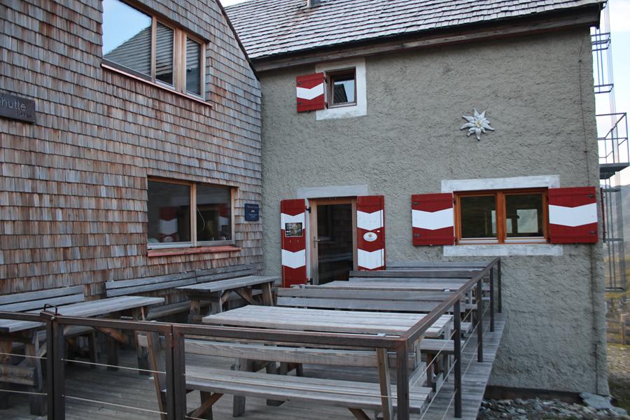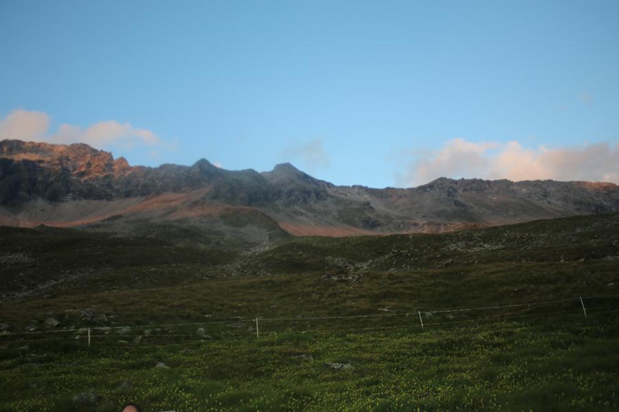 Mittwoch 13.August: Auf den Zehenspitzen verlassen die Gäste das Lager. Schaue auf die Uhr, der Kamera es ist 6.58 Uhr. Hell ist es im Raum, die Nacht war Ok. Die Textilien sind allesamt Trocken. Bomben Wetter, das beflügelt, heute wird es ein eher lockerer Touren Tag. Jetzt stelle ich fest das im Aufgang in das DG eine Toilette sich befindet. Die Nase etwas verschleimt. Eine Handvoll kühles Wasser tut dem verschlafenen Gesicht ganz gut. Das Frühstücksbuffet ist im Nebenzimmer hergerichtet. Die Chefin ist zuständig für den Service. Bestelle 1 Liter Teewasser und 2 Scheiben Brot, Sie frägt ob wir eine Kanne haben, da kann ich nur schmunzeln, Spontan die Antwort, ja im Rucksack! Sorry das habe ich jetzt kapiert, Sie braucht die Plätze im Gastraum für die Gäste. Eine klare wenn auch versteckte Antwort. Leichter Wind aus West die Temperatur 14°C, klar wir setzen uns auf die Terrasse, sind nicht die einzigen Gäste, noch ist die Sonne noch nicht über die Bergkette gestiegen. Chef und Chefin sind aus Lindau, noch kurzen gingen die Verhandlungen wegen des Pacht Vertrag zu Ende, insofern sind sie zufrieden, da die Hütte ständig Modernisiert wird. Humprey gönnt sich einen Kaffee für den Start in den Tag. Vespern das mitgebrachte ein Chili am Morgen verdrängt alle Sorgen. Bitte um einen Kugelschreiber, der von der Kürsinger erfüllt nicht den Zweck. Gute Musik läuft da in der Küche. 7.30 Uhr, die ersten Gäste starten, wie es scheint in das Tal, aber nicht den schwarzen Weg, sondern den einfachen aber längeren.