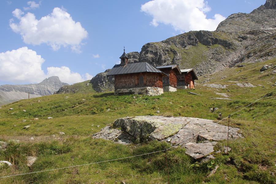 Geschafft der Untergrund wird auch Erdig. Der komplette Eispanzer des Venediger wird sichtbar. Das ist wohl die Passage die der Kollege der uns am Gipfel Fotografierte gestern erwähnte, seine unerfahrene Freundin hatte hier richtig Probleme, er sprach von einem Bergsturz. Das Sendetörl wird um 8.26 Uhr, nach 2 Std. erreicht. Der Übergang stellt sich eher als eine Fläche dar. 2 Wege mit je 3 ½ Std. stehen zur Wahl, wählen die über den Zeigerpalfen 916a beide Rot. Wolken bilden sich wie aus dem nichts. Eine weitere Weg Tafel ohne Zeitangabe. Das Gelände fällt leicht nach Süd ab, kleinere Seen prägen diese Landschaft. Die Markierungen werden weniger auch verliert sich manchmal der Weg. Tief unten lässt sich das Tauerntal erahnen. Humprey verspürt einen schmerz an den Bändern um den Knöchel. Nur wenige Steine im Hang. Der St.Pöltner Westweg wird am Zeigerpalfen auf 25ü9 m gekreuzt. Genau hier knipste ich letztes Jahr ein Bild. Noch liegt das Innergschlößtal 700 Meter tiefer. Bis um 11 Uhr sollten wir im Tal sein. Lassen wir uns überraschen wie es bei Humprey läuft. Die Wegfindung wird komplizierter, zum einen fehlen die Steine für die Farbliche Kennzeichnung, zum anderen wird dieser Weg wohl wenig begangen. Weitsicht und Gespür ist nun Hilfreich. Für Humprey ist es leichter gebe ihm die Richtung quasi vor. Leicht Süd östlich dort liegen auch der Beginn oder Ende des Weges. Von hier ist der Aufstieg über die Moräne zur Badener Hütte (2024) gut zu erkennen. Mit zunehmendem Abstieg wird der Untergrund uneben speziell durch den Pflanzenwuchs der in die Spur hängt, das ist Gift für die lädierten Bänder von Humprey, auch das kostet viel Zeit. Warte das ein oder andere Mal damit der Sicht Kontakt nicht abreißt. Mehrere Wasserläufe wären hätte das gedacht, werden gekreuzt auch dem Haar tut das kühle Nass gut. Blaubeeren am Wegesrand, eine willkommene Beschäftigung. Teils Wegloses Gelände. Innergschlöß mit dem Venediger Tauernhaus erscheint endlich im Blickfeld, mehrere Gebäude verteilt, darunter auch landwirtschaftlich. Zum Ende hin stehen vereinzelt Bäume und Sträucher. Wanderer bewegen sich in Richtung des Venediger, zu beiden Seiten des Gschlößbach der Akustisch gut Wahrnehmbar ist, verläuft eine Straße. die Weite Fläche dient der Landwirtschaft. Die Temperatur hat zugelegt, zum Glück verdeckt die ein oder andere Wolke den Himmel. Im Finalen Abstieg ist der Weg auf ein Meter breite gemäht, der Geruch des Heues schwebt in der Luft. Die Himbeeren sind auch nicht zu verachten, sehr wohlschmeckend die Früchte. Pflücke für Humprey eine Handvoll der Reifen Frucht. Es ist kurz vor 11 Uhr, die erste Etappe endet in Innergschlöß mit dem Venediger Haus. Wild der Grüne Bach. Der Mehrheitlich dem Gletscher um den Groß Venediger Entsprungen ist. 5 ½ Std. zur Neuen Fürther Hütte. 1 ¼ Std zum Matraier Tauernhaus bei 3,5 Km und einer Höhendifferenz von 190 Meter. Das wird Sportlich. Humprey ist Optimistisch das er noch zulegen kann. Meist Ältere Holzhäuser prägen das Bild, es hat den Anschein, dass die Gebäude als Ferienwohnung vermietet werden. Verkehrt es vielleicht ein Shuttle Service? Flott nun der Schritt bei hoher Temperatur über dem Asphalt und das auf über 1600 Meter Höhe, Fotogen Das Tal verengt sich bis auf wenige Meter, das Wasser zum Greifen Nah. Ein VW Bus Taxi kommt mit hoher Geschwindigkeit entgegen, der Fahrer hat es wohl Eilig. Kurz danach zieht ein Traktor einen Bunten Hänger mit Touristen. Die Sohlen kochen, spekulieren darüber das wir mit etwas Glück das bei der Rechtzeitigen Rückfahrt Mitfahrgelegenheit steht. Eine Wunderschönen Felsenkapelle links des Weges, die Neugier ungebremst, es war Absolut Lohnend ein Blick nach innen zu werfen.